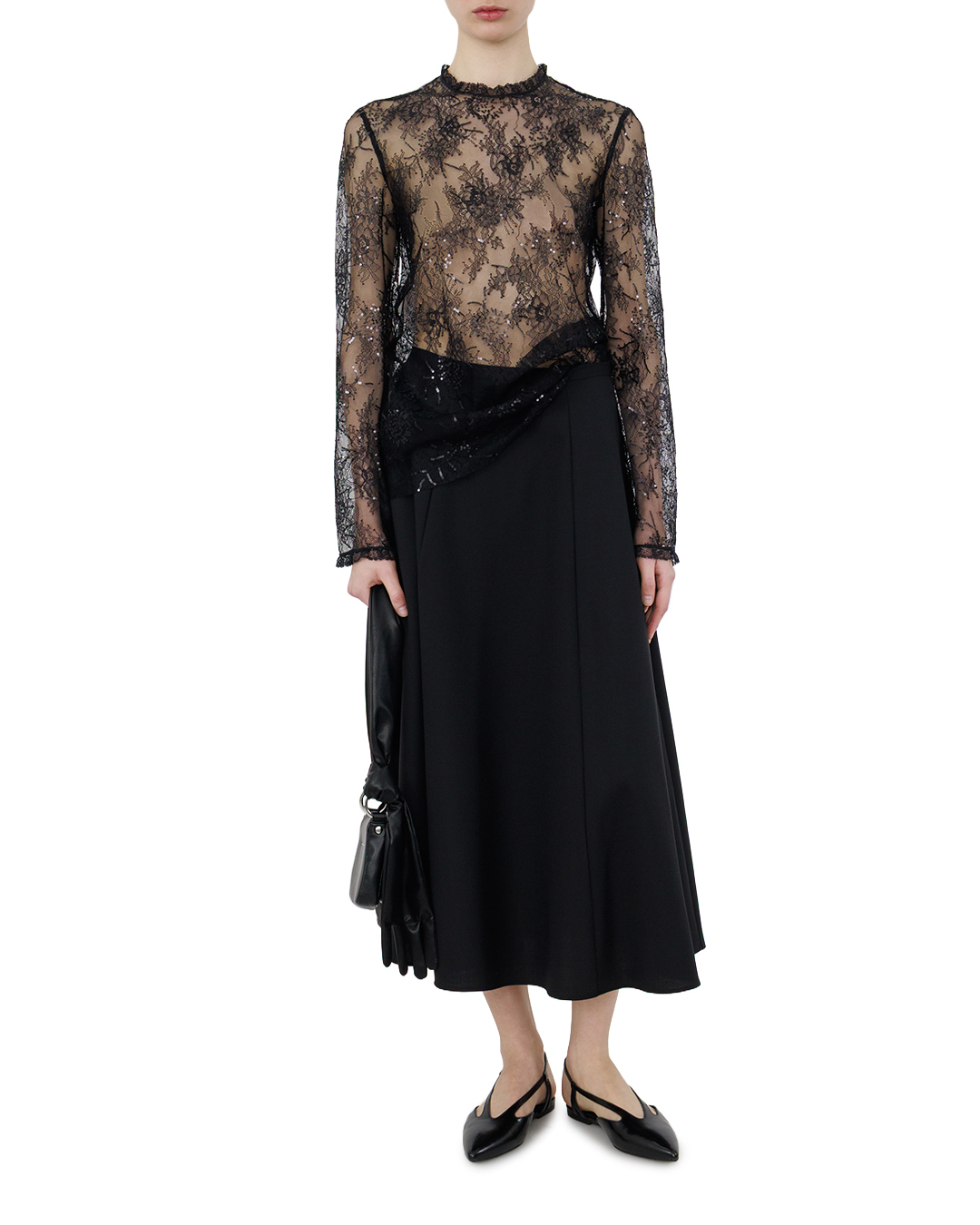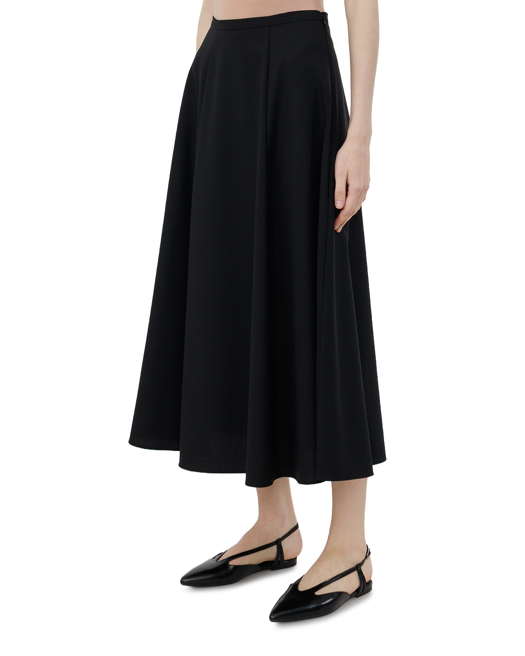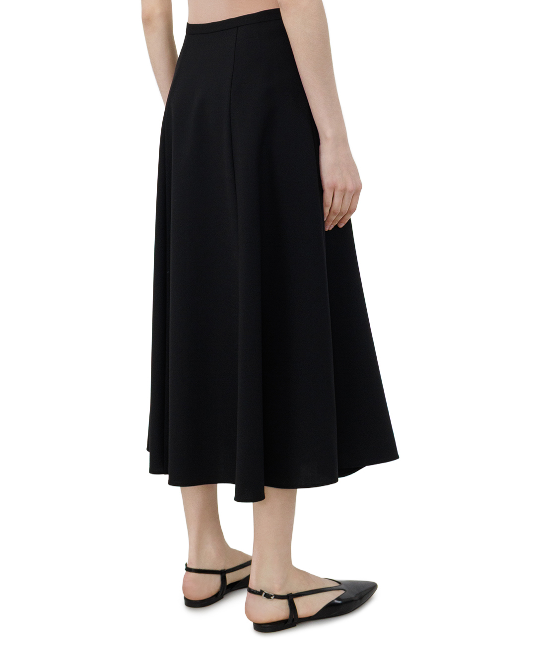 Эта чёрная юбка-миди — воплощение классической элегантности. Свободный клёш создаёт лёгкий, воздушный силуэт, подчёркивая женственность образа. Высокий пояс аккуратно фиксирует юбку на талии, формируя чёткую линию силуэта. Складки по полотну добавляют объём и динамику, при этом сохраняя лаконичность дизайна. Чистые, ровные швы подчёркивают качество исполнения, а отсутствие избыточной отделки делает модель универсальной — она легко впишется как в деловой, так и в повседневный гардероб. Глубокий чёрный цвет придаёт вещи благородство, а продуманный крой позволяет создать множество стильных комбинаций. Такая юбка станет незаменимой основой для утончённых образов.