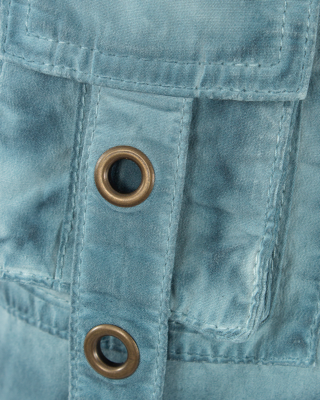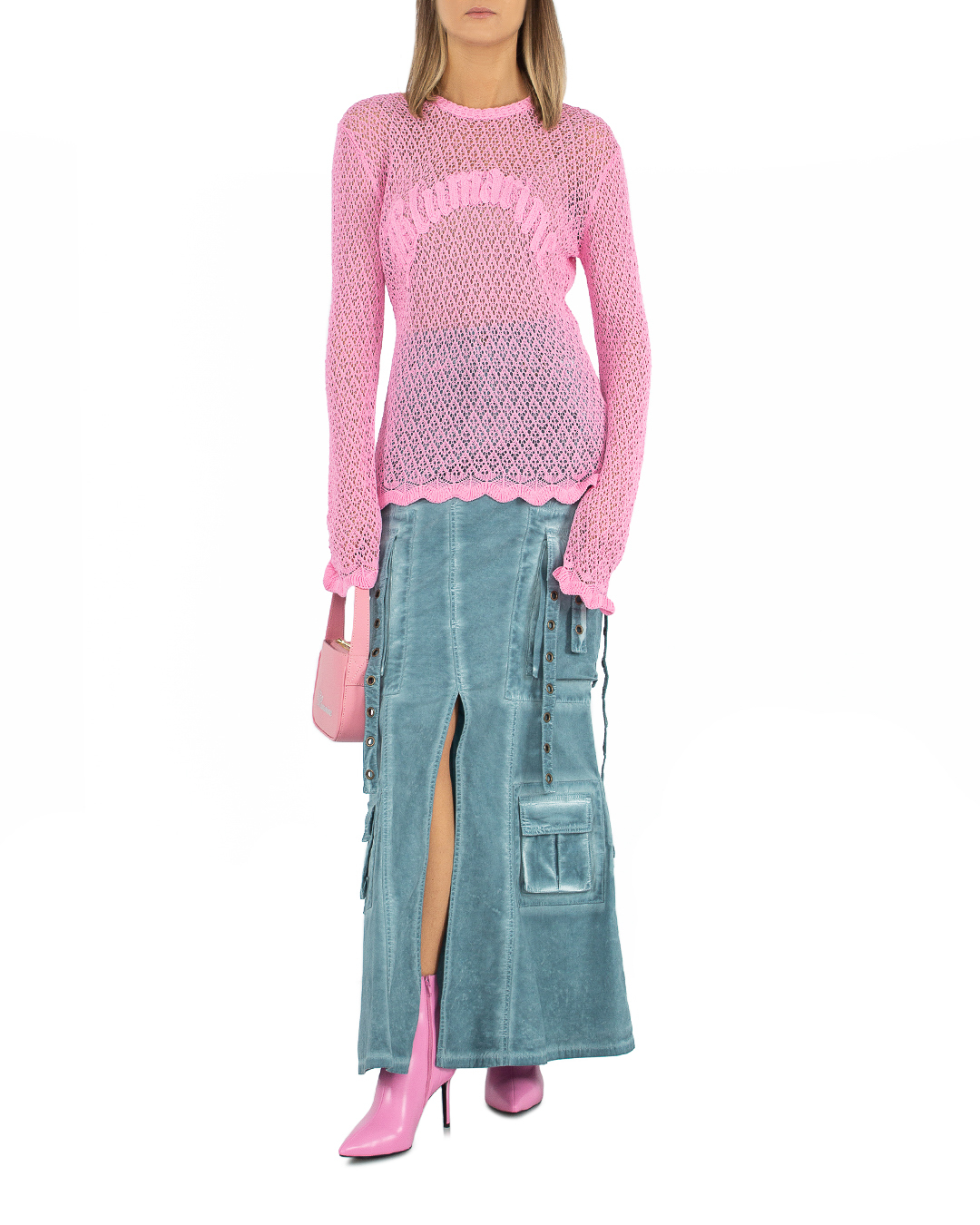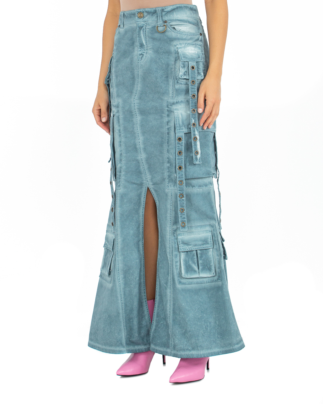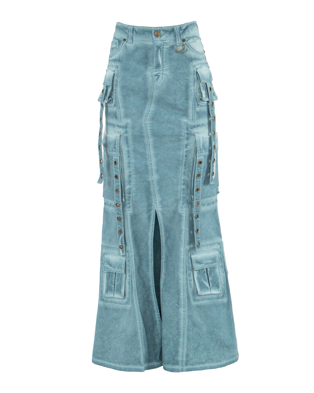 Юбка BLUMARINE из хлопка голубого оттенка с эффектом стирки. Модель длины макси с высокой посадкой на талии и застежкой на молнию и пуговицу. Юбка дополнена накладными карманами с тесьмой.