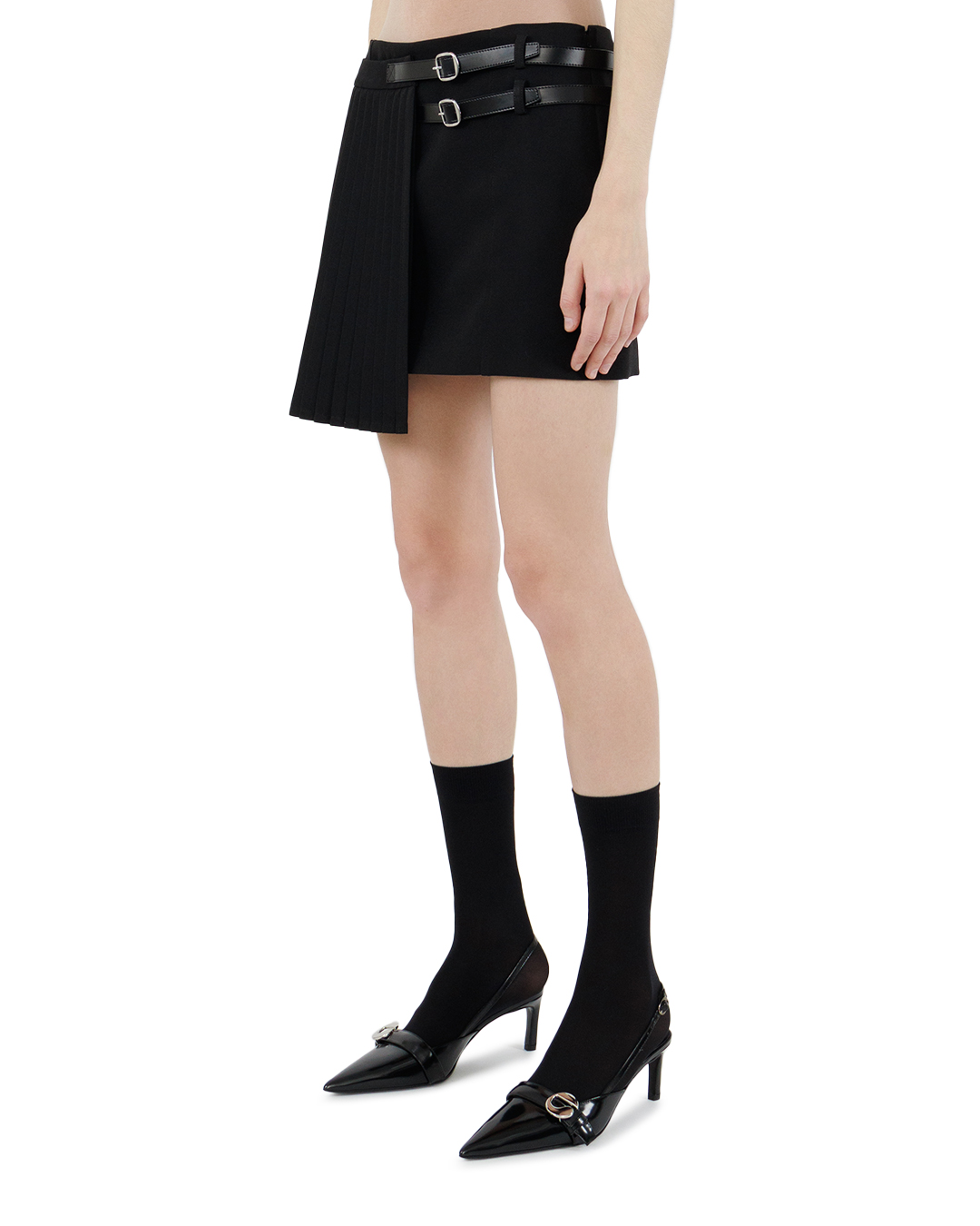Эта юбка восхитительно сочетает классический и современный стиль, превращая ее в незаменимый элемент любого гардероба. Изготовленная из высококачественной ткани глубокого черного цвета, она излучает элегантность и подчеркивает изысканность образа. Юбка имеет асимметричный крой, объединяющий строгую структуру и женственный шарм. Одна сторона украшена элегантными плиссированными складками, которые добавляют динамику и легкость движению. Плиссировка излучает легкость и создает игру световых бликов при каждом шаге. Контрастный пояс с двумя декоративными ремнями оснащен стильными пряжками, акцентируя внимание на талии и добавляя нотку современного стиля. Этот элемент приносит индивидуальность и легкий дерзкий акцент в общий лук. Юбка прекрасно сочетается с разнообразными топами, от строгих блуз до уютных свитеров, позволяя создавать как профессиональные, так и более непринужденные образы для любого случая.