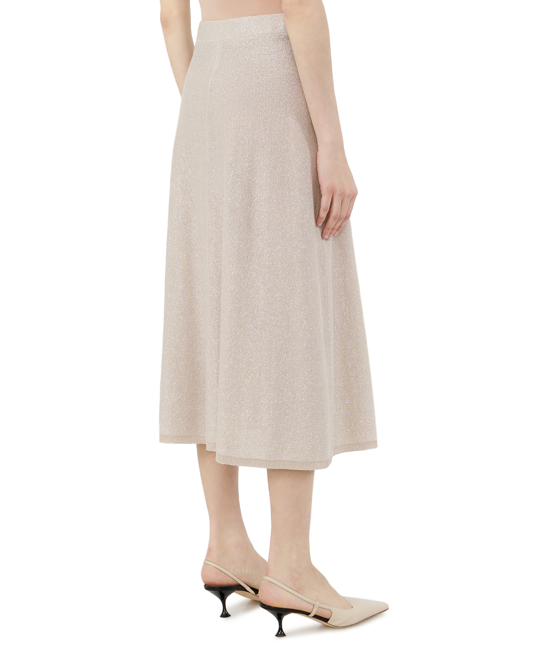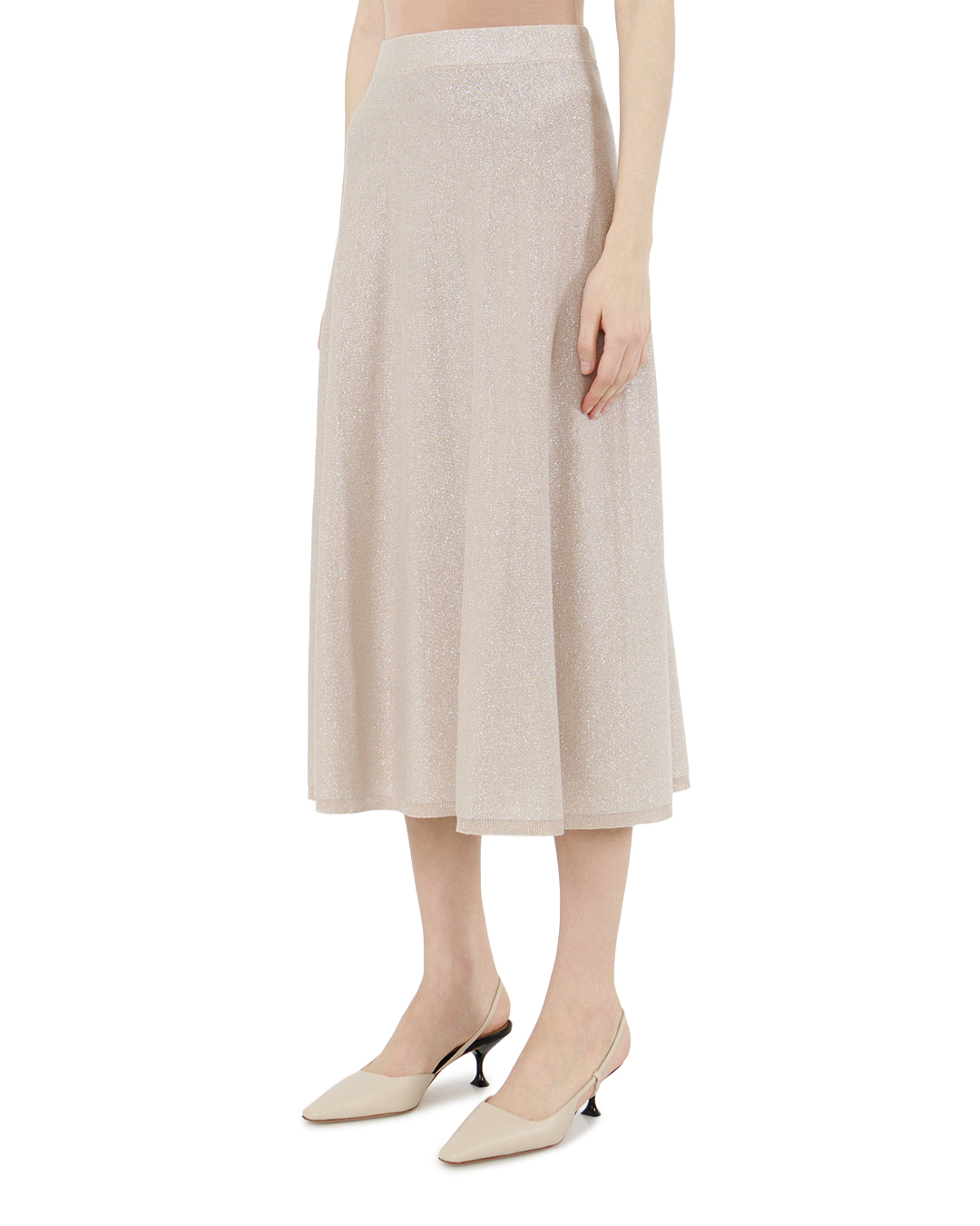Эта миди-юбка — воплощение элегантной сдержанности с лёгким намёком на гламур. Нежный бежевый оттенок, дополненный деликатной игрой люрекса, создаёт эффект «шёпота света» — ткань словно дышит и переливается при каждом движении, превращая обычную вещь в ювелирное украшение гардероба. А-силуэт модели продуман до мелочей: плавные линии мягко подчёркивают талию, постепенно расширяясь к низу, что создаёт гармоничную пропорцию и визуально вытягивает силуэт. Трикотажная фактура с лёгким рельефом добавляет глубины и тактильного интереса — юбка одновременно выглядит воздушно и структурированно. Особенность этой модели — баланс между лаконичностью и изысканностью. Отсутствие декоративных элементов позволяет сосредоточить внимание на благородной фактуре ткани. Состав (акрил, нейлон, полиэстер с добавлением люрекса) обеспечивает идеальную комбинацию комфорта и износостойкости: юбка не теряет форму, мягко облегает фигуру и при этом остаётся практичной в носке. Эта модель универсальна: она одинаково органично впишется как в повседневный образ с базовой водолазкой и лоферами, так и в более нарядный ансамбль с шёлковой блузой и лаконичными босоножками. Юбка станет ключевым элементом гардероба для тех, кто ценит сочетание утончённости и функциональности — она добавит образу лёгкую нотку роскоши, не перетягивая на себя всё внимание.