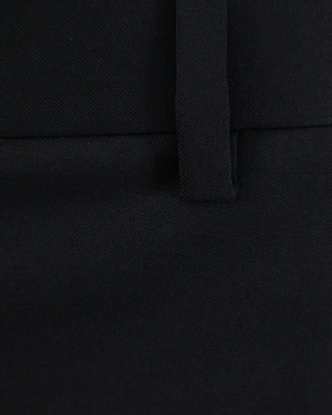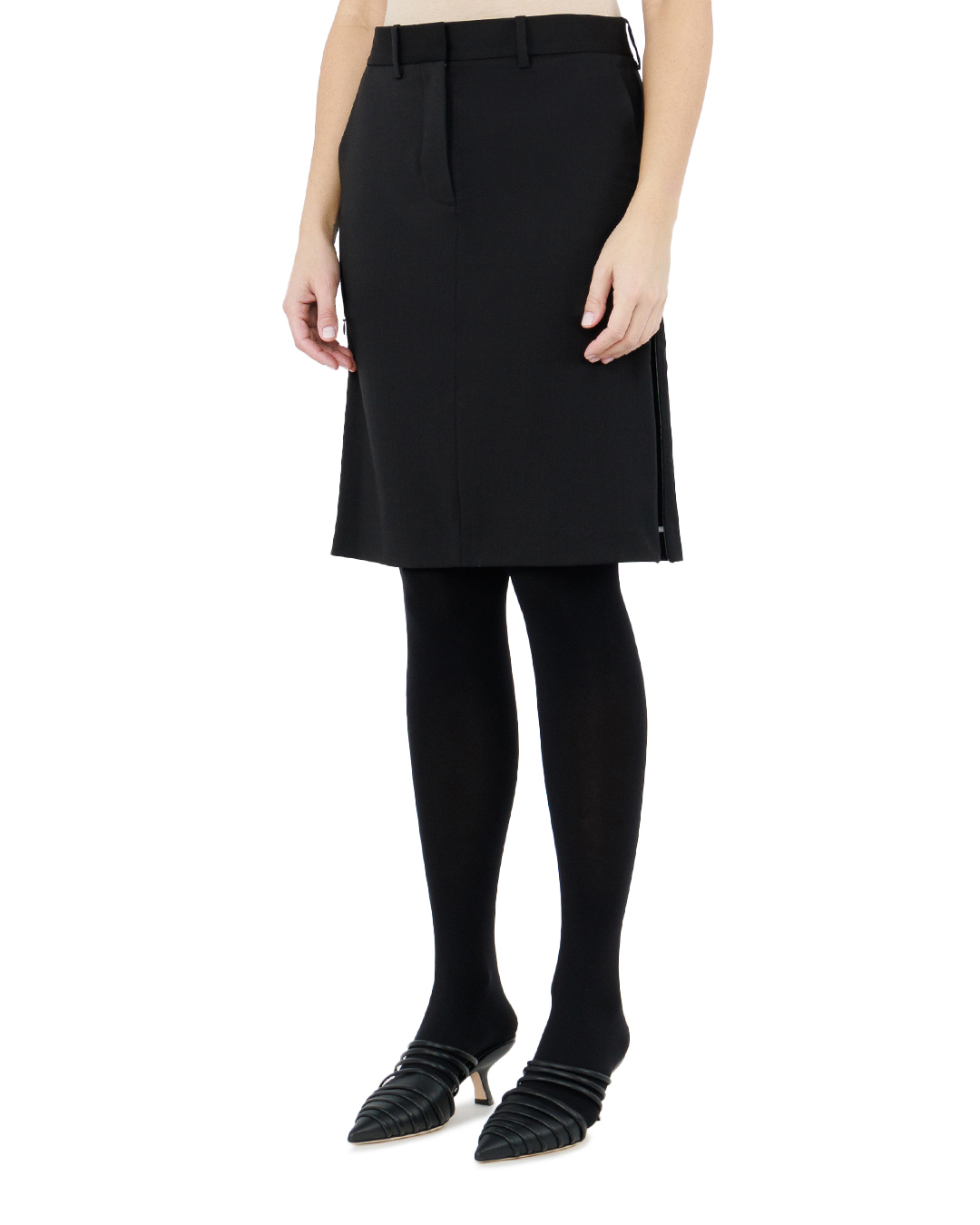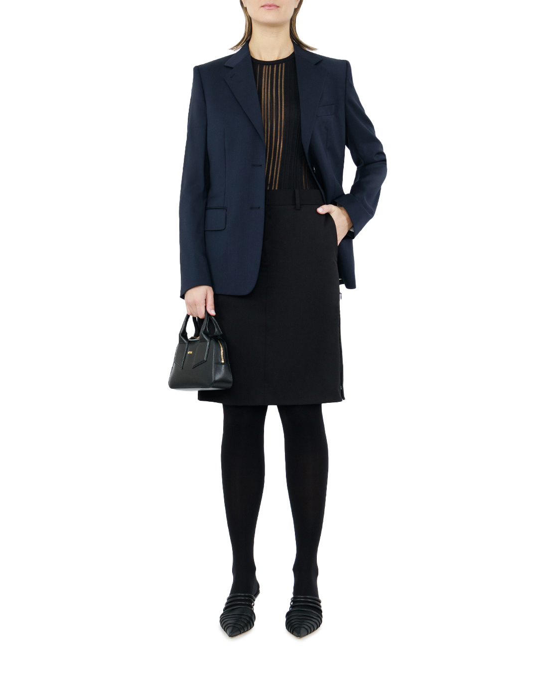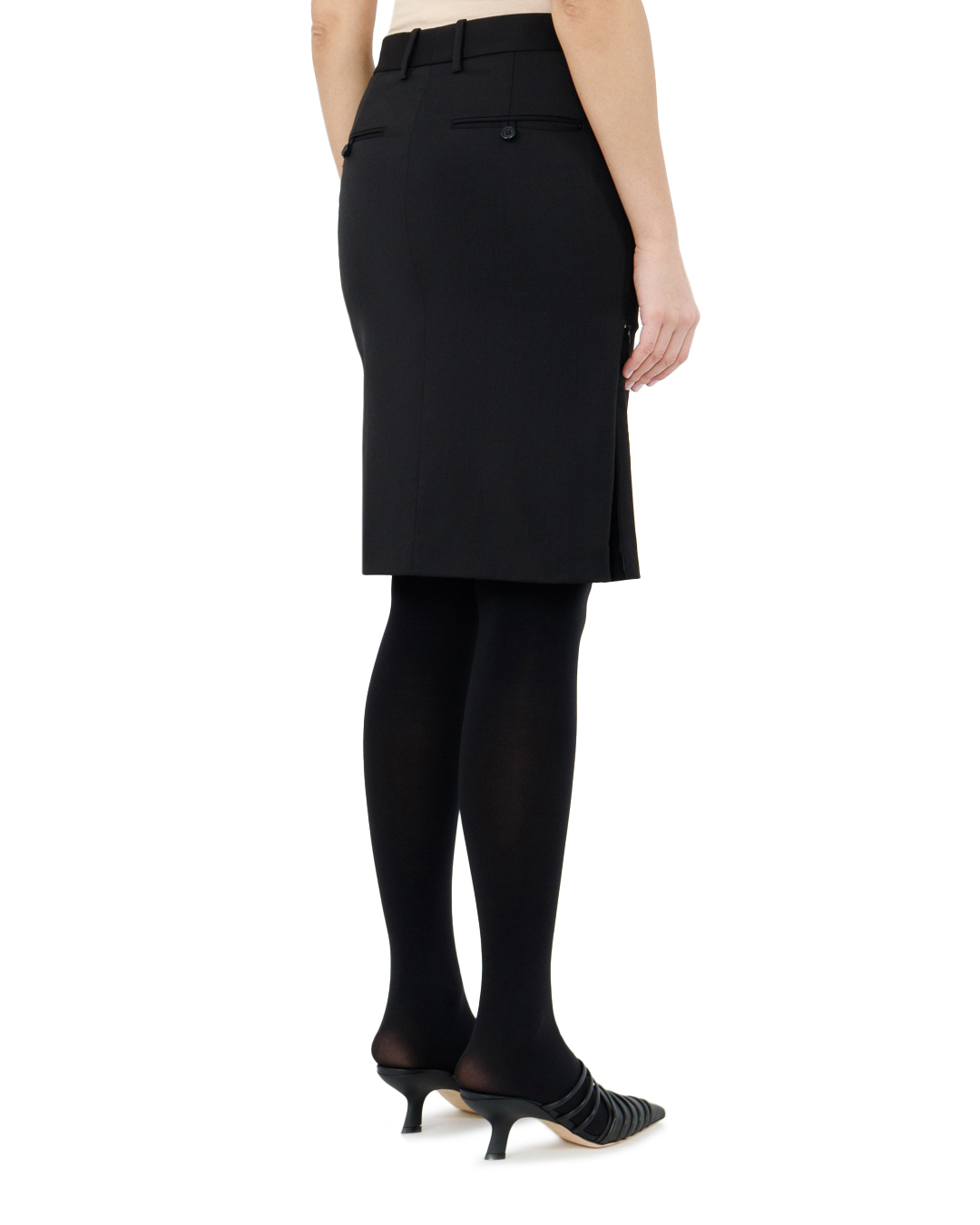 Юбка-карандаш на средней посадке из костюмной шерсти. Застежка на пуговице, крючке и молнии, два прорезных кармана спереди, два прорезных кармана на пуговицах сзади, боковые разрезы на молнии.