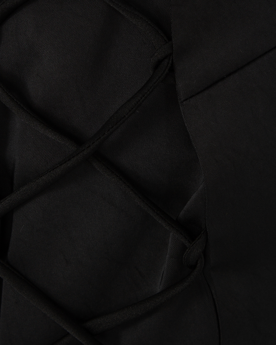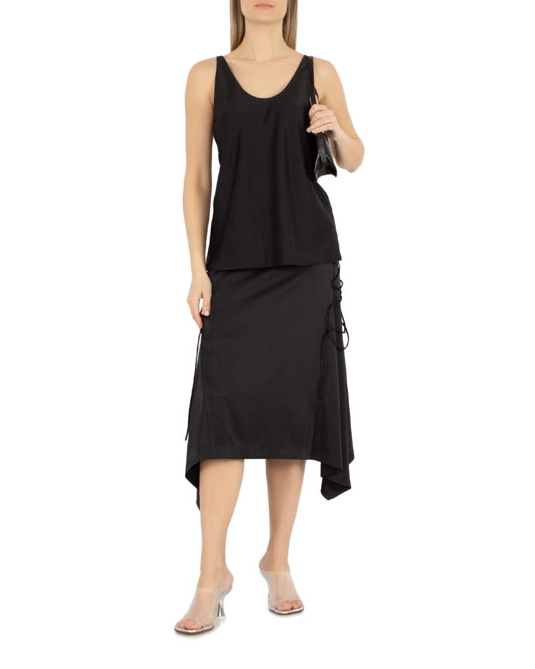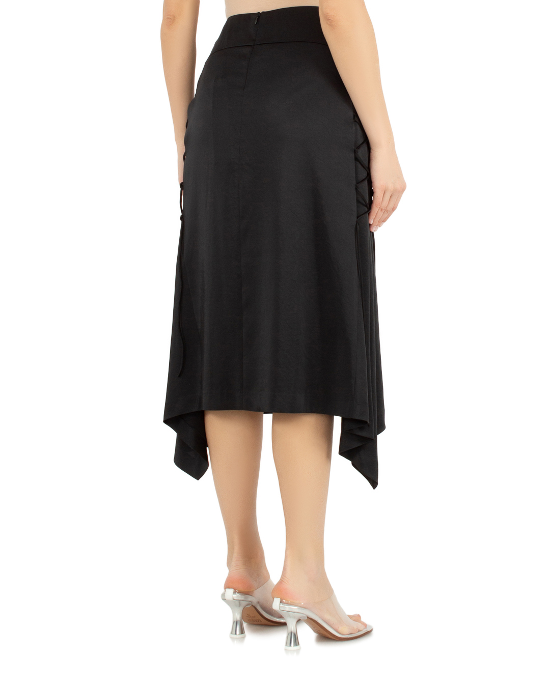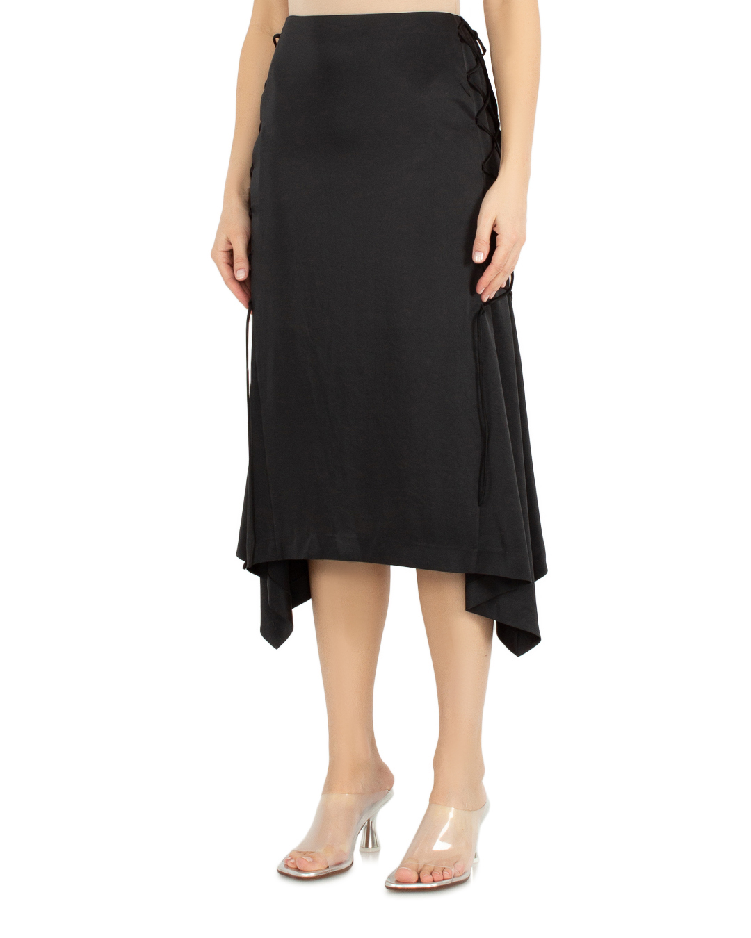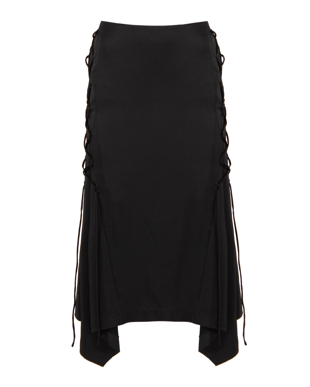 Юбка миди Juun.J из атласного материала черного цвета с корсетными завязками по бокам. Модель с высокой посадкой на талии и асимметричной линией низа.