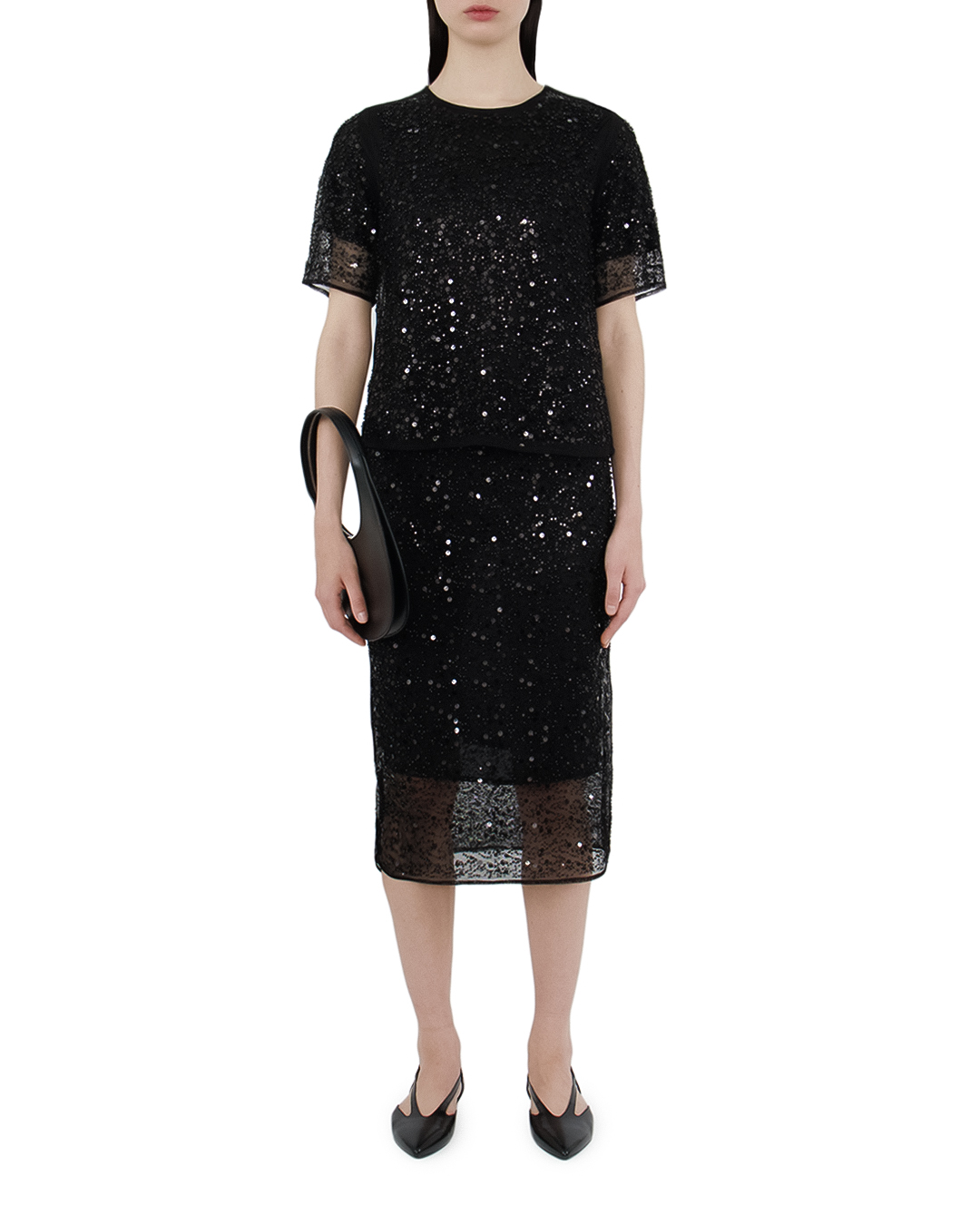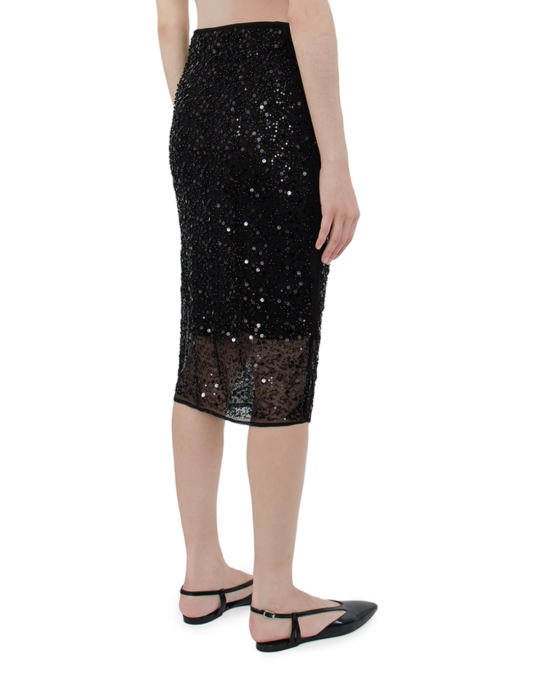 Эта юбка — настоящий символ блеска и элегантности. Выполненная в изысканном черном оттенке, она украшена обилием пайеток, создающих эффект мерцающего сияния, который привлекает внимание и добавляет образу праздника. Силуэт юбки — приталенный, что подчеркивает достоинства фигуры, создавая изящную и стройную линию. Эта модель, доходящая до колена, придаёт образу выдержанность и изысканность, идеально подходя для вечерних выходов. Эластичный пояс обеспечивает удобство в носке и идеальную посадку на талии. Внутренняя подкладка выполнена из гладкой ткани, что добавляет комфорта и предотвращает возможные раздражения. Этот предмет гардероба станет ключевым элементом для создания эффектных и запоминающихся образов, привнося щедрую дозу гламура и стиля в любой наряд. Юбка легко сочетается с лаконичными топами и изящными блузами, создавая гармоничный и модный ансамбль.
