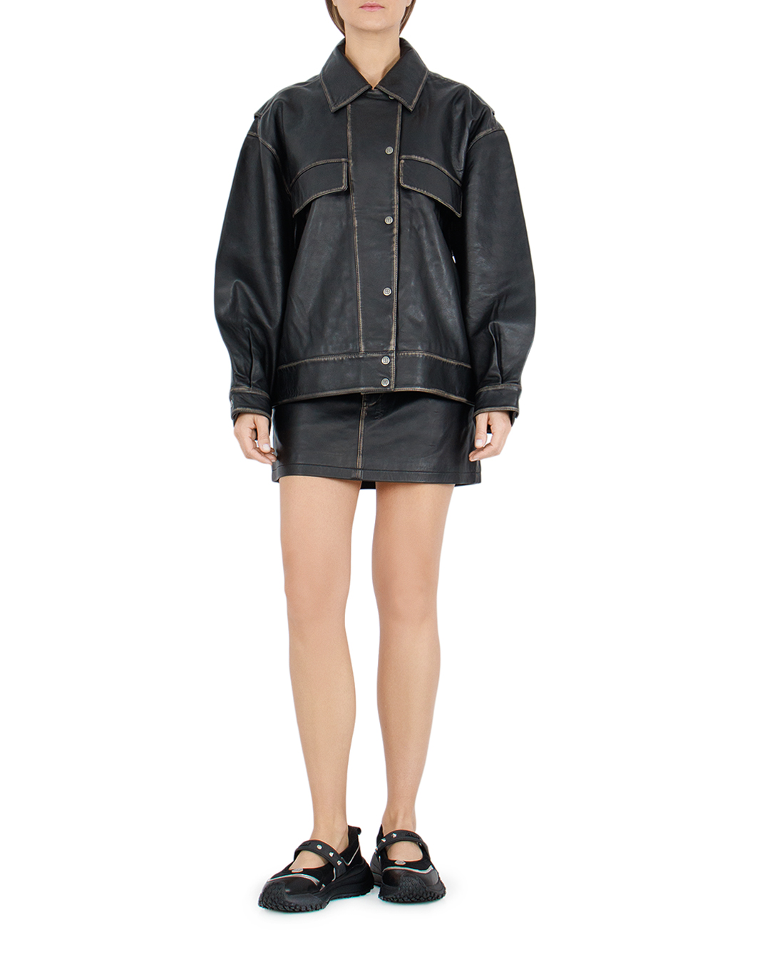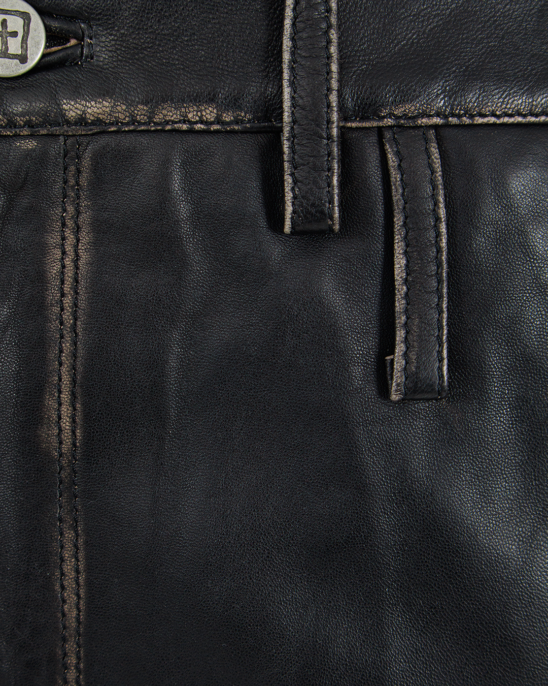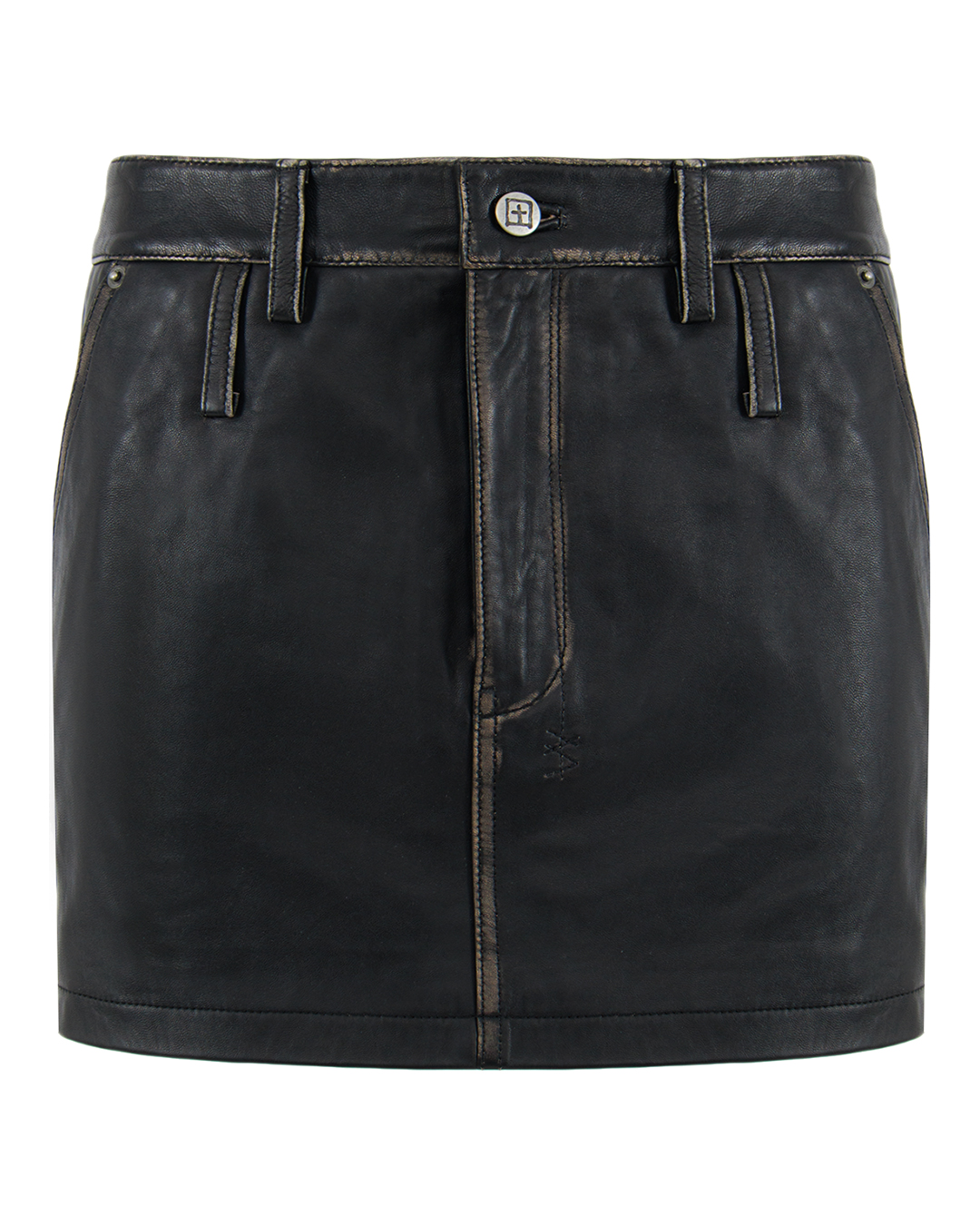 Мини юбка из натуральной кожи. Модель с эффектом вытертости по швам застегивается на молнию и пуговицу спереди. Сзади расположены два врезных кармана. По линии пояса и под ним расположены шлевки для ремня