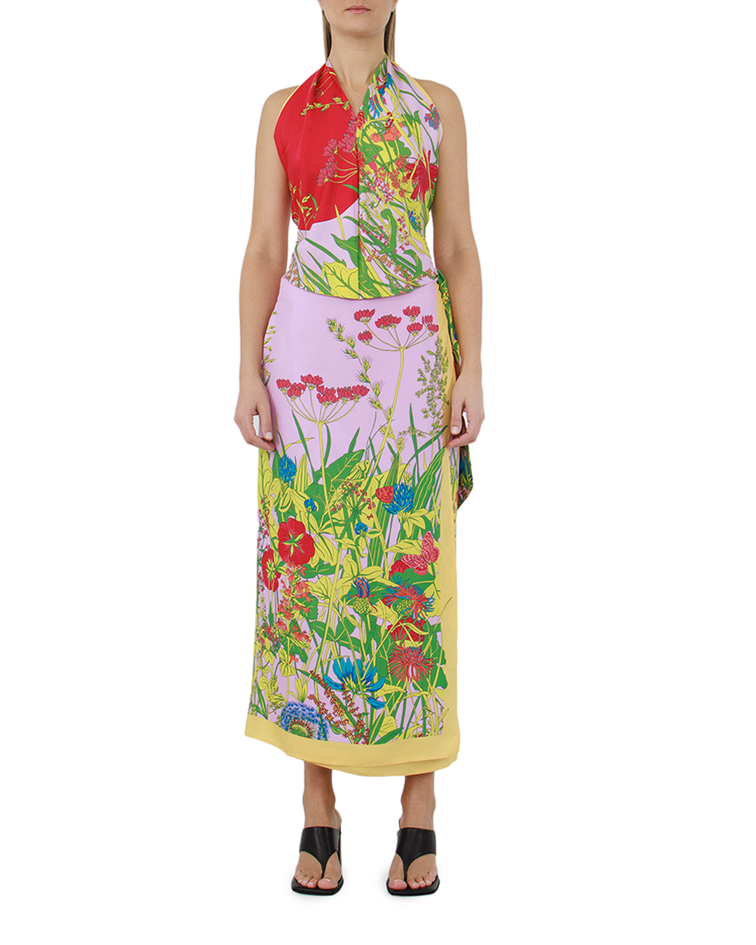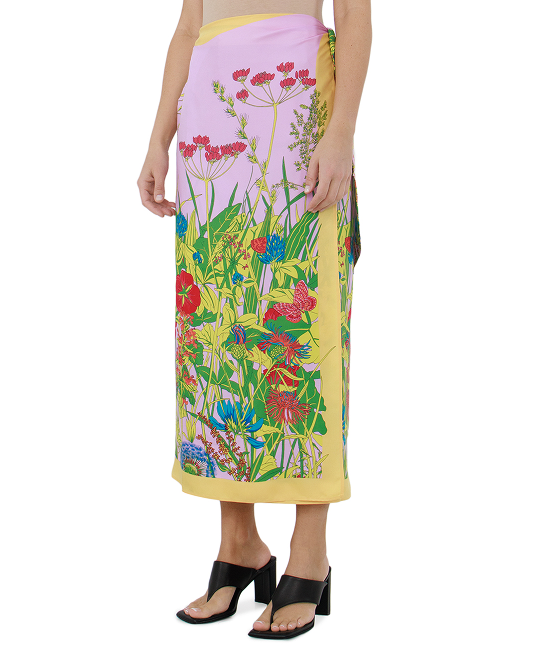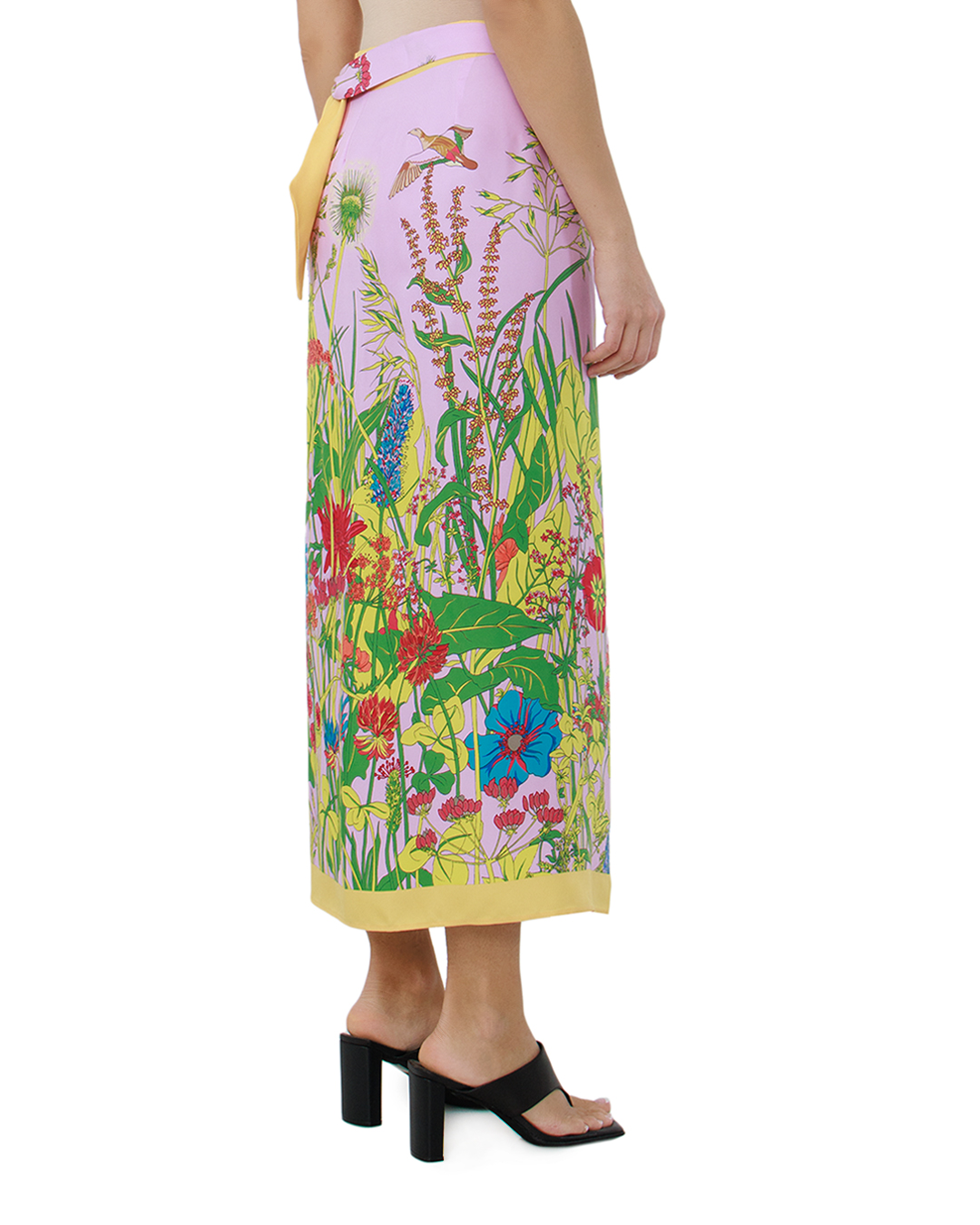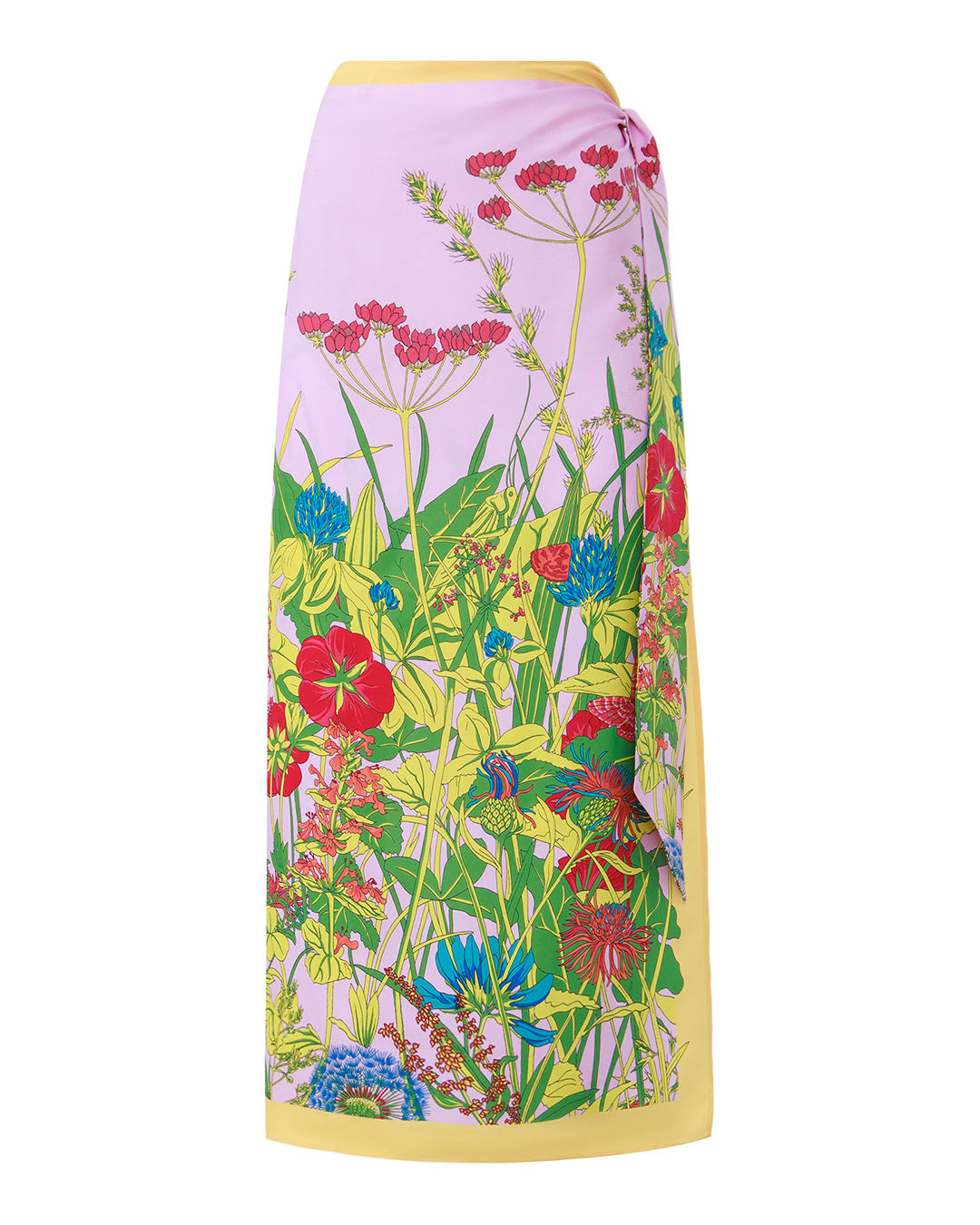 Эта юбка представляет собой настоящий шедевр текстильного искусства. Она выполнена в фасоне «парео», что придает образу легкость и изящество, идеально подходя для теплых летних дней. Силуэт юбки обвивает фигуру, создавая приятный драпированный эффект, который мягко подчеркивает линии тела. Основную выразительность модели обеспечивает принт, выполненный в ярких насыщенных тонах. Красочные цветочные мотивы оживают на нежном сиреневом фоне, привнося в образ атмосферу природной свежести и романтики. Каждый элемент принта детализирован с изяществом и тонкой проработкой линий, что создает впечатление трехмерности и глубины. Юбка украшена контрастной окантовкой по длине изделия и на поясе в теплых жёлтых тонах, обеспечивая визуальную завершенность и акцентируя внимание на талии. Этот дизайнерский ход добавляет модели свежую нотку и изысканность. Изделие изготовлено из легкой струящейся ткани, которая идеально поддается движению, создавая воздушные очертания. Это делает юбку идеальной для вечерних прогулок или пляжных вечеринок, придавая образу особую выразительность и неповторимый шарм.