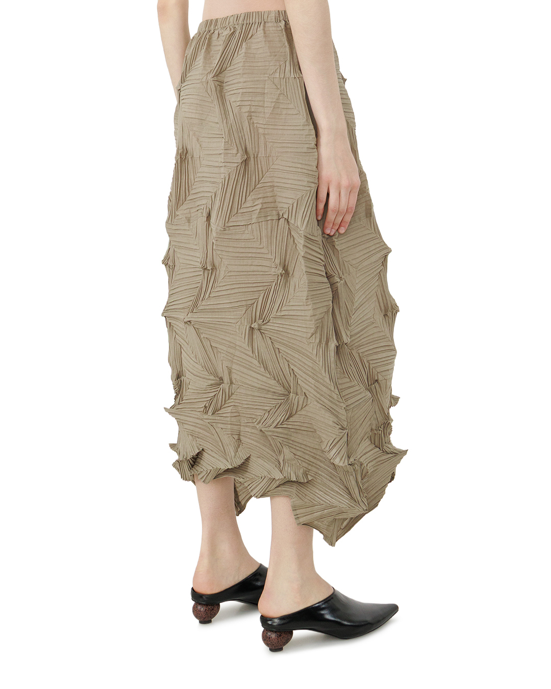 Эта юбка — ода художественной фактуре и свободной элегантности. Трапециевидный силуэт мягко расширяется от талии, создавая ощущение лёгкости. Главная изюминка — сложная плиссировка с геометрическим рисунком: складки складываются в динамичные «ёлочки», придавая вещи скульптурность. Натуральный бежевый оттенок подчёркивает изысканность отделки, а эластичный пояс обеспечивает комфортную посадку. Асимметричный низ с нарочито небрежными складками добавляет образу артистичности, превращая юбку в выразительный акцент гардероба.