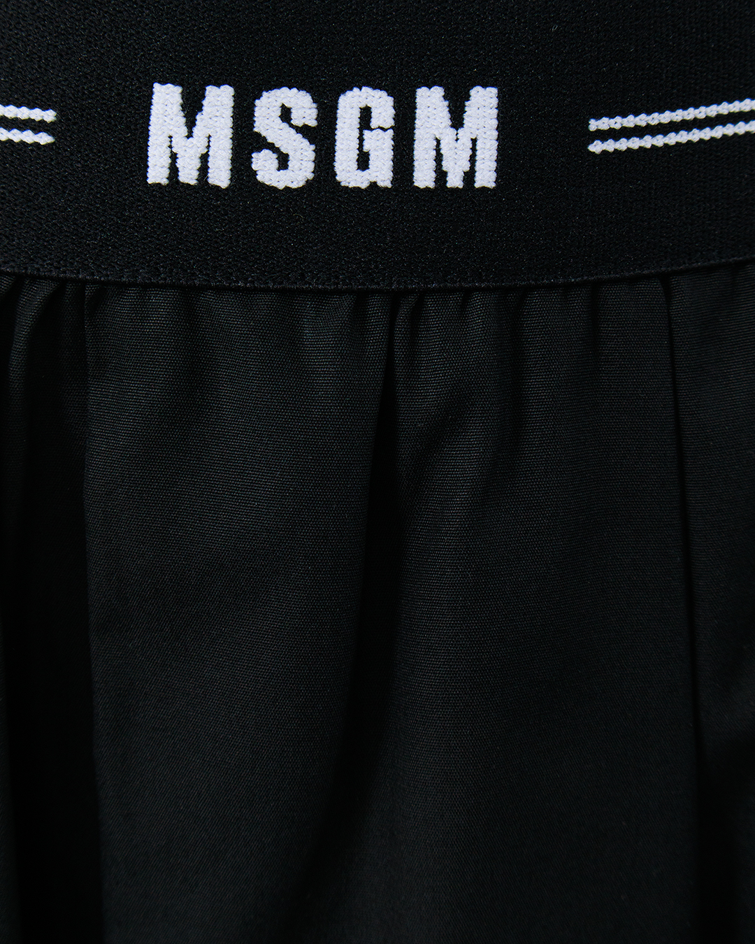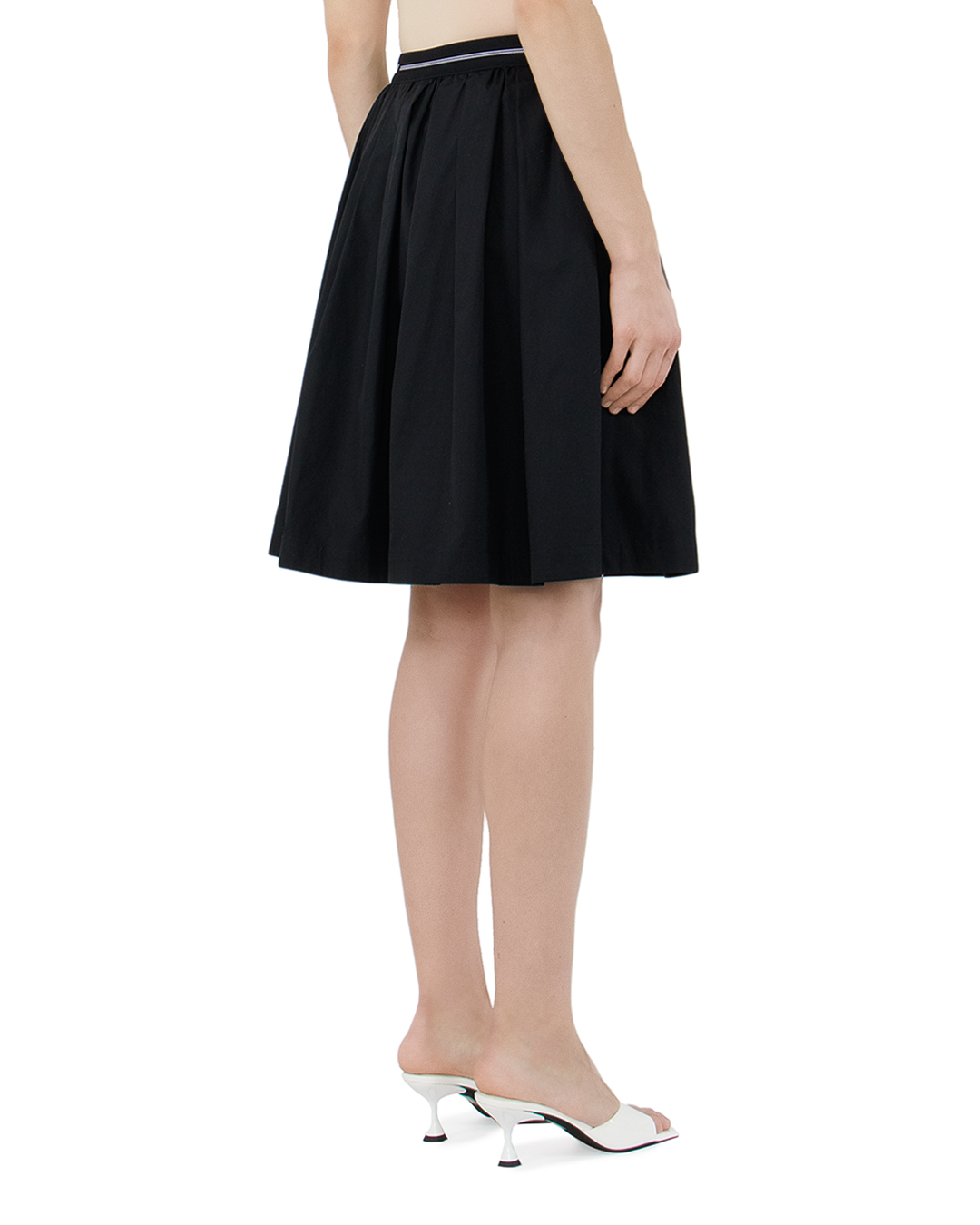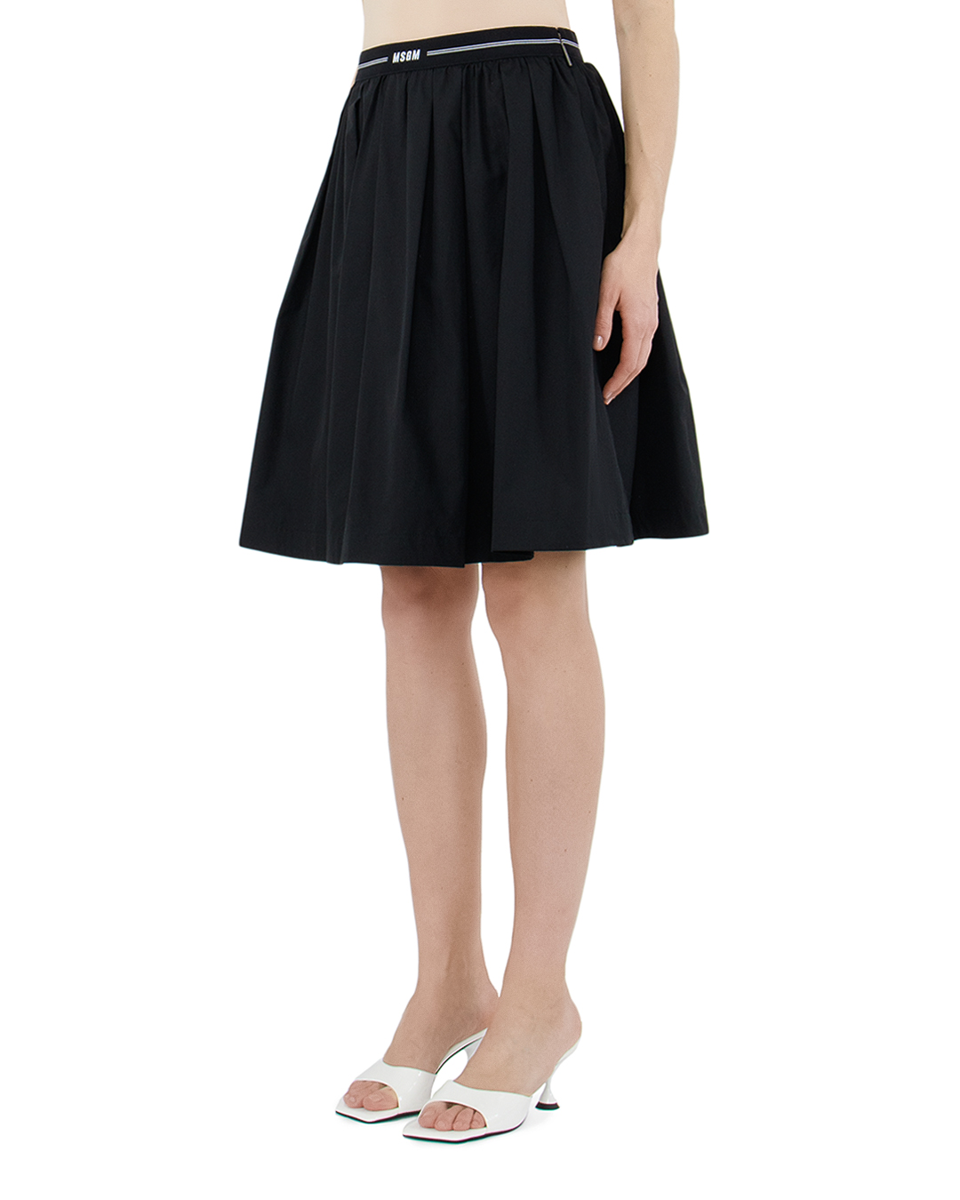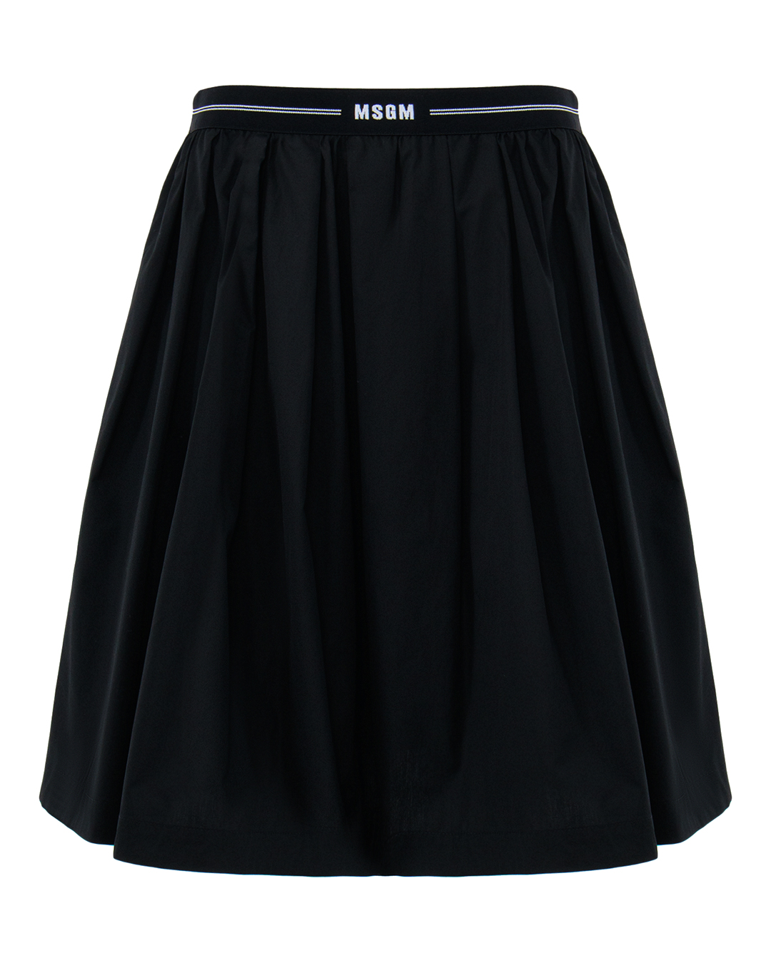 Мини-юбка с двумя врезными карманами сшита из хлопкового поплина. Модель, застегивающаяся потайной молнией сбоку, дополнена широким поясом-резинкой с логотипом марки.