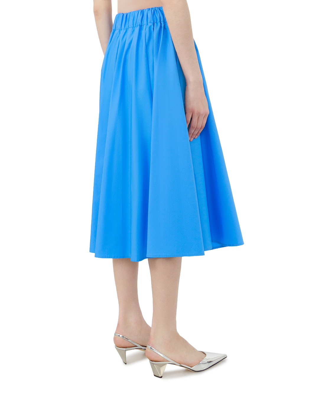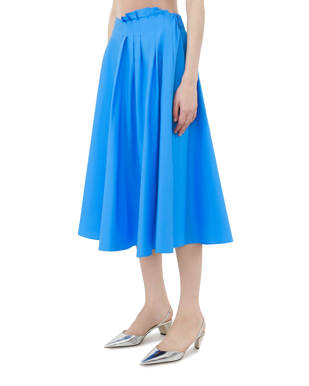 Эта ярко-синяя юбка — воплощение свежести и элегантности, способное стать центральным элементом любого образа. Свободный крой в форме полусолнца создаёт лёгкий, воздушный силуэт, который одновременно подчёркивает женственность и дарит свободу движений. Высокая посадка акцентирует линию талии, визуально вытягивая фигуру и придавая силуэту изящество. Особую выразительность модели придают аккуратные складки, равномерно распределённые по передней части юбки. Они не только добавляют объём и динамику, но и подчёркивают мастерство исполнения — каждая складка прошита с безупречной точностью, без малейших перекосов. Структурированность верхней части гармонично сочетается с плавным, струящимся низом, создавая интересный контраст между геометрией и мягкостью линий. Пояс юбки оформлен с особым вниманием к деталям: аккуратная сборка в верхней части создаёт эффект лёгкой небрежности, добавляя модели индивидуальности. Швы выполнены безупречно — ровные, плотные, практически незаметные, что говорит о высоком качестве пошива. Подгиб по нижнему краю юбки выполнен аккуратно, без торчащих нитей, что обеспечивает не только эстетичность, но и долговечность изделия. Эта юбка станет настоящей находкой для создания как повседневных, так и нарядных образов. Она органично впишется в ансамбль с лаконичным топом и балетками для дневных прогулок, дополнит романтичный лук с облегающей блузой и лодочками или станет основой для яркого летнего образа с укороченным жакетом и сандалиями. Сочетание насыщенного оттенка, продуманного кроя и изысканной отделки делает эту модель по-настоящему универсальной и стильной.