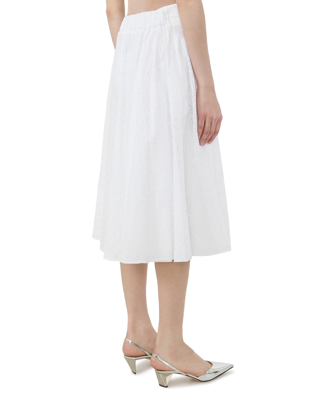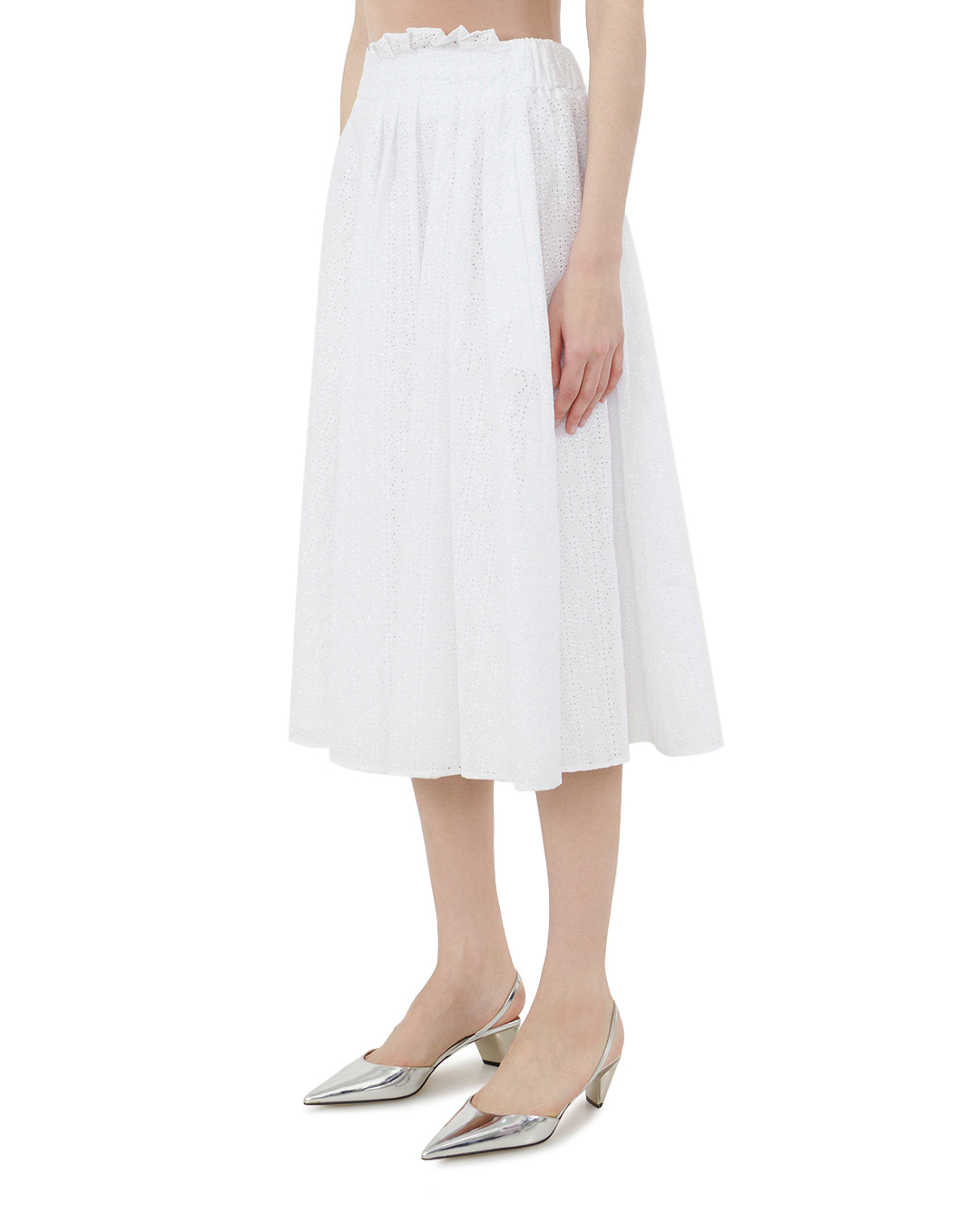 Эта белоснежная юбка — воплощение утончённой классики, способное стать жемчужиной любого гардероба. Свободный, расклёшенный силуэт создаёт ощущение лёгкости и воздушности, изящно подчёркивая линию талии и придавая образу романтичную непринуждённость. Высокая посадка акцентирует внимание на верхней части фигуры, визуально вытягивая силуэт и добавляя ему грации. Особую изысканность модели придаёт деликатная перфорация по всей поверхности юбки — этот элемент отделки создаёт игру света и тени, делая изделие по-настоящему уникальным. Перфорация выполнена с безупречной точностью, без малейшего намёка на небрежность, что подчёркивает высокий уровень мастерства исполнения. Пояс юбки оформлен с особой тщательностью: аккуратная сборка в верхней части создаёт эффект лёгкой небрежности, добавляя модели индивидуальности. Швы выполнены безупречно — ровные, плотные, практически незаметные, что говорит о внимании к мельчайшим деталям. Подгиб по нижнему краю юбки выполнен аккуратно, с идеальной симметрией, что обеспечивает не только эстетичность, но и долговечность изделия. Плавные линии кроя гармонично сочетаются с изысканной отделкой, создавая образ, который одинаково уместен как в дневных, так и в вечерних луках. Эта юбка станет идеальным компаньоном для лаконичного топа с открытыми плечами, классического жакета или нежной блузы. В сочетании с изящными босоножками или балетками она создаст утончённый, элегантный образ, а с лаконичными кедами — лёгкий и непринуждённый ансамбль. Чистота белого оттенка и безупречность исполнения делают эту юбку по-настоящему универсальным элементом гардероба.