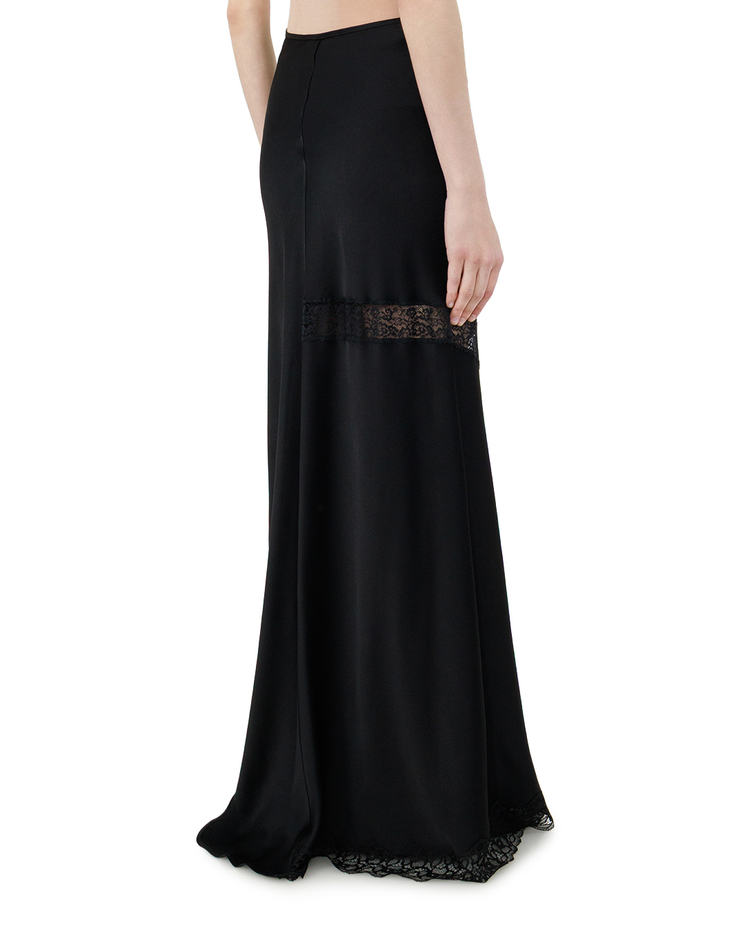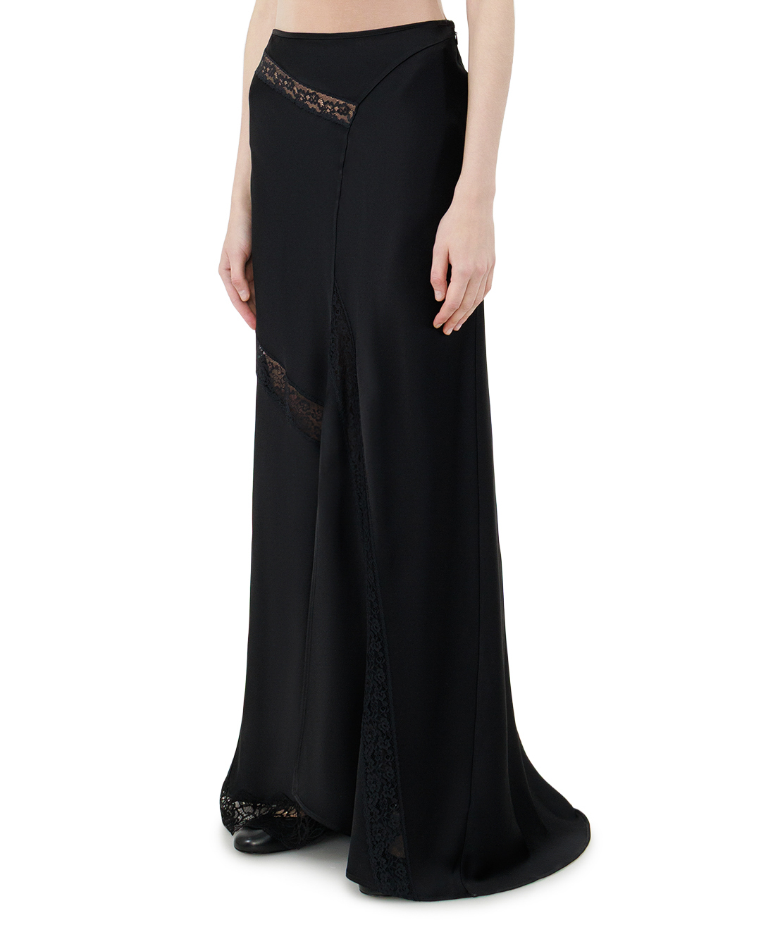 Эта элегантная чёрная юбка-макси — воплощение утончённой роскоши и сдержанного шика. Свободный, слегка расклёшенный крой создаёт изящный силуэт, который одновременно подчёркивает линии фигуры и дарит ощущение лёгкости. Высокая посадка акцентирует талию, визуально вытягивая фигуру и придавая образу благородную стройность. Особую выразительность модели придаёт изысканная кружевная отделка, искусно вплетённая в общий дизайн. Диагональные кружевные вставки по всей длине юбки создают динамичный ритм и добавляют изделию глубины. Кружево не просто украшает, а становится неотъемлемой частью композиции, гармонично сочетаясь с основным материалом и подчёркивая мастерство исполнения. Подол юбки оформлен кружевной каймой, которая придаёт модели завершённость и лёгкую романтичность. Линия низа выполнена асимметрично — этот приём добавляет современности классическому силуэту, создаёт игру объёмов и делает юбку по-настоящему уникальной. Швы выполнены с безупречной точностью: они ровные, практически незаметные, что говорит о высоком уровне пошива. Все элементы отделки — от кружевных вставок до подгиба подола — выполнены с особым вниманием к деталям, без малейших изъянов. Эта юбка станет центральным элементом вечернего образа: она органично сочетается с облегающим топом, классической блузой или элегантной водолазкой. В паре с лаконичными туфлями-лодочками или ботильонами она создаст образ, в котором сочетаются сдержанность и изысканность. Универсальность модели позволяет использовать её и для дневных выходов, дополнив лёгким жакетом и минималистичной обувью. Чёрная юбка с кружевной отделкой — это не просто предмет гардероба, а выразительный акцент, способный преобразить любой образ.