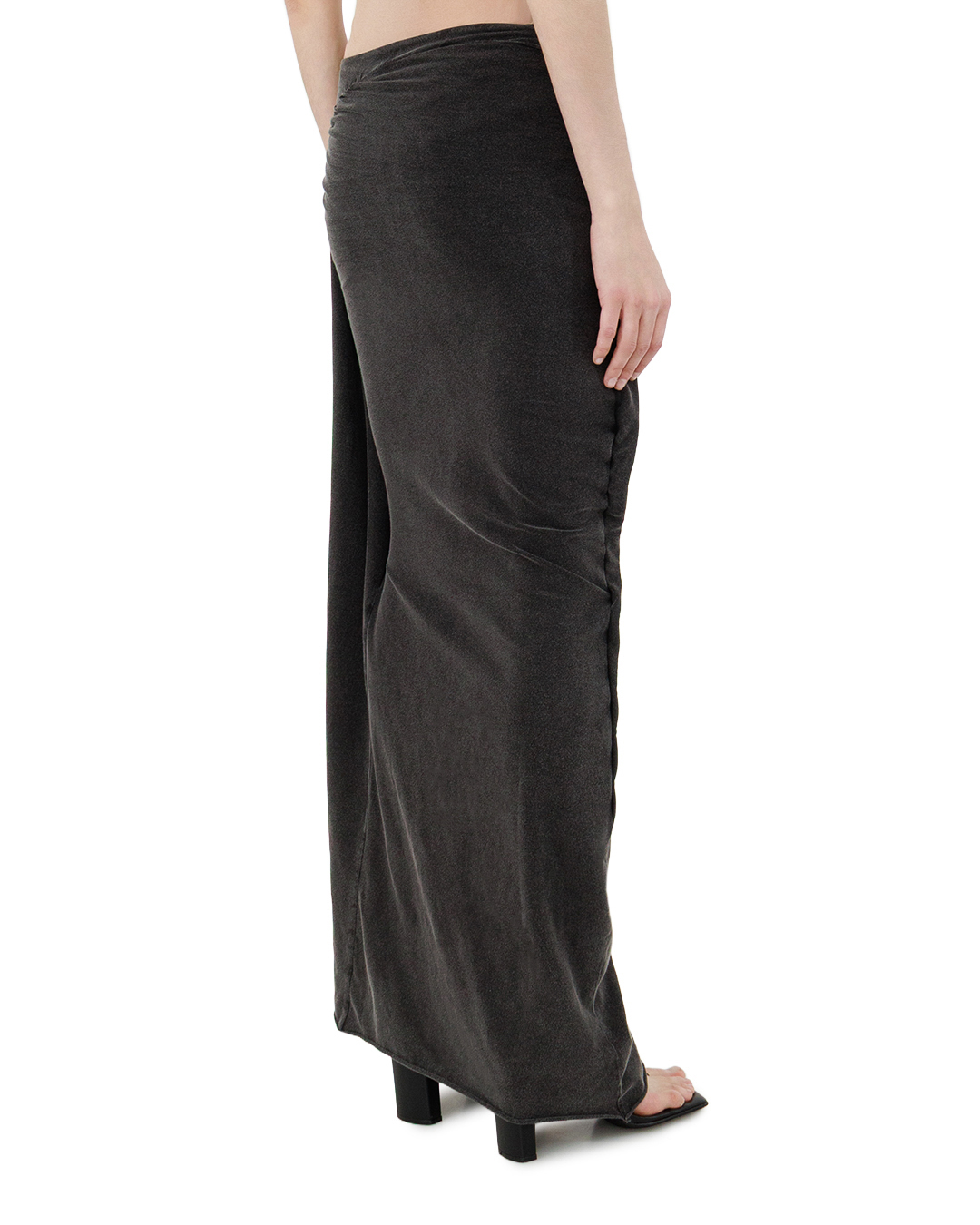 Эта юбка — воплощение утончённой лаконичности, где каждая линия дышит сдержанной элегантностью. Асимметричная драпировка в верхней части создаёт эффект движения, будто ткань поймана в мгновении лёгкого ветра. Такой приём не только подчёркивает индивидуальность модели, но и добавляет силуэту глубины, превращая юбку в настоящий арт-объект гардероба. Особенность кроя — диагональный нахлёст, который формирует выразительный объём с одной стороны, уравновешивая строгость прямого силуэта. Этот контраст между свободой драпировки и чёткостью линий создаёт завораживающую игру форм. Боковой разрез придаёт модели динамичность и практичность, позволяя двигаться легко и непринуждённо. Поясная зона выполнена с нарочитой небрежностью: ткань собрана и зафиксирована так, что создаёт ощущение ручной работы, подчёркивая уникальность изделия. Отсутствие ярких декоративных элементов делает юбку универсальной — она легко впишется как в минималистичный, так и в более выразительный образ. Глубокий тёмный оттенок придаёт вещи благородство, а продуманный крой позволяет подчеркнуть достоинства фигуры, сохраняя при этом нотку загадочности. Эта юбка станет центральным элементом образа, способного произвести впечатление: она одновременно сдержанна и выразительна, проста и изысканна. Идеальный выбор для тех, кто ценит в моде сочетание смелости и утончённости.