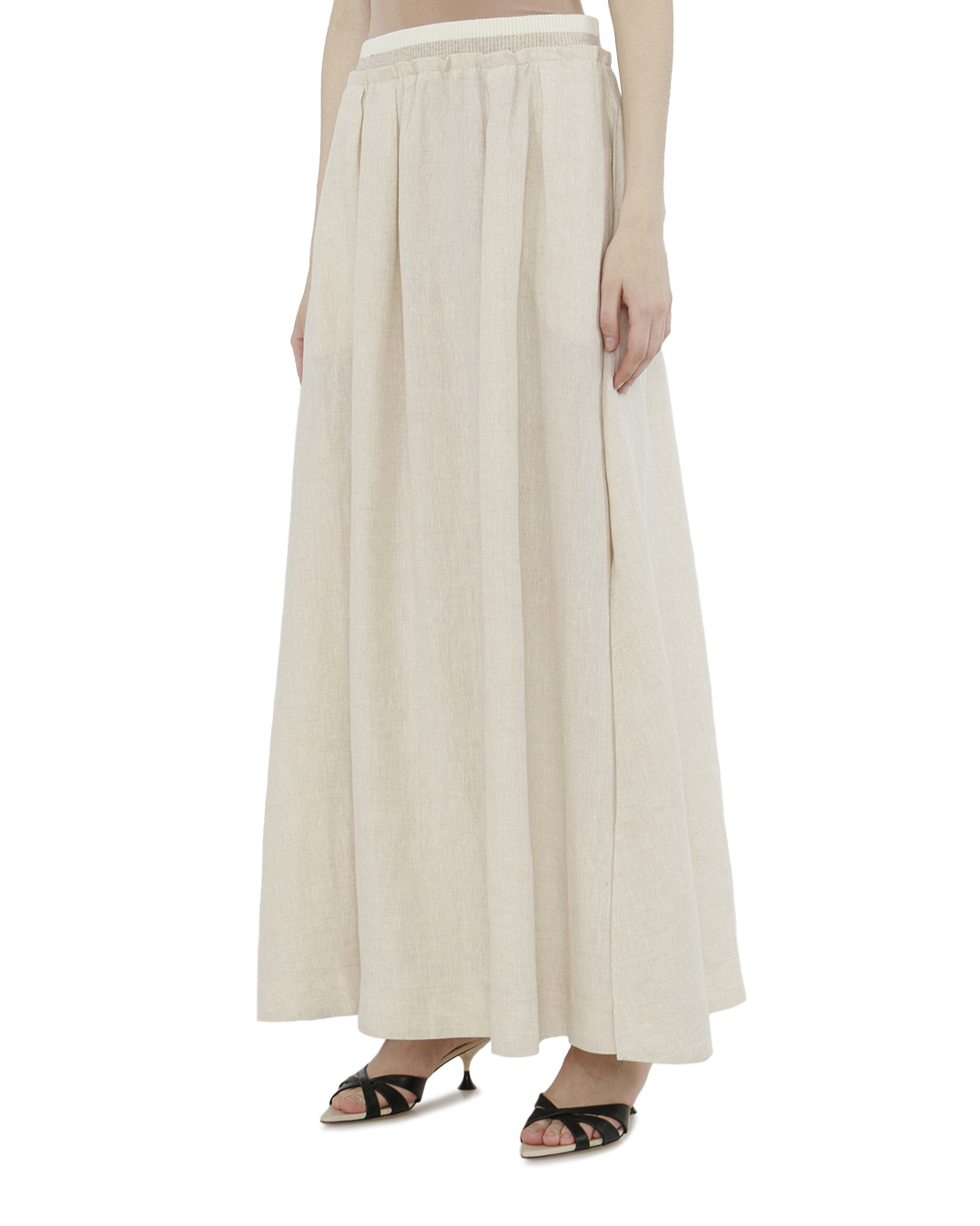 Эта юбка — воплощение безупречной элегантности с лёгкостью и непринужденностью. Выполненная из мягкой, струящейся ткани светло-бежевого оттенка, она создаёт утончённый и романтичный образ. Её воздушная конструкция позволяет ткани плавно ниспадать, создавая эффектный силуэт и подчеркивая грацию каждой вашей походки. Эластичный пояс обеспечивает комфорт и идеальную посадку, легко адаптируясь к изгибам тела и акцентируя линию талии. Вытачки добавляют юбке объёмности и структурированности, делая её подходящей для множества образов — от повседневных до более формальных. Нижний край юбки оформлен с аккуратной подгибкой, что придаёт изделию законченность и элегантность. Лёгкий блеск ткани придаёт модели свежести и лёгкости, делая её идеальной для солнечных дней. Эта юбка будет изысканно смотреться в сочетании с изящными блузками или лёгкими топами, а также с различной обувью — от сандалий до классических лодочек, добавляя вашему образу женственность и непринужденный шик.