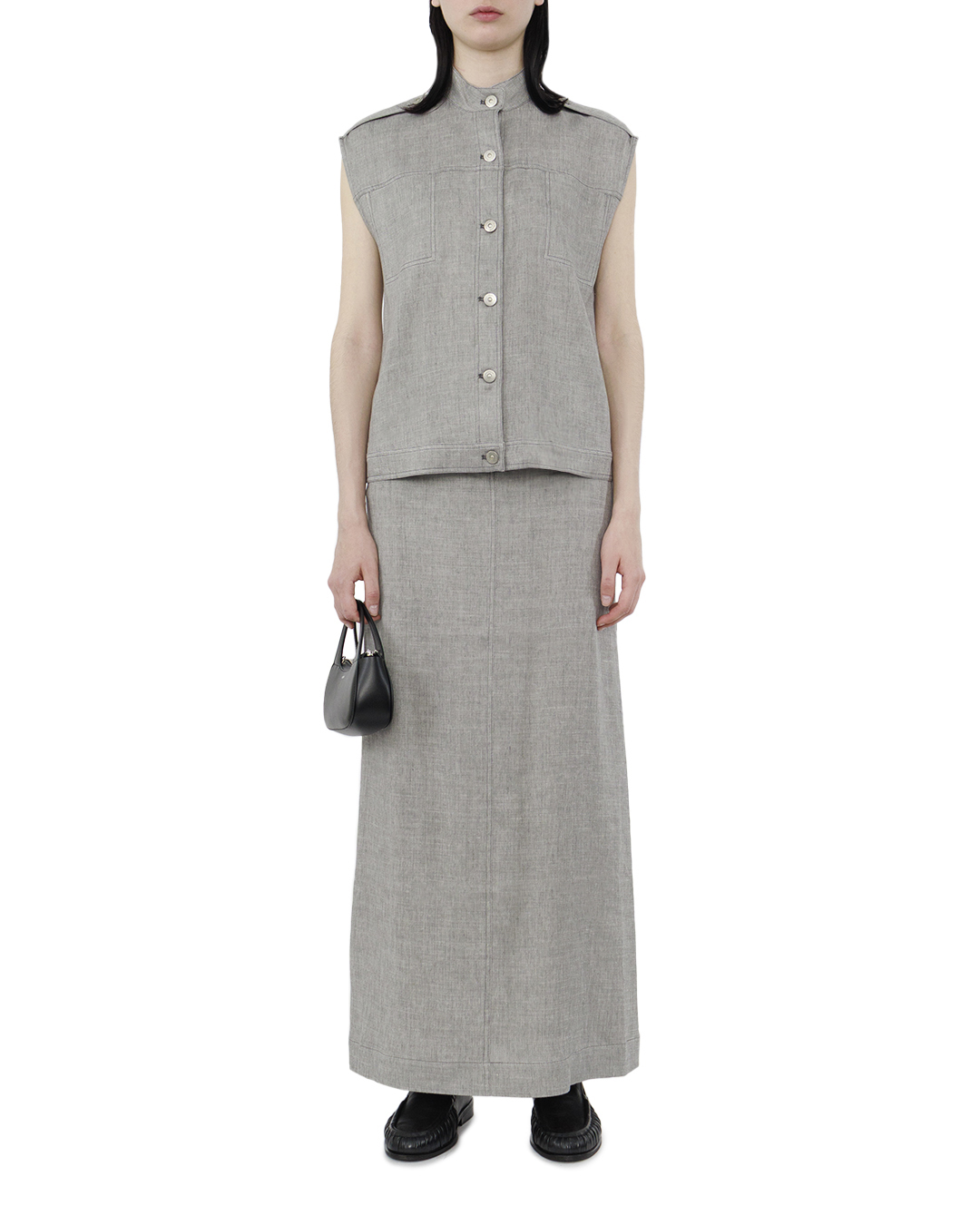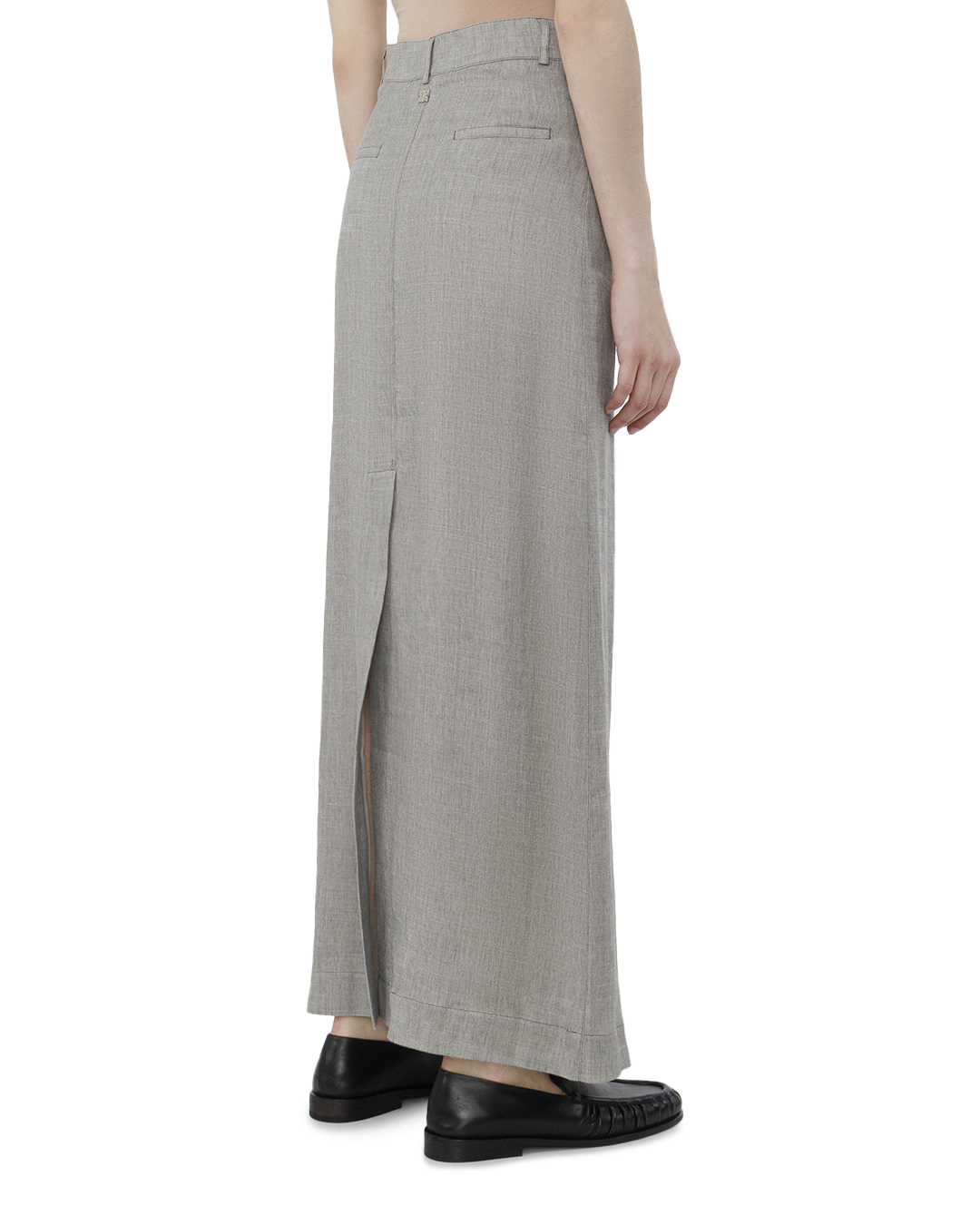 Эта юбка является образцом сдержанной элегантности и современного стиля. Изготовленная из плотной ткани серого оттенка, она создает четкий, стройный силуэт, который идеально подчёркивает фигуру. Её длина и прямой крой придают образу строгость и изысканность. Детали кроя включают в себя классические элементы — пояс с пуговицей, который обеспечивает аккуратную посадку и акцентирует внимание на талии. Интегрированные карманы не только добавляют практичности, но и вносят нотку расслабленности в общий вид. Строчки и швы выполнены с безупречной точностью, подчеркивая высокое качество изделия. Нижний край юбки оформлен с лаконичной подгибкой, придающей законченности и подчеркивающей строгие линии дизайна. Эта юбка будет прекрасно смотреться как в офисных ансамблях с классическими блузками и пиджаками, так и в более расслабленных образах с мягкими свитерами или топами, обеспечивая универсальность и стиль.