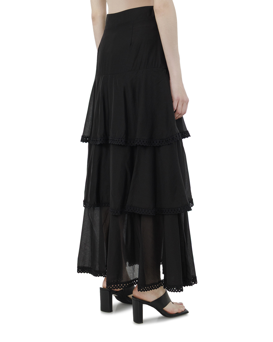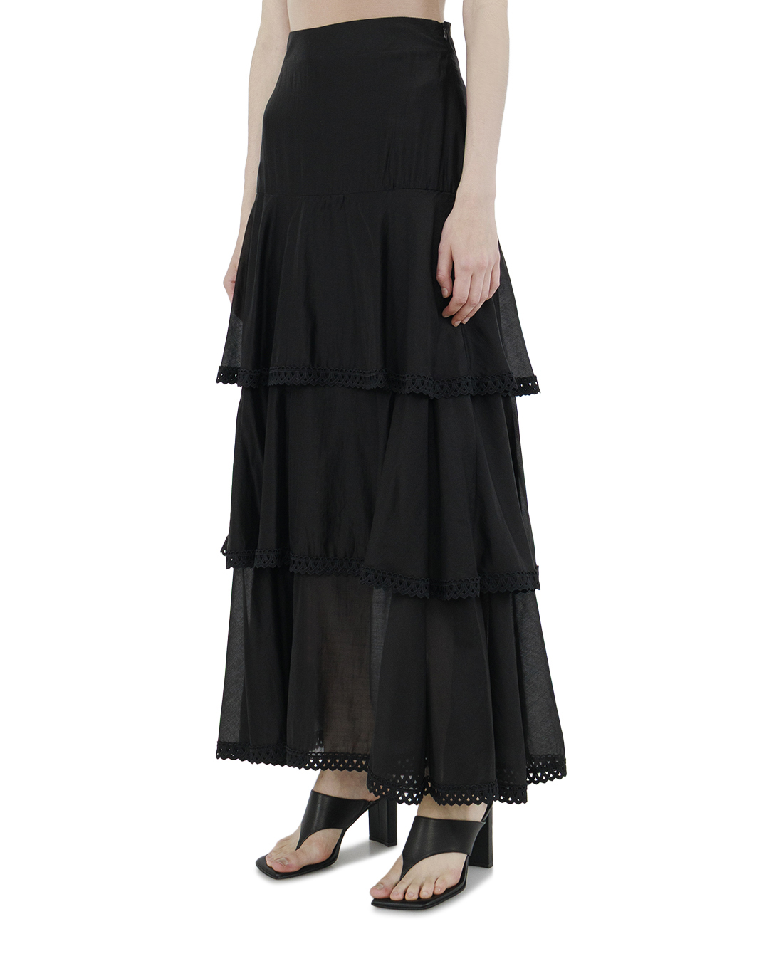 Эта юбка, выполненная в многослойном стиле, привлекает внимание своей элегантной структурностью и драматичностью. Глубокий черный цвет придает изделию загадочность и утонченность, идеально подходя для создания выразительных образов в вечерних и формальных нарядах. Фасон "миди" демонстрирует замысловатую игру с пропорциями, добавляя динамичность и объем за счет каскадных ярусов. Каждый ярус отделан изысканным кружевом, что придает легкость и текстурность, а также акцентирует внимание на глубине и насыщенности цвета. Юбка отличается лаконичным поясом, который создает четкую линию талии, обеспечивая комфорт и надежную посадку. Тщательно обработанные швы, невидимые снаружи, подчеркивают безупречное исполнение и высокий уровень мастерства. Этот дизайн представляет собой классическое, но инновационное переосмысление, создающее гармоничный баланс между современностью и традициями.