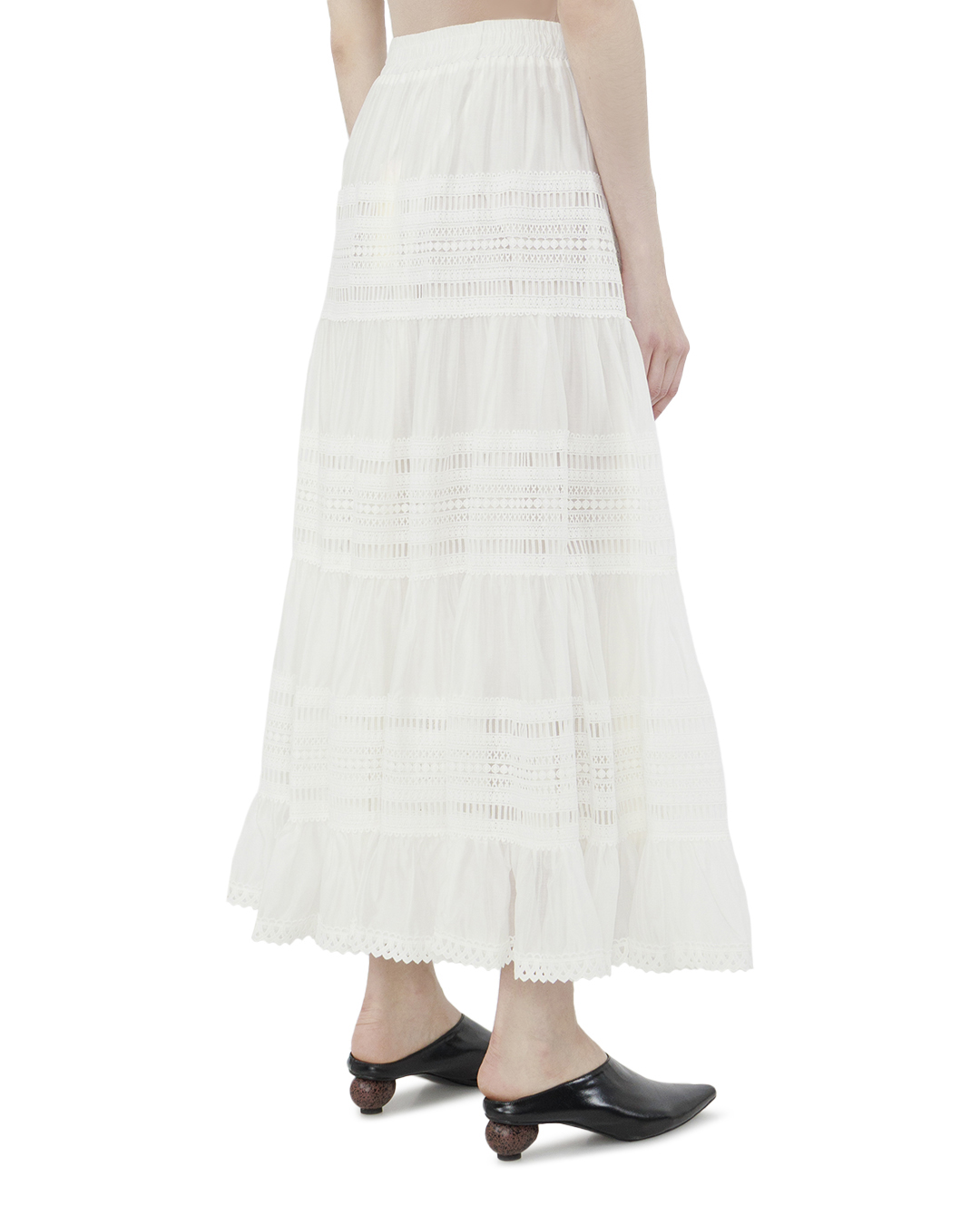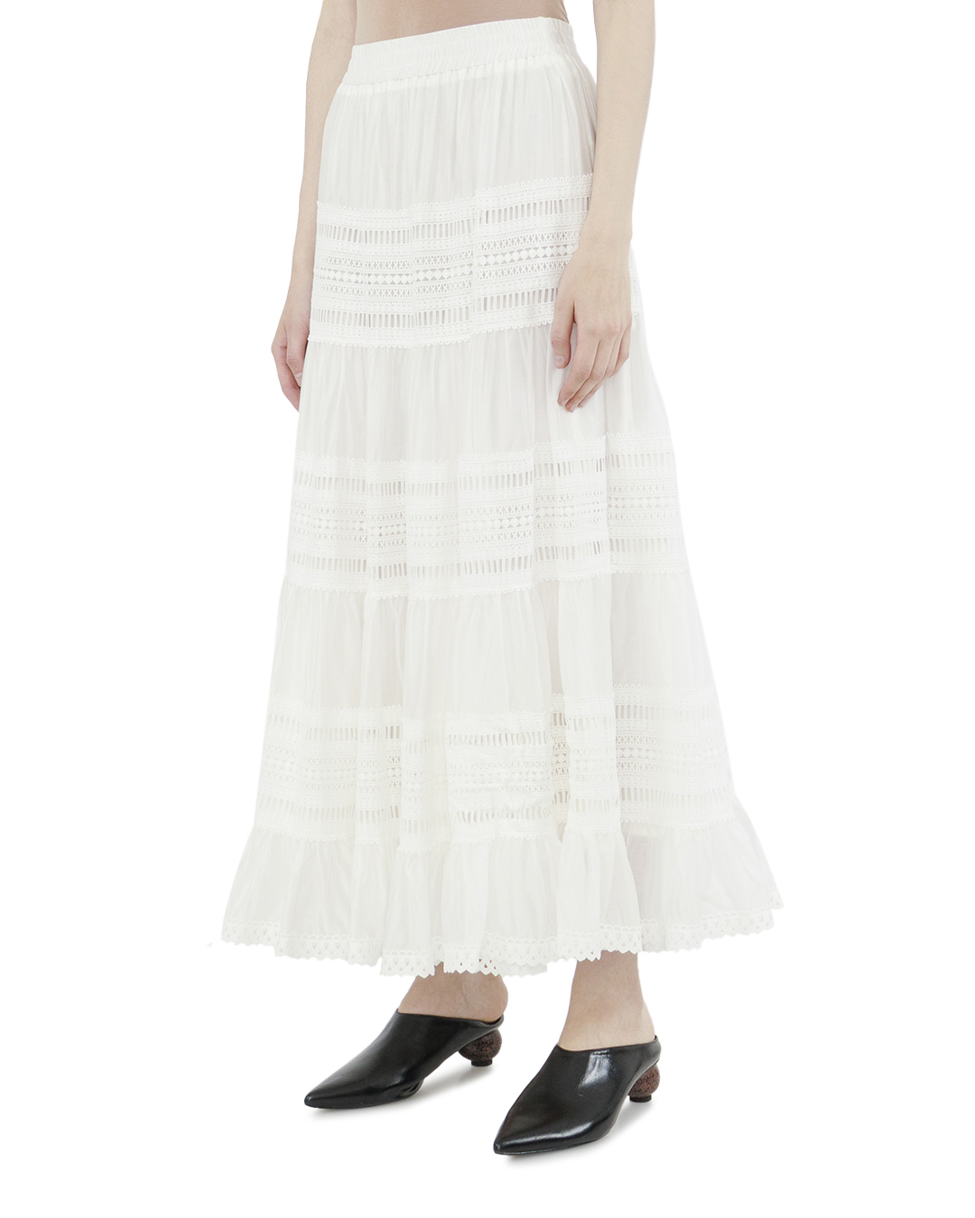 Эта юбка — воплощение нежности и романтики, благодаря легкости и воздушности силуэта. Белоснежный оттенок делает её идеальным элементом гардероба для создания светлых и утонченных образов, символизирующих чистоту и изящество. Юбка выполнена в полном шикарном фасоне "макси", что придает ей величественное присутствие. Многослойная конструкция создает эффект легкой драпировки, добавляя динамику и объем. Каждый слой украшен изящными кружевными вставками, которые прекрасно сочетаются между собой, формируя тонкую сетку текстур и узоров. Эластичный пояс обеспечивает комфортную посадку и легкость в ношении, подчеркивая талию и создавая идеальный силуэт. Кружевная отделка по подолу добавляет изысканный акцент, завершая образ на высокой ноте стиля. Этот дизайн идеально подходит как для casual-образов, так и для более формальных мероприятий, предлагая универсальность и роскошь.