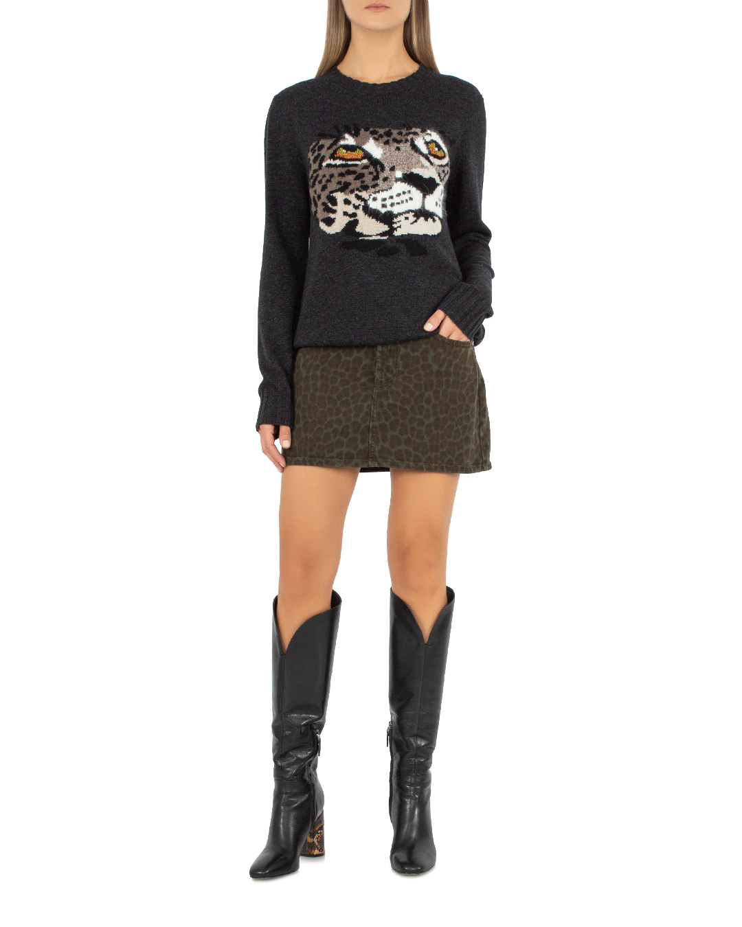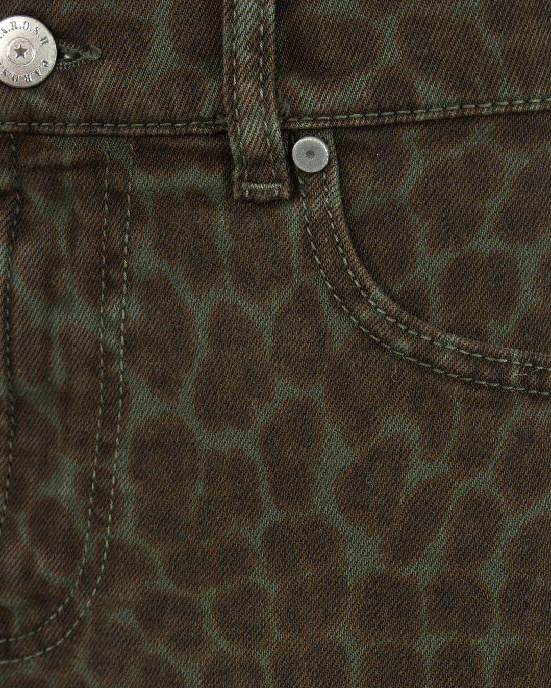 Юбка мини P.A.R.O.S.H из хлопкового денима с леопардовым принтом. Высокая посадка на талии и застежка на молнию и пуговицу дополнена несколькими карманами.