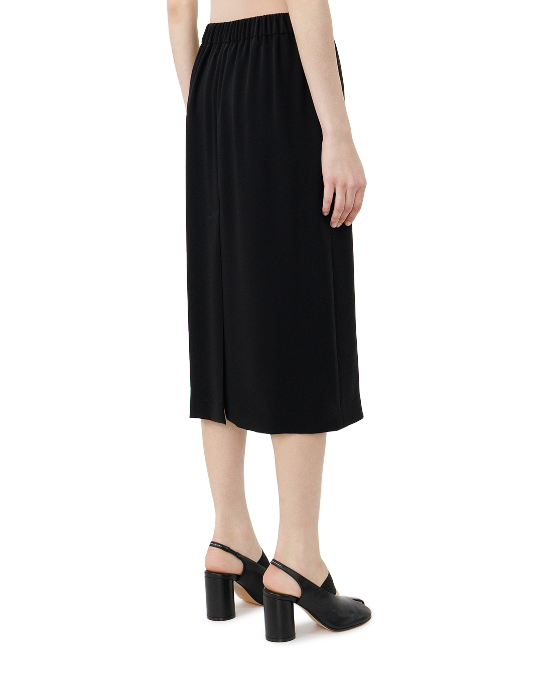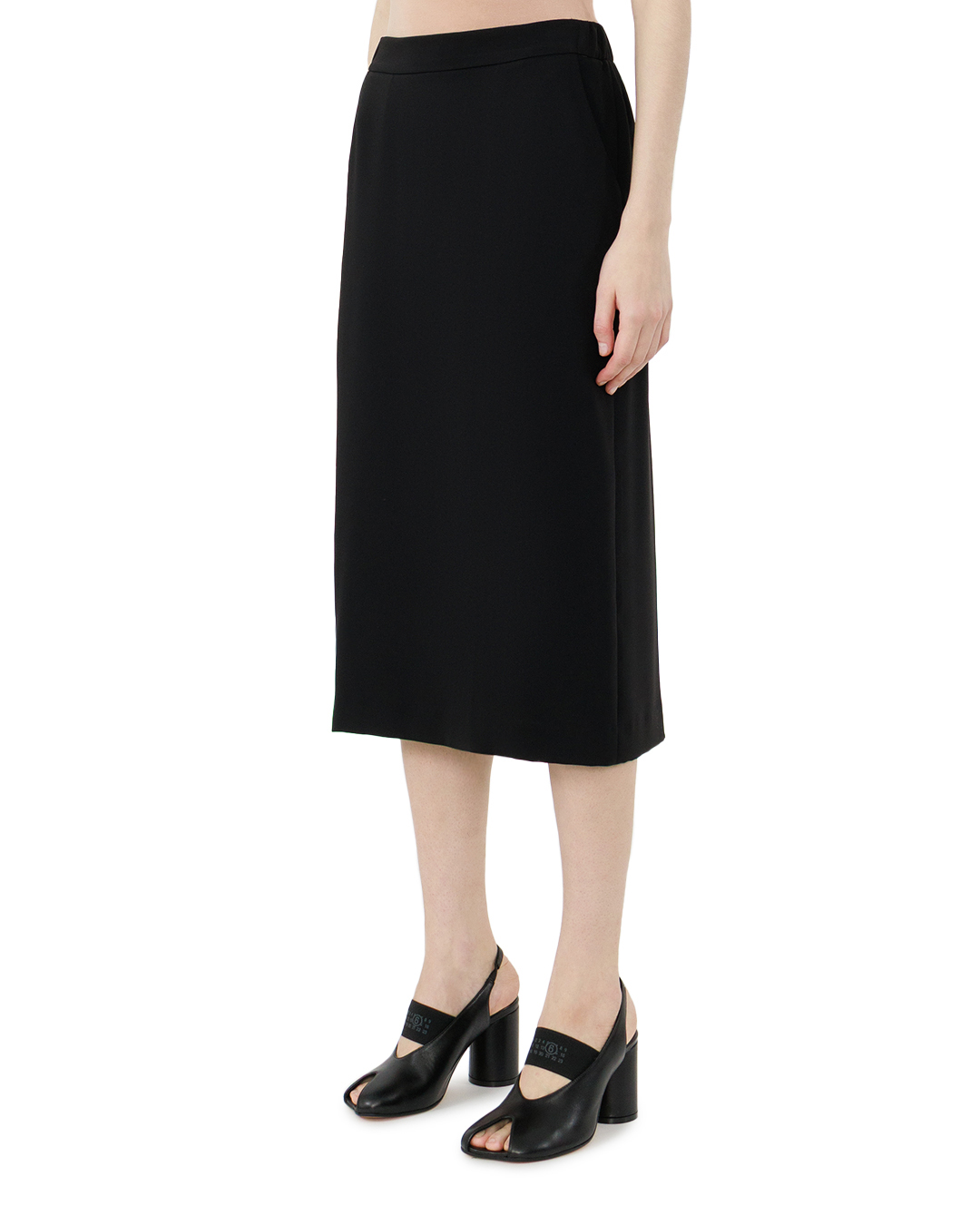 Эта классическая чёрная юбка-карандаш — воплощение сдержанной элегантности и безупречного кроя. Прямой силуэт с лёгким сужением к низу создаёт выразительный, но не вызывающий образ, подчёркивая женственность линий и стройность фигуры. Умеренная длина миди придаёт модели универсальность: она органично впишется как в деловой дресс-код, так и в повседневный гардероб. Высокая посадка акцентирует линию талии, визуально удлиняя ноги и придавая силуэту собранность. Пояс выполнен с особой тщательностью — ровный, без лишнего объёма, он мягко облегает талию, не создавая дискомфорта, при этом чётко очерчивает верхнюю границу юбки. Край подола обработан безупречно: ровный, чётко очерченный срез создаёт ощущение лаконичности и завершённости образа. Все швы выполнены с исключительной аккуратностью — они практически незаметны, что подчёркивает качество пошива и создаёт иллюзию цельной конструкции. Отсутствие декоративных элементов делает модель особенно выразительной: вся сила образа сосредоточена в чистоте линий и точности кроя. Эта юбка — пример того, как минимализм может быть роскошнее любых украшений. Она сочетает в себе классику и современность, демонстрируя безупречный вкус и внимание к деталям. Такая вещь станет основой для множества стильных комбинаций, позволяя создавать образы с характером и утончённостью.