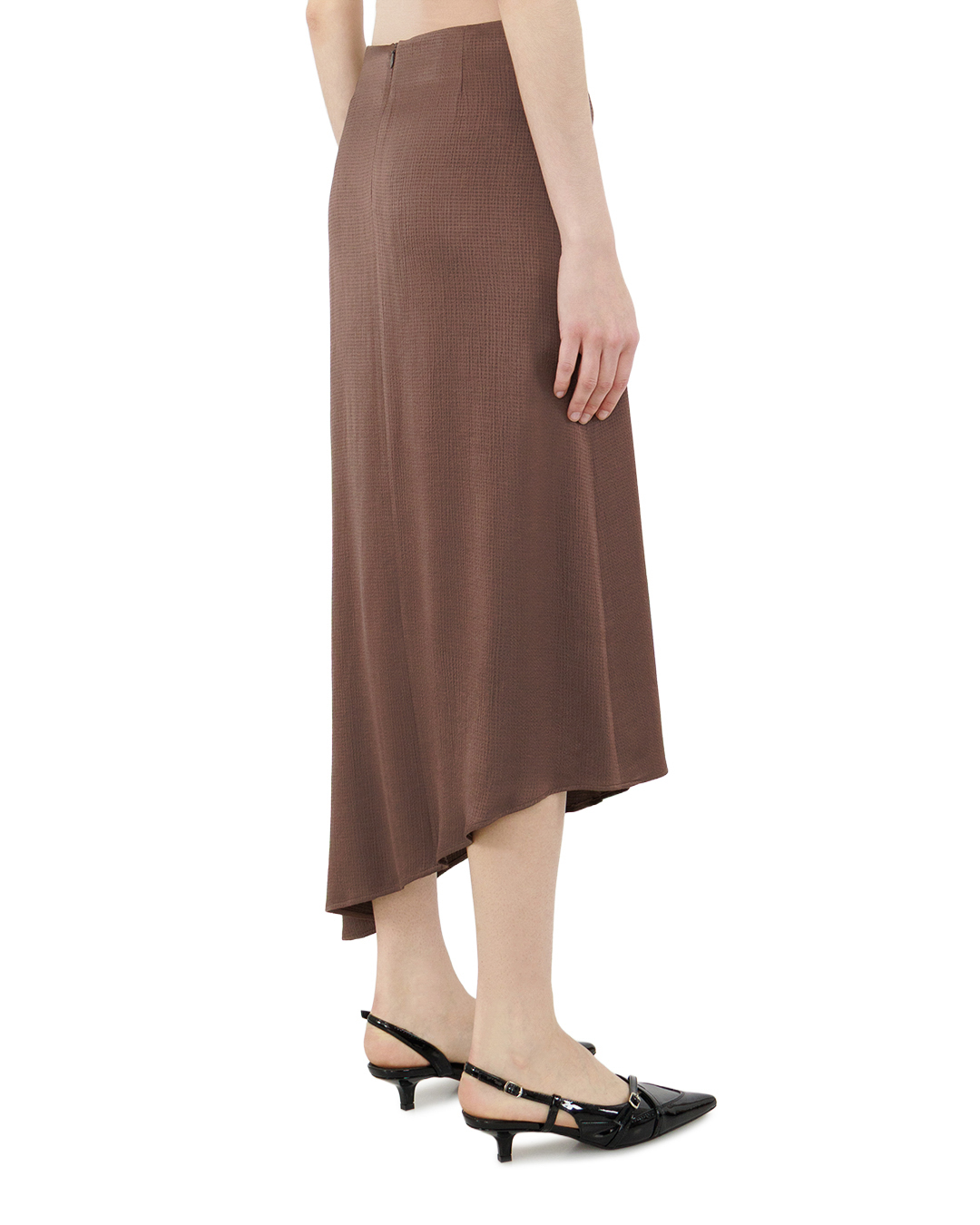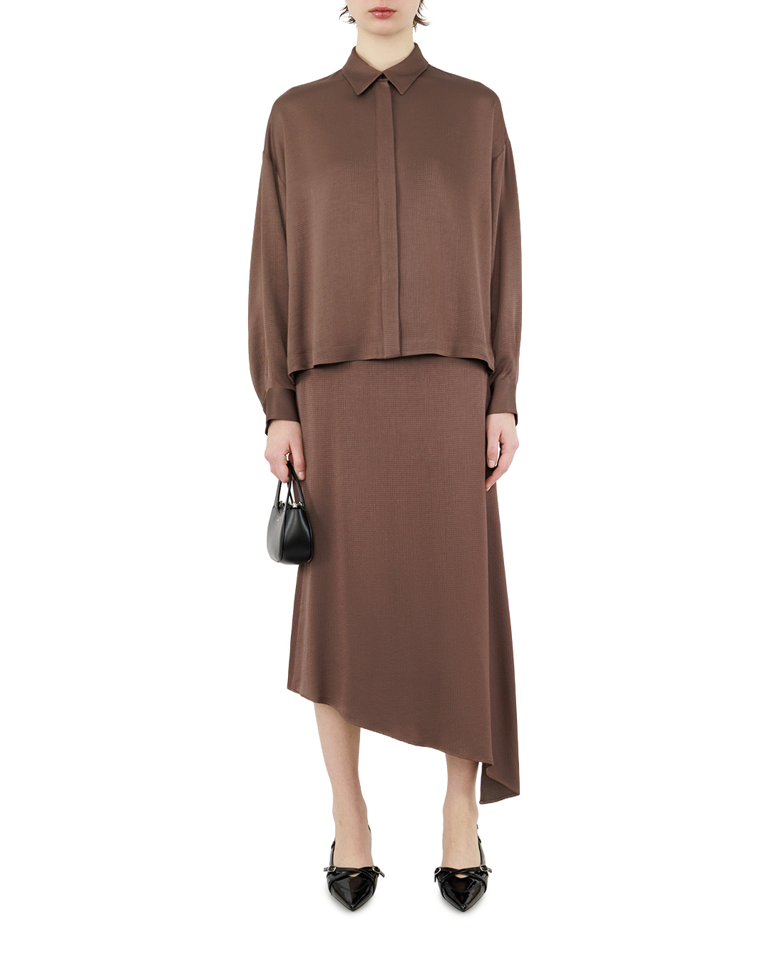 Эта изысканная юбка миди — воплощение сдержанной элегантности и современного кроя. Асимметричный подол создаёт динамичный силуэт, придавая модели характер и утончённость: плавный перепад длины играет с пропорциями, мягко подчёркивая линии фигуры без излишней откровенности. Высокий пояс лаконично фиксирует юбку на талии, формируя чёткую линию верха, которая уравновешивает свободный низ. Отсутствие застёжек и декоративных элементов подчёркивает минималистичный характер изделия — вся красота здесь в чистоте линий и продуманности кроя. Особая прелесть этой модели — в гармонии геометрии и мягкости: строгие очертания сочетаются с естественным, чуть струящимся силуэтом, а асимметрия добавляет движения, превращая юбку в выразительный акцент образа. Нейтральный коричневый оттенок делает её универсальной базой для самых разных комбинаций — от лаконичных офисных луков до более расслабленных повседневных ансамблей. Эта юбка не просто предмет гардероба, а инструмент для создания образа с характером: она одновременно сдержанна и выразительна, практична и стилистически актуальна.