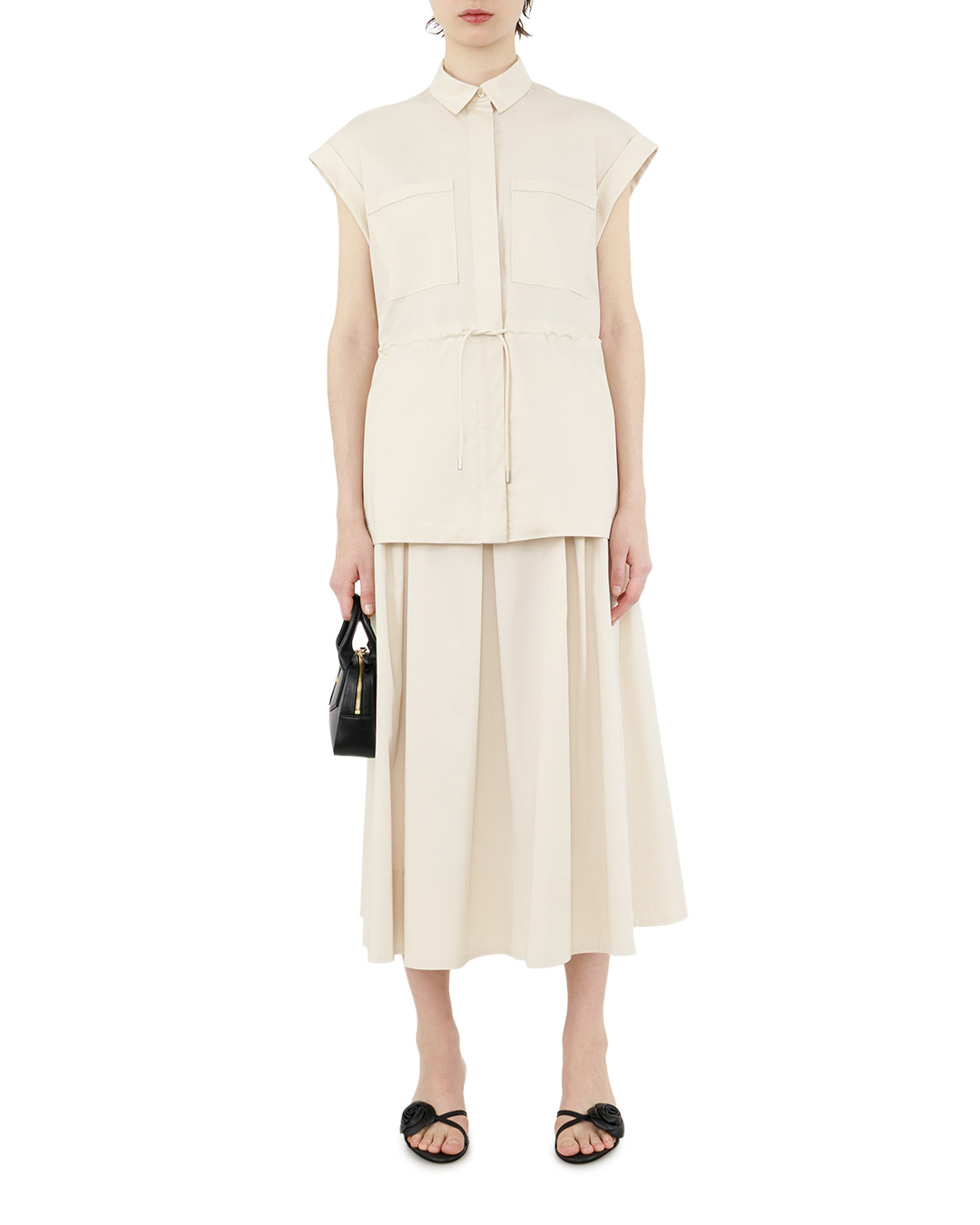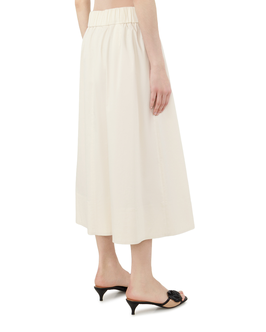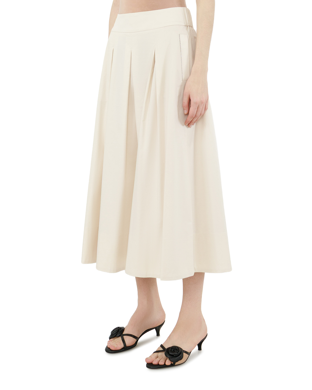 Эта изысканная юбка миди — образец классической элегантности, переосмысленной в современном ключе. Мягкий молочный оттенок придаёт модели особую утончённость, а расклёшенный силуэт с чётко выраженными складками создаёт благородный объём, подчёркивая женственность образа. Высокий пояс лаконично фиксирует юбку на талии, формируя чёткую линию верха и визуально вытягивая фигуру. Складки по переду не только добавляют изделию динамики, но и обеспечивают свободу движений, сохраняя при этом безупречный силуэт. Ровный срез подола оформлен с особой тщательностью: аккуратная внутренняя отстрочка придаёт завершённость крою, не отвлекая внимание от общей гармонии линий. Отсутствие лишнего декора делает эту юбку универсальной: она одинаково органично впишется и в деловой ансамбль, и в лёгкий повседневный образ. Чистота кроя, выверенные пропорции и изысканная простота отделки превращают её в незаменимую базовую вещь, способную стать центральным элементом любого лука. Эта юбка не просто дополняет образ — она задаёт ему тон, добавляя нотку сдержанной роскоши и безупречного вкуса.