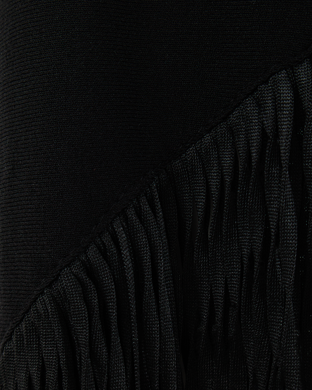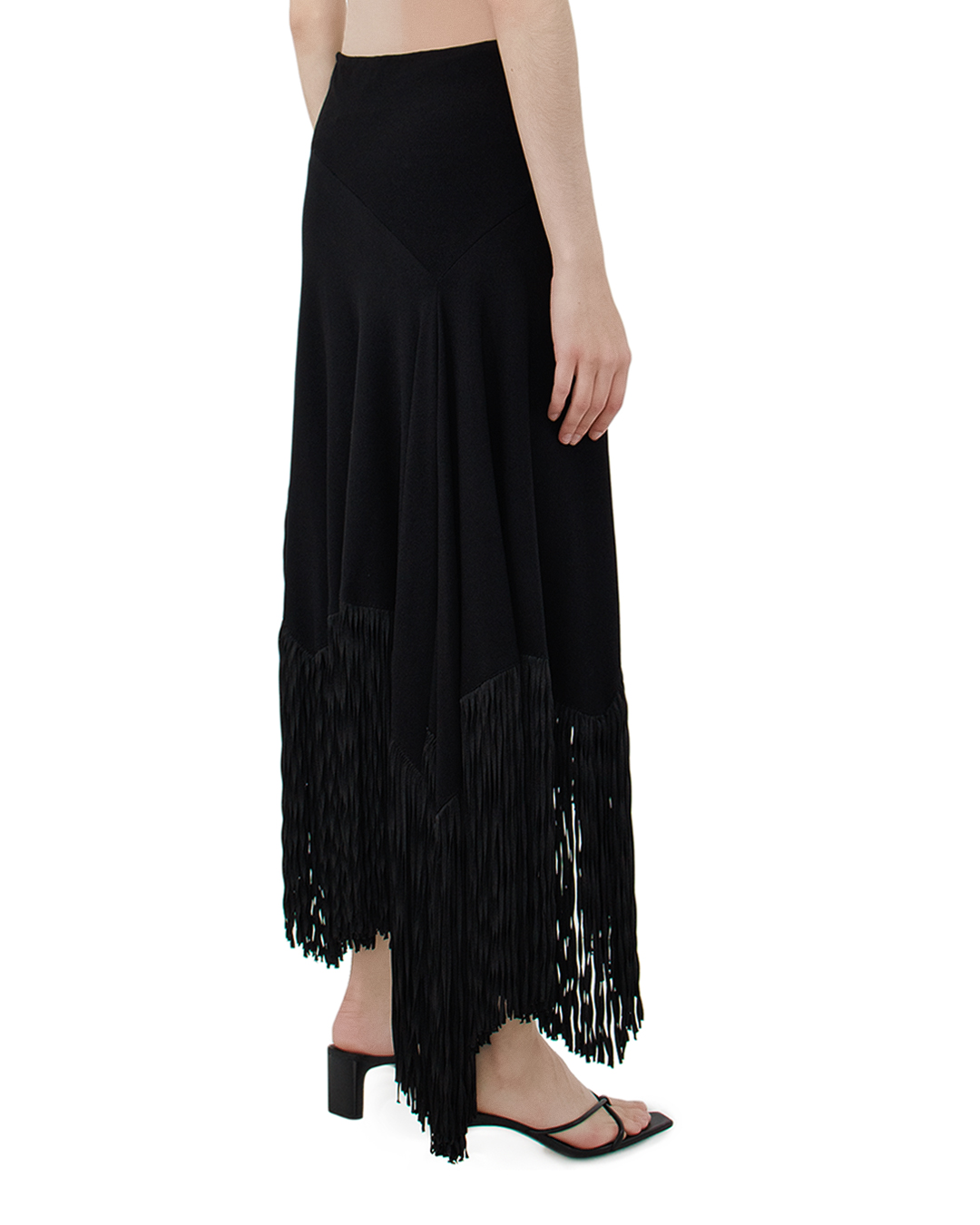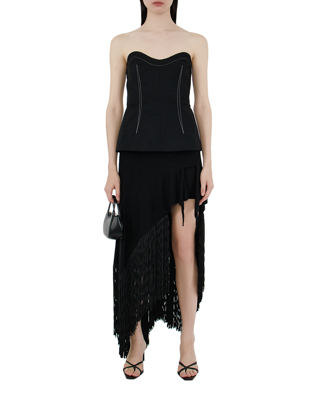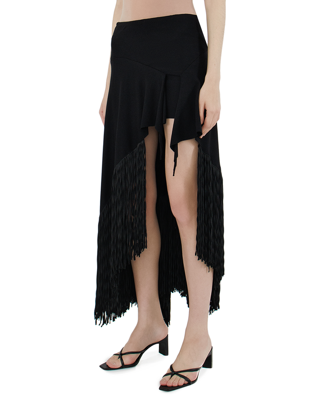 Эта юбка — воплощение драматичной элегантности и ультрасовременного стиля. Выполненная из роскошной чёрной ткани, она привлекает внимание своим изощрённым асимметричным кроем. Верхняя часть представляет собой изящный облегающий пояс, плавно переходящий в ниспадающие воланы, создающие эффект воздушности и легкости. Драпировка верхнего слоя придаёт дополнительный объем и движение, добавляя динамику силуэту. Юбка украшена эффектной длинной бахромой, которая издают ритмичный шорох при движении, добавляя нотку театральности и артистичного шарма. Эта деталь превращает изделие в произведение искусства, балансируя между классикой и авангардом. Акцент на асимметричном подоле обеспечивает игру линий и теней, создавая визуальный интерес и оригинальность. Яркость текстур и продуманный дизайн делают юбку идеальным выбором для вечерних мероприятий или особых случаев, когда нужно произвести неизгладимое впечатление. Эта юбка станет центральным элементом вашего гардероба, позволяя воплощать самые смелые и утончённые модные решения.