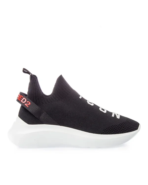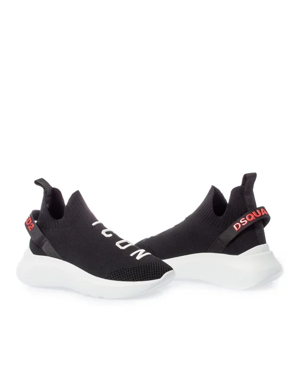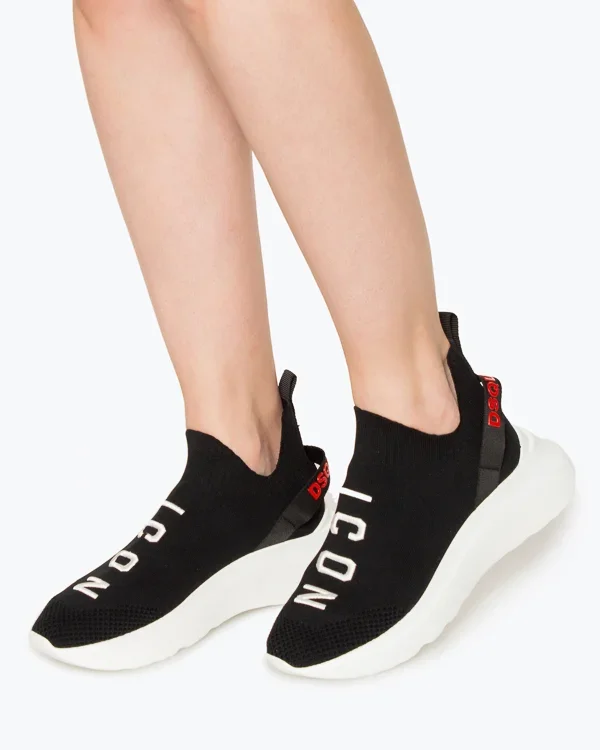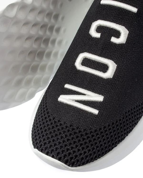 Текстильные кроссовки черного цвета с объемной вышивкой логотипа бренда. Удобная и мягкая пара без застежки дополнена текстильной петлей на пятке. Толстая резиновая подошва белого цвета.