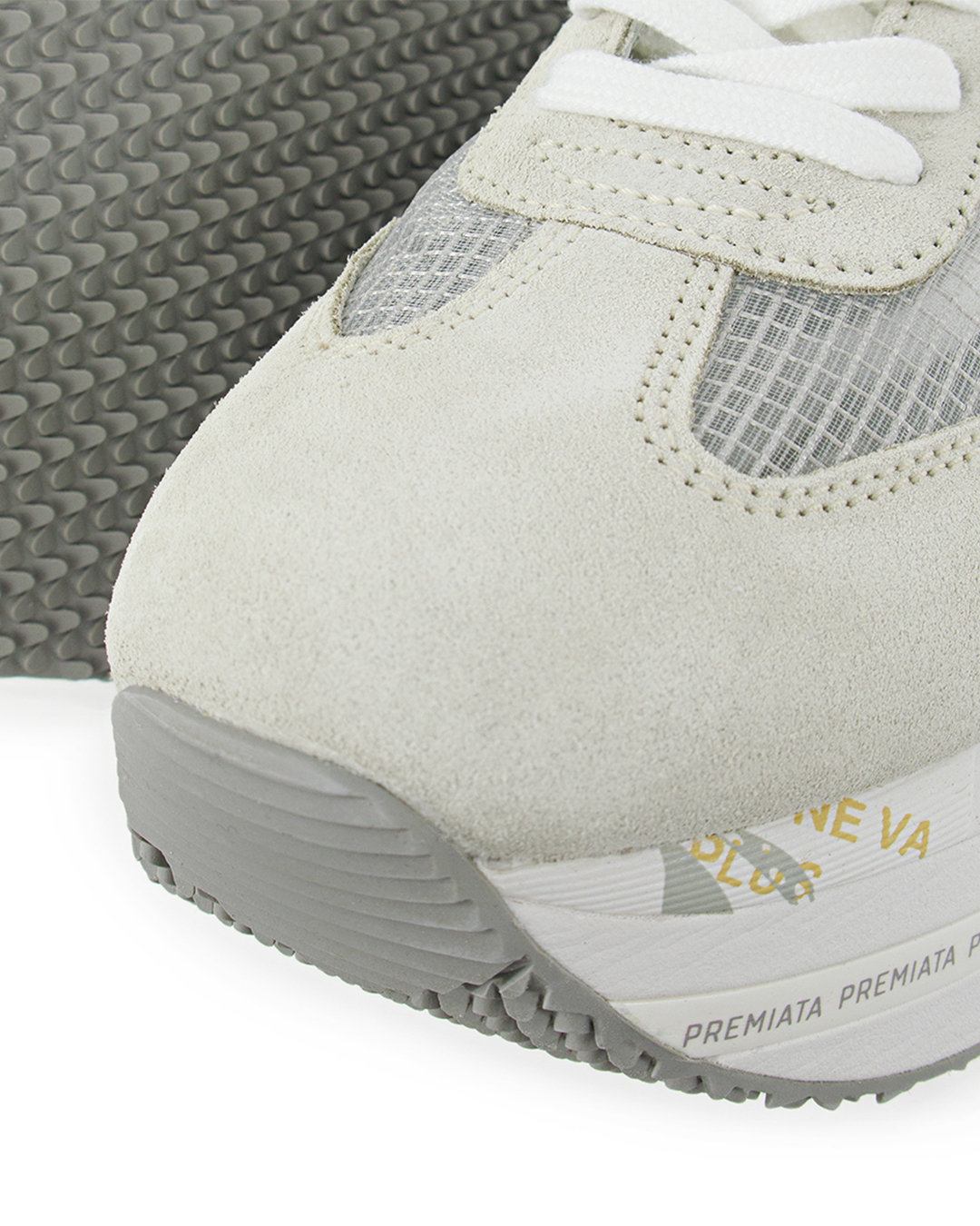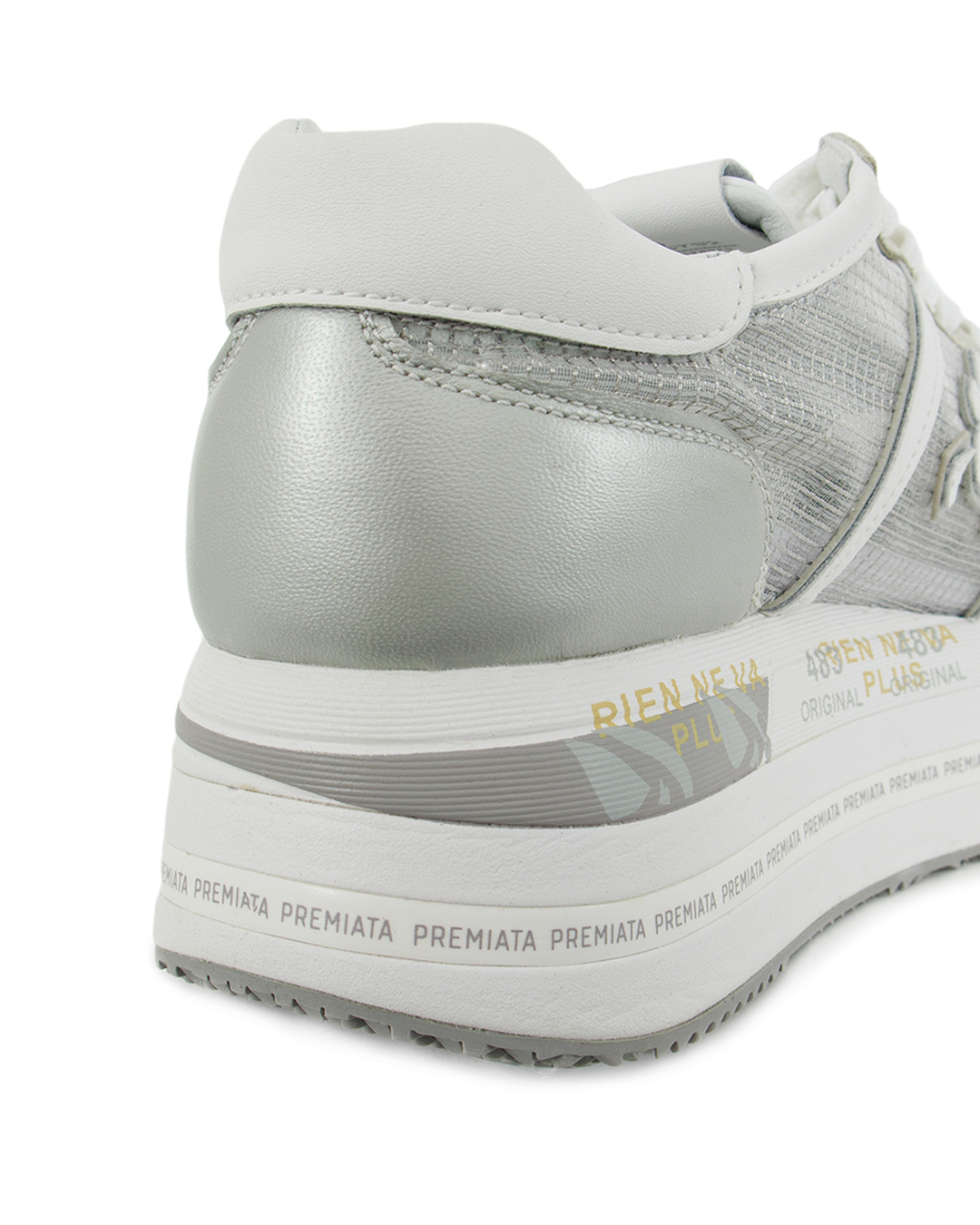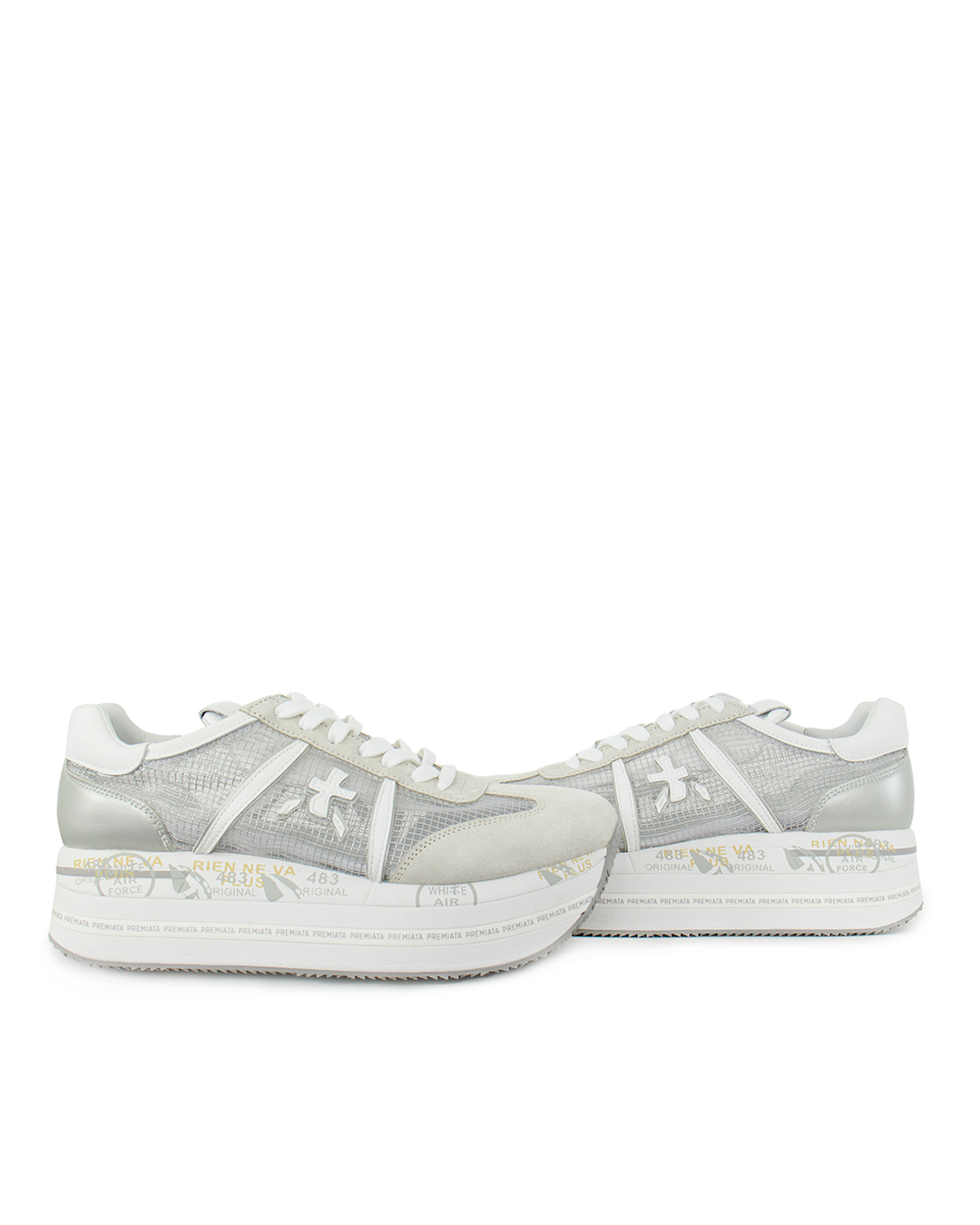 Серебрянные кроссовки Beth сшили из прочного полупрозрачного рипстопа. Модель укрепили накладками из бархатистой замши и серебристой металлизированной кожи. Выполненные из такого же матового материала иероглифы по бокам зарифмовали с отделкой на заднике. Ключевую роль отдали визуально массивной многослойной подошве с печатями и штампами.
