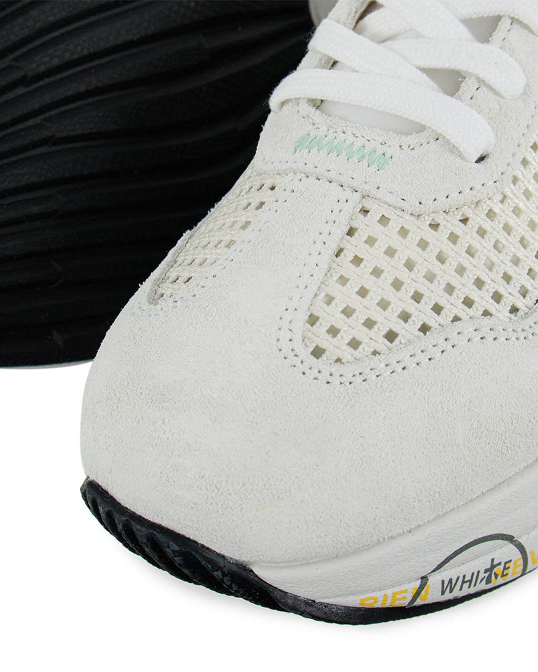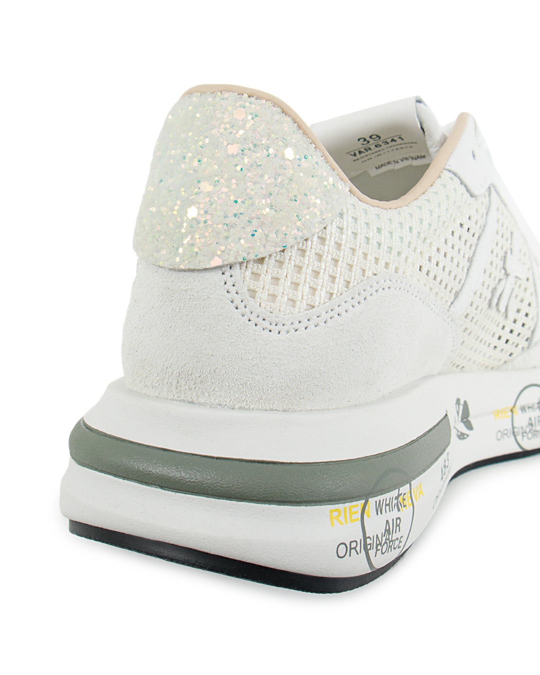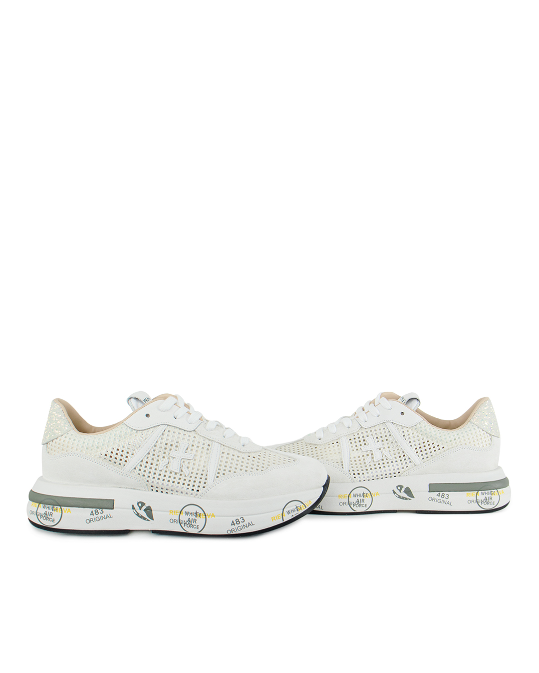 Для пошива белых кроссовок Cassie, вдохновленных 1970-ми, использовали прочный сетчатый текстиль. Ему противопоставили бархатистую замшу, из которой выполнили фигурные нашивки. Для внутренней отделки выбрали мягкую козью кожу и полимер. Задник дополнили накладкой, усыпанной мерцающими глиттером, а берцы украсили традиционными иероглифами. Двухслойную подошву из пеноматериала EVA декорировали изображениями штампов и печатей.