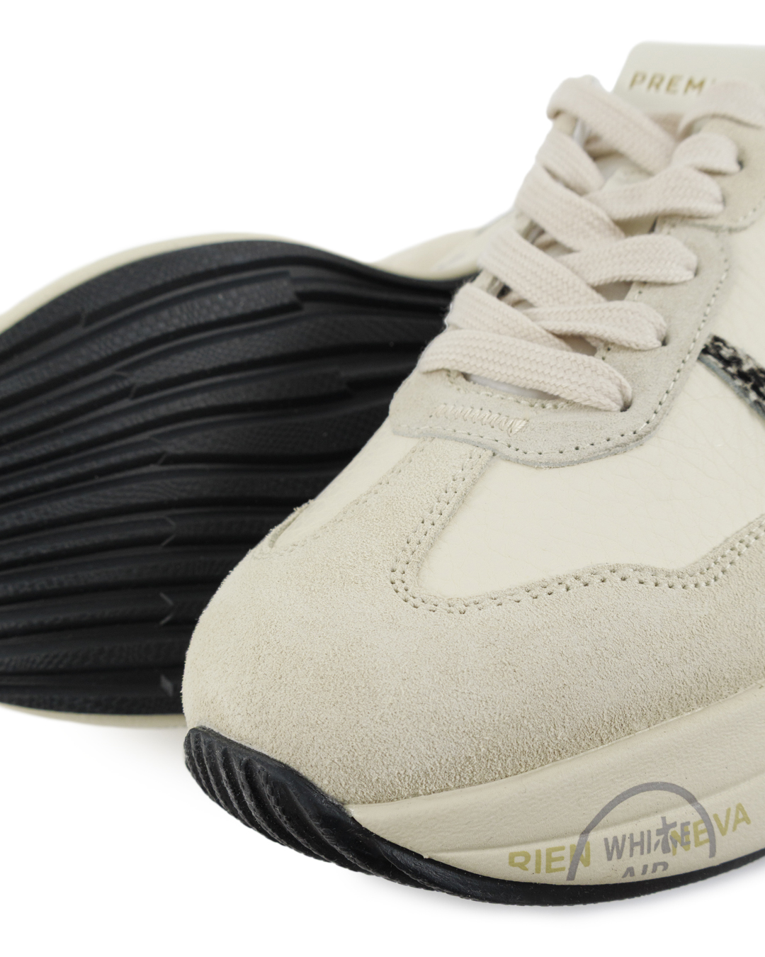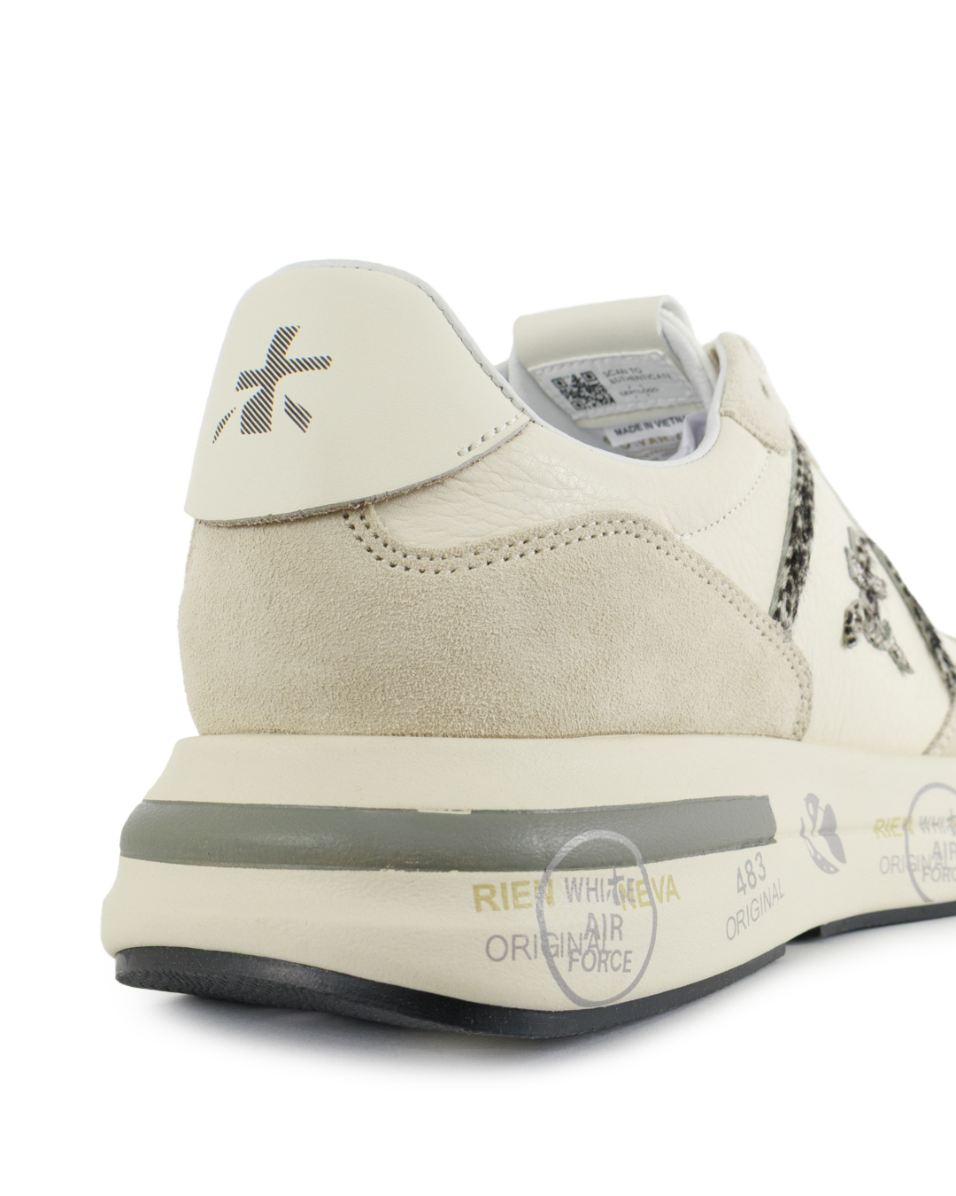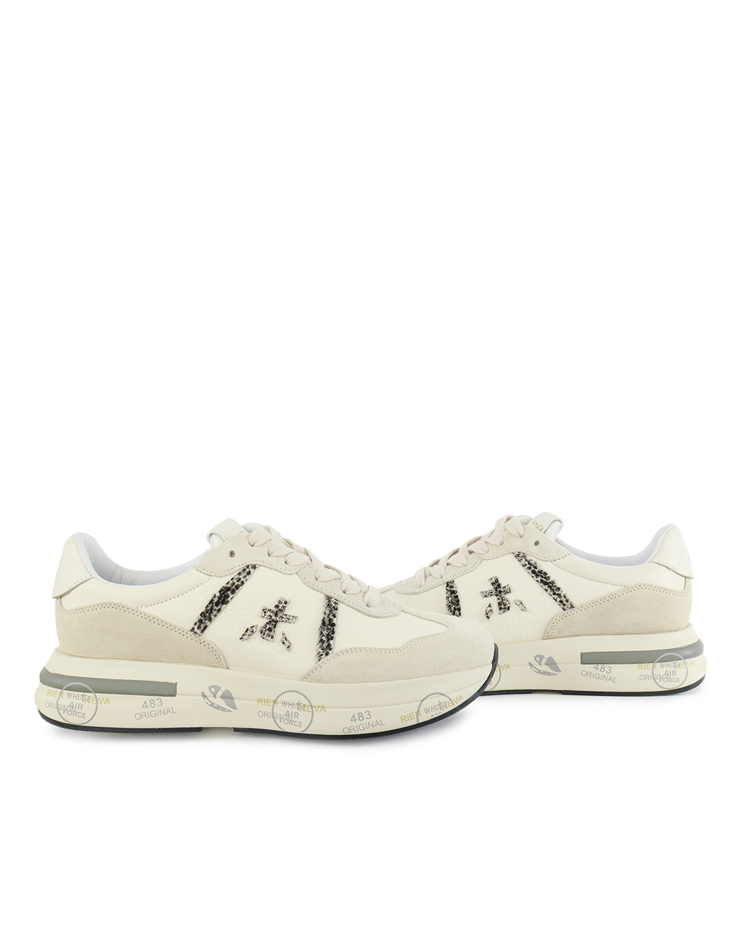 Эти кроссовки — это истинное воплощение утонченной элегантности и минимализма. Выполненные из мягкой кожи и замши в благородном кремовом оттенке, они создают безупречно чистый и изысканный образ, идеально подходящий для современного гардероба. Декоративные элементы с текстурой рептилии добавляют облику нотку экзотики, интегрируясь в общий дизайн с тонкой деликатностью. Логотип в виде изысканной вышивки выделяется на фоне, придавая кроссовкам узнаваемость и шарм. Подошва, украшенная графическими акцентами и фирменными надписями, представляет собой идеальный баланс стиля и комфорта, обеспечивая отличную амортизацию. Эти кроссовки станут гармоничным дополнением как повседневных, так и более формальных образов, привнося в них стильный и современный акцент.