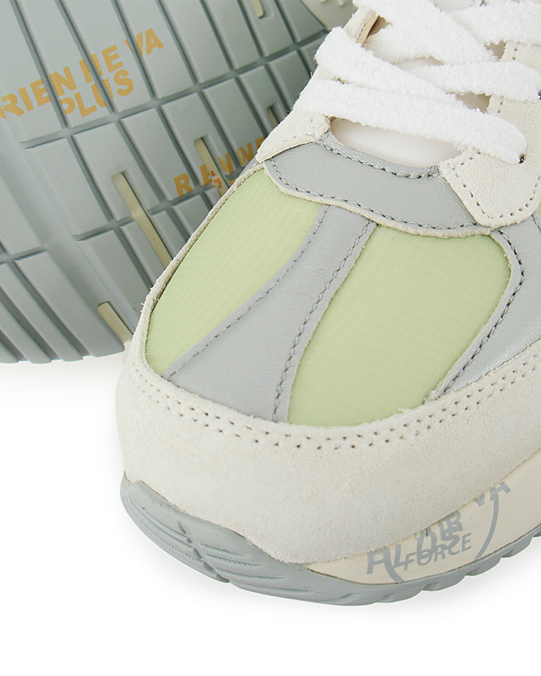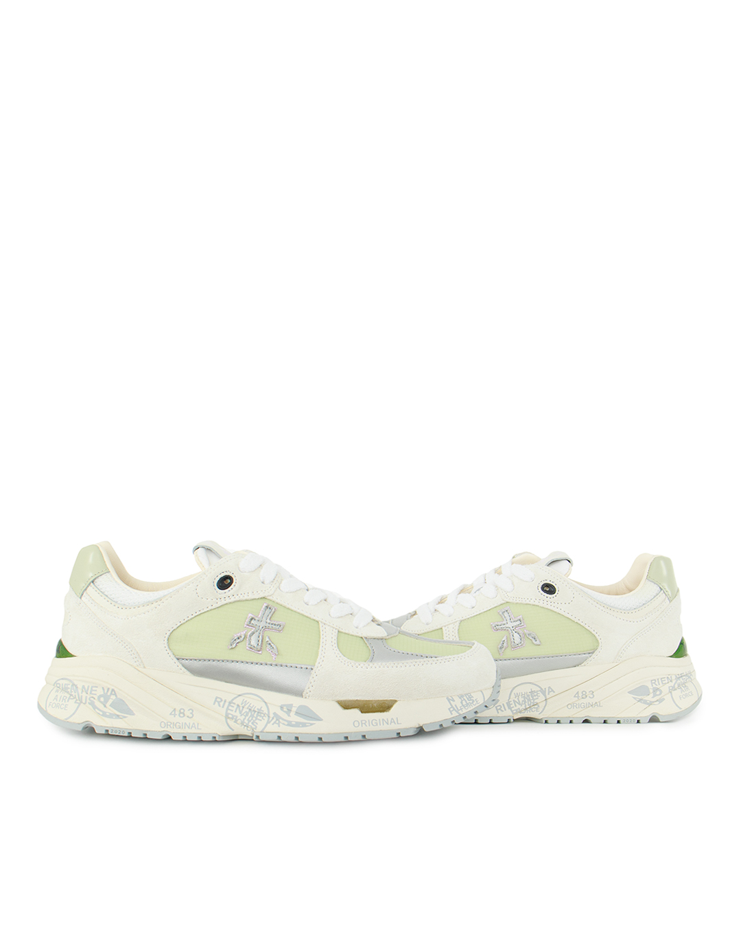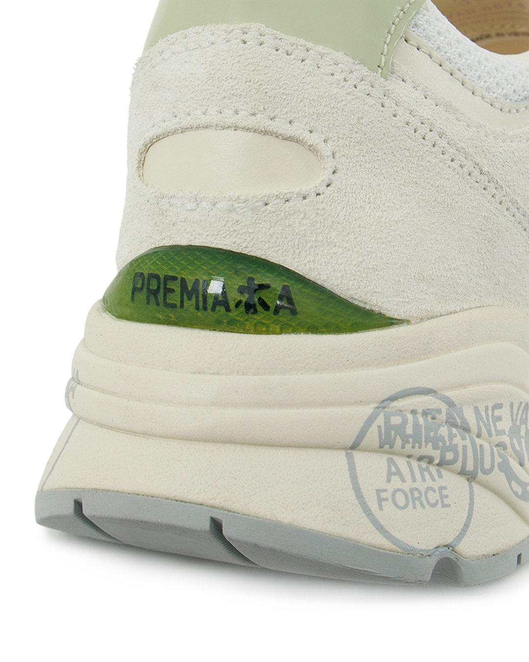 Белые с зеленой вставкой текстильные кроссовки PREMIATA. Удобная и практичная модель декорирована аппликациями в виде иероглифа по бокам.