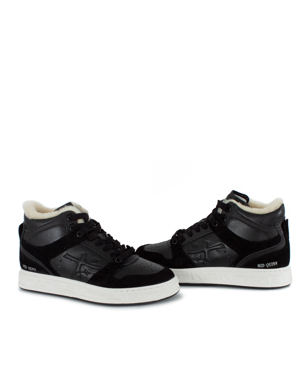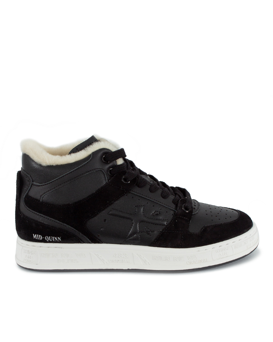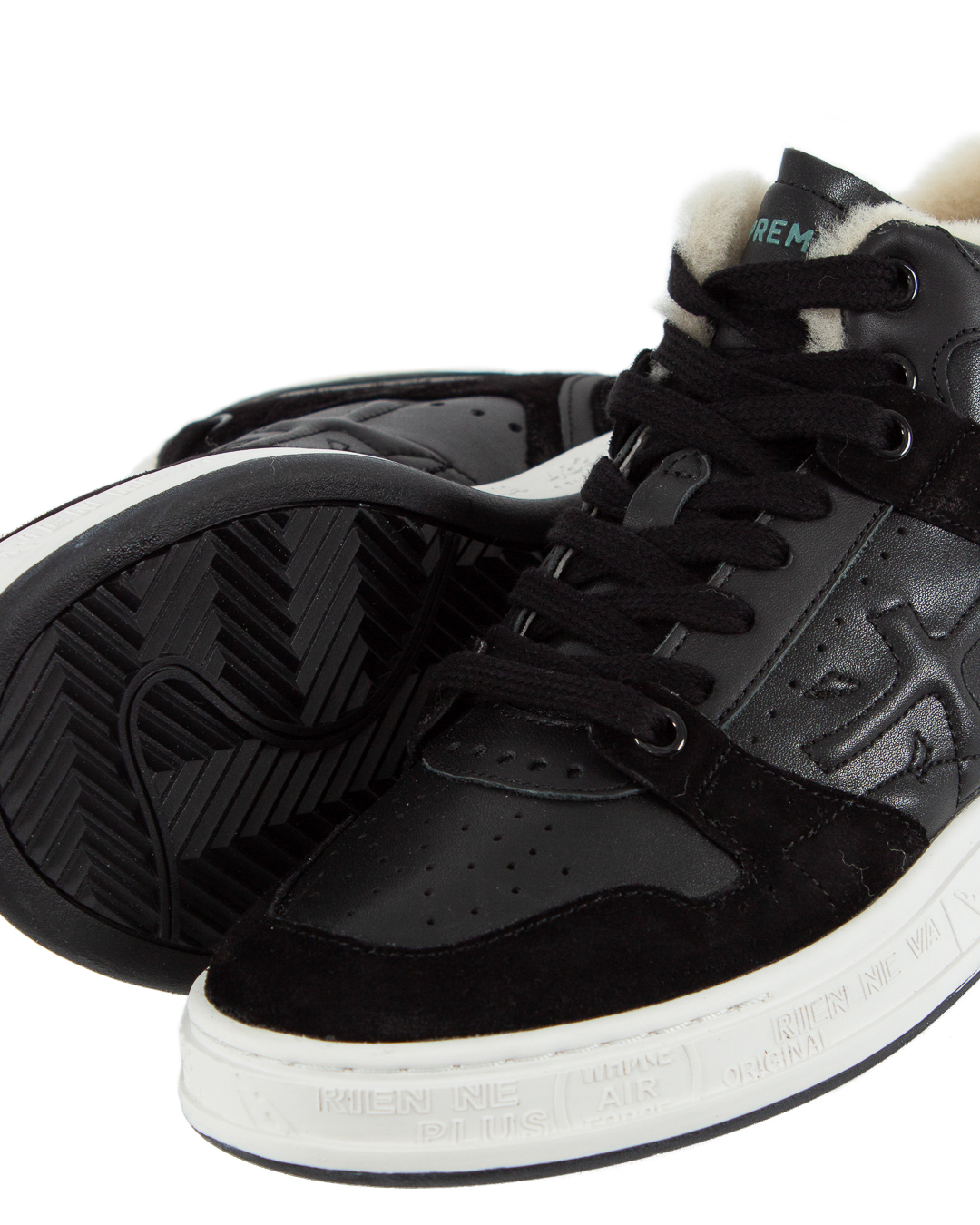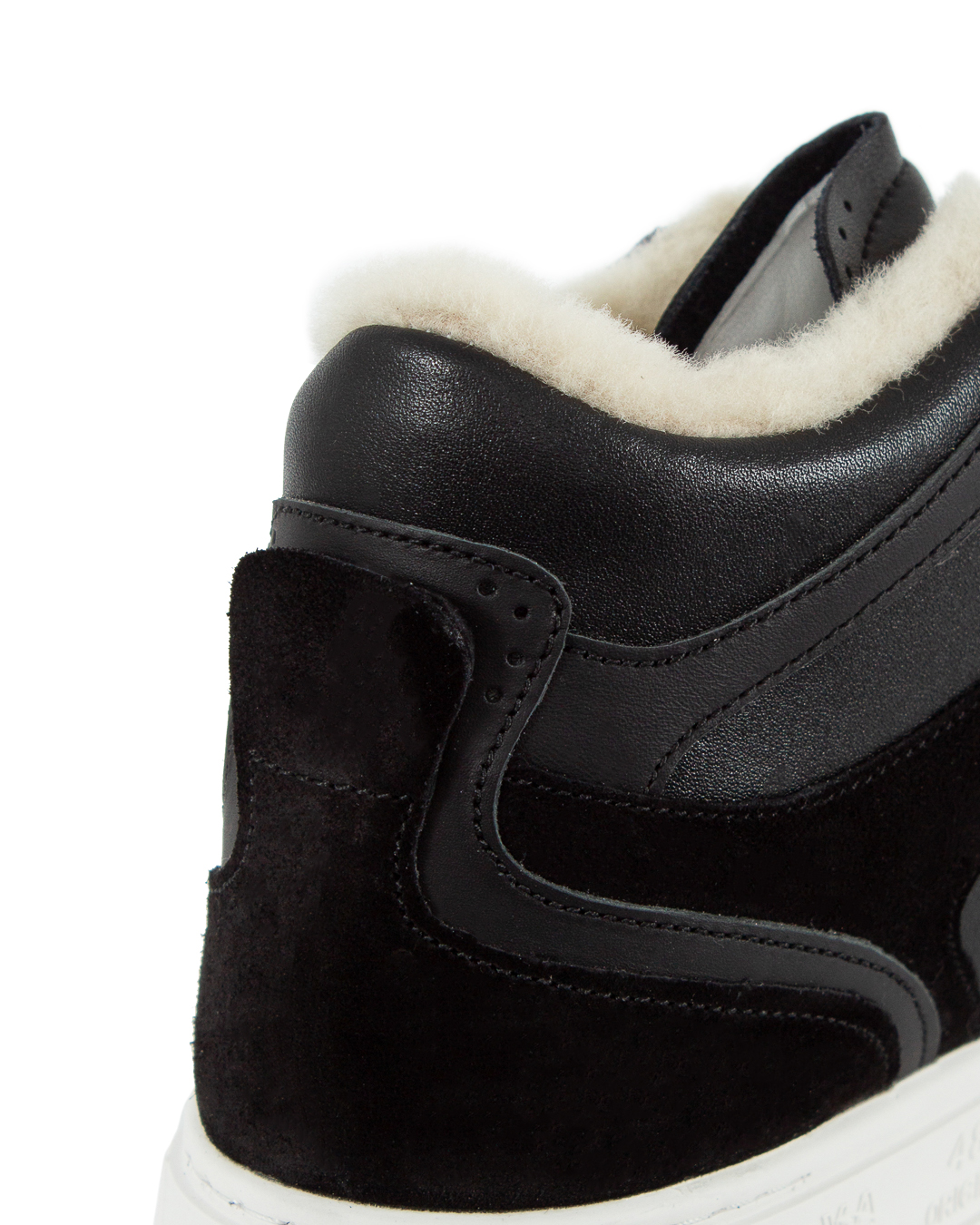 Утепленные кеды Premiata sport из кожи черного цвета. Высокая пара на шнуровке дополнена брендированным язычком и толстой резиновой подошвой с прошитым рантом.