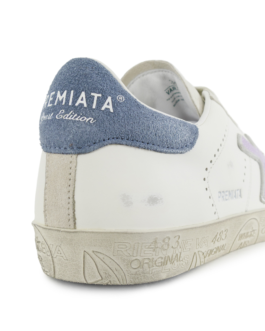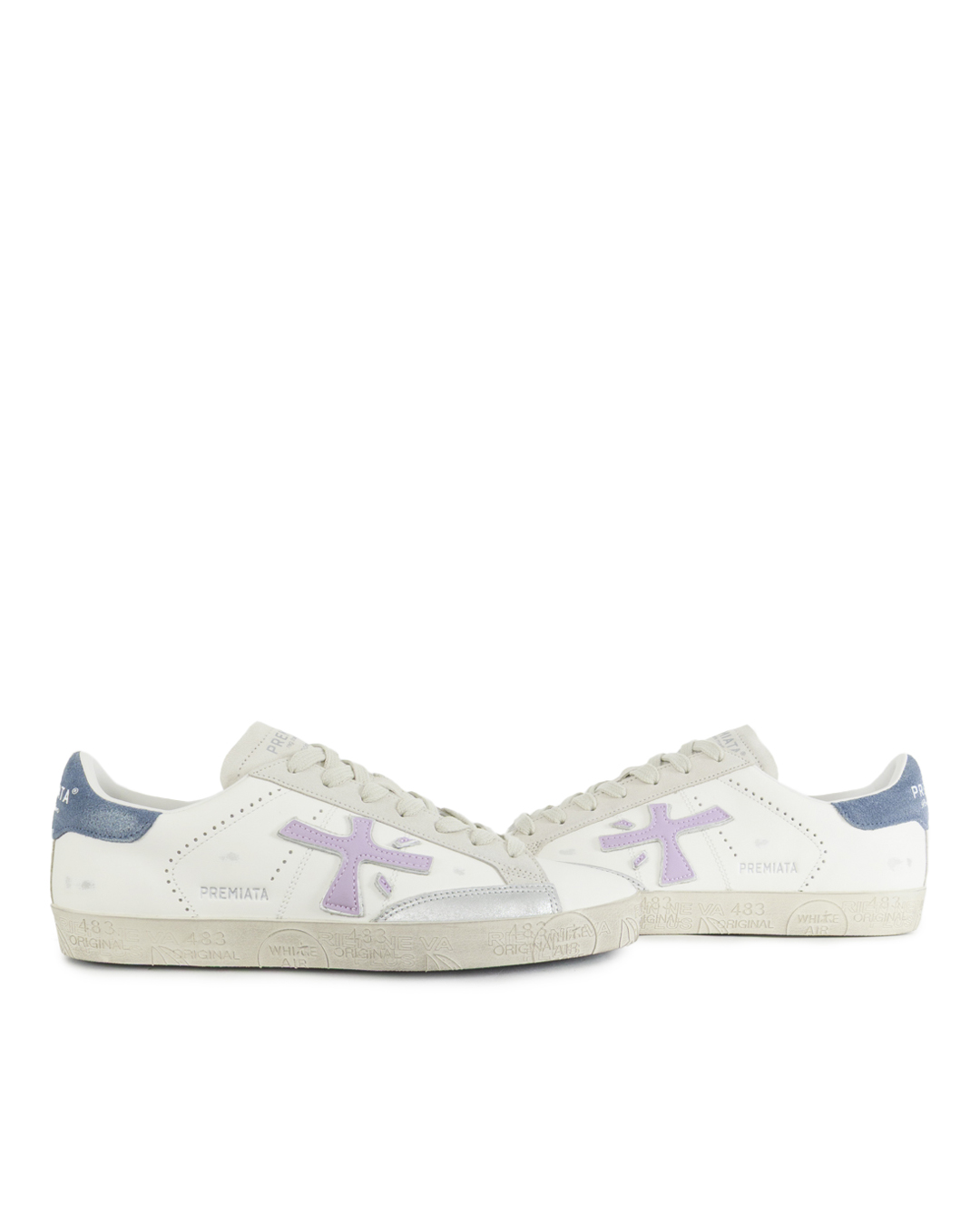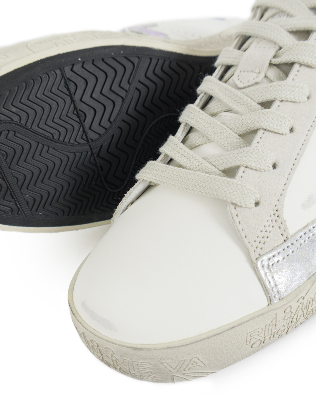 Белые кеды STEVEN из натуральной кожи с потёртостями и пастельными акцентами. Плоская шнуровка с люверсами, по бокам фирменная аппликация. Гибкая подошва с декоративными загрязнениями и рельефными печатями, брендированные язычки, задники с замшевой отделкой и логотипом.