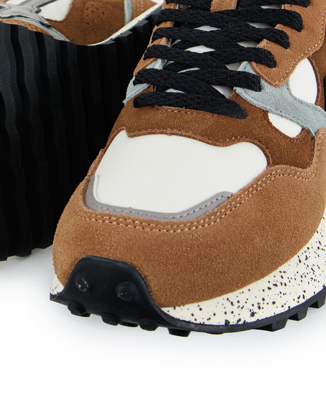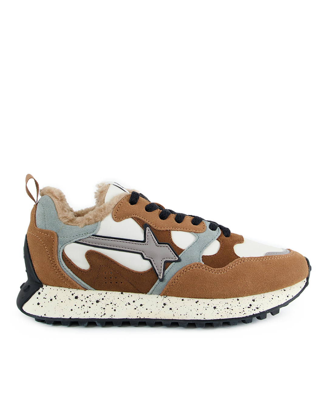 Эти кроссовки впечатляют своим оригинальным дизайном и превосходным сочетанием материалов. Верхняя часть выполнена из замши и эластичного текстиля, что создает интересную фактурную игру и гарантирует идеальную посадку.   Цветовая палитра включает в себя теплые коричневые и нежные голубые оттенки, придавая модели современную харизму. Изюминкой являются изящные звёздные вставки на боках, выполненные из гладкой кожи, что добавляет динамики и яркости.  Утепленная внутренняя часть с мягкой меховой отделкой обеспечивает необычайный комфорт и подходит для холодного времени года. Подошва контрастного белого цвета с черными краплениями создает эффектный визуальный акцент и обеспечивает надежное сцепление с поверхностью благодаря глубокому протектору.  Завершает образ продуманная деталь — петелька на пятке для удобного надевания, подчёркивающая функциональность и внимание к деталям. Эти кроссовки станут ключевым элементом стильного гардероба, сочетая в себе практичность и модный дизайн.