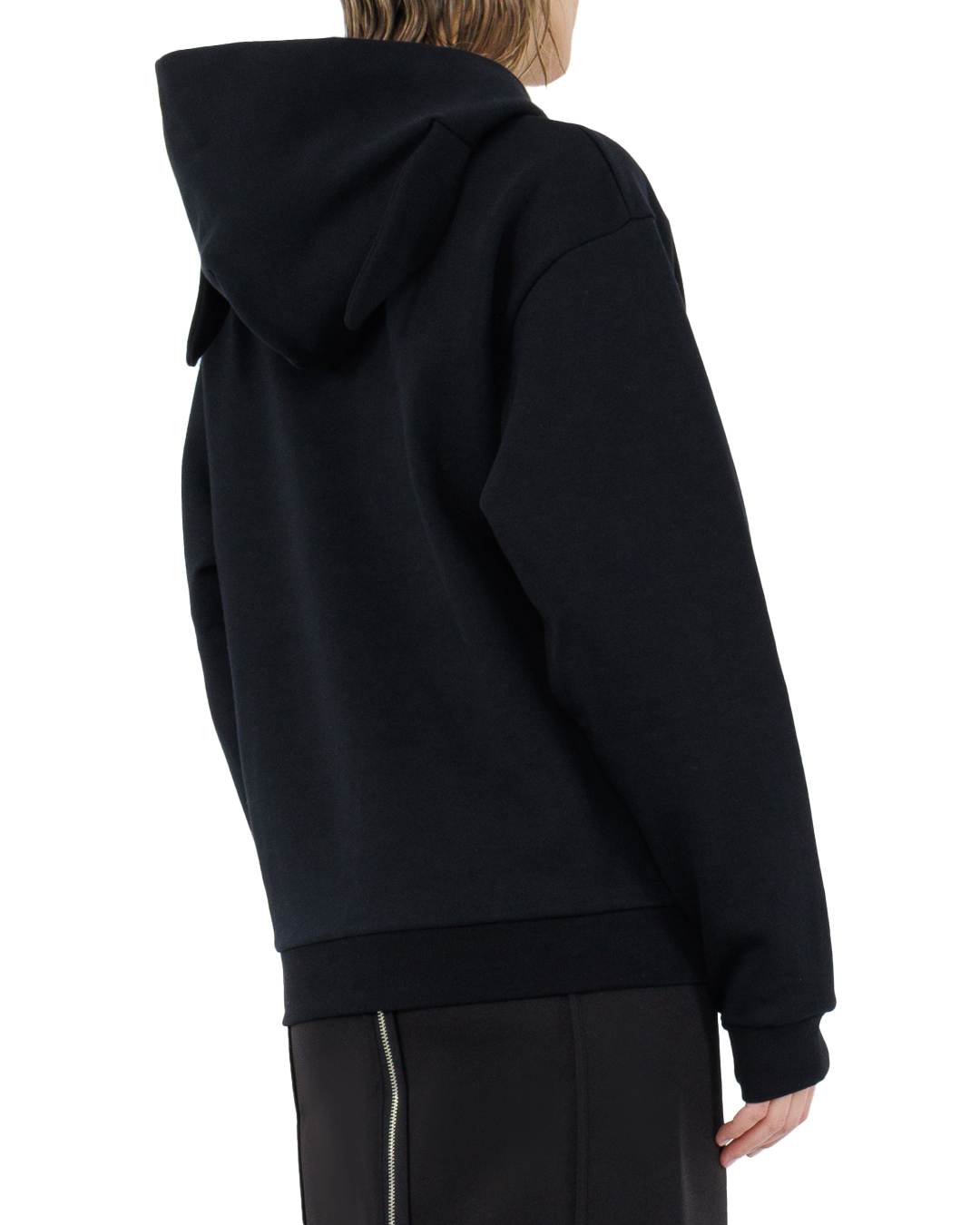 Это стильное худи черного цвета станет незаменимым элементом вашего гардероба, идеально подходя как для повседневной носки, так и для создания модных образов. Изготовленное из мягкого и приятного на ощупь материала, оно обеспечивает комфорт и тепло в прохладную погоду. Модель свободного силуэта предлагает свободу движений и расслабленный стиль, что делает её идеальной для активного образа жизни или уютных вечеров дома. Капюшон с оригинальными "рожками" добавляет игривый и креативный акцент, делая худи уникальным и запоминающимся. Логотип бренда, расположенный на груди, подчеркивает вашу приверженность к стилю и качеству. Он выполнен в контрастном цвете, что делает его заметным и придает изделию современный вид. Худи легко комбинируется с джинсами, леггинсами или спортивными брюками, создавая непринужденный образ для прогулок по городу или встреч с друзьями. Также его можно надеть поверх футболки или топа для создания многослойного стиля. С этим худи вы сможете выразить свою индивидуальность и добавить в свой образ нотку оригинальности и креативности!