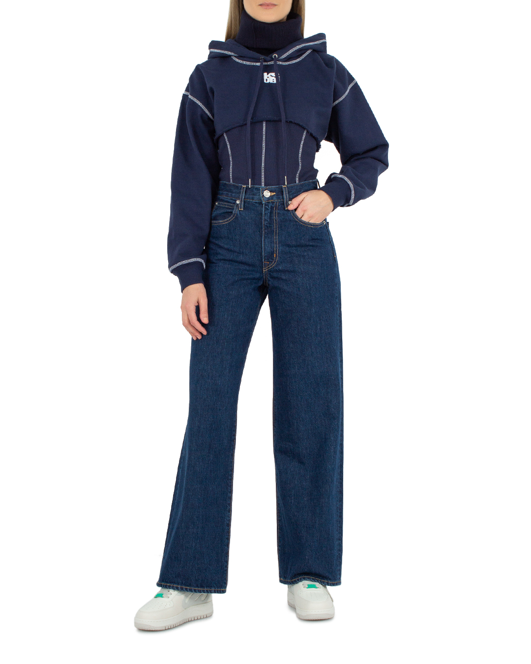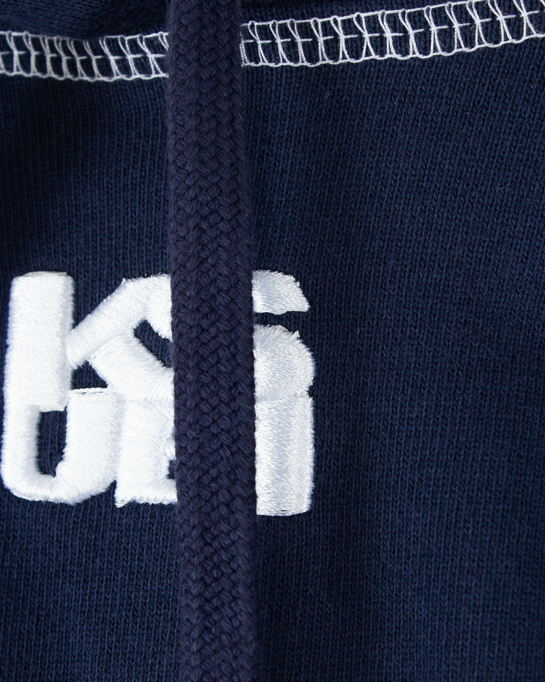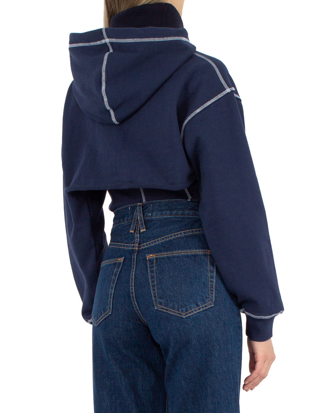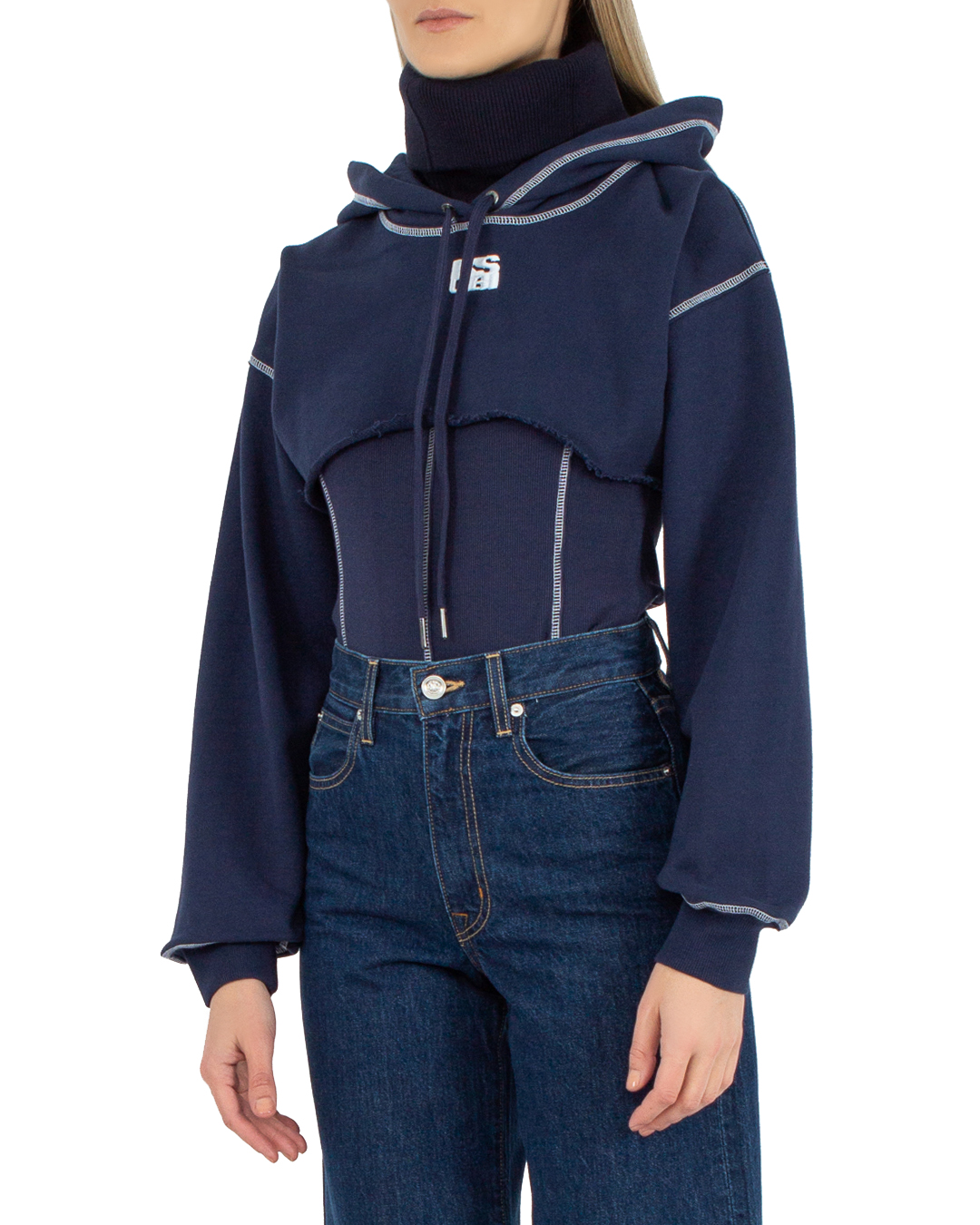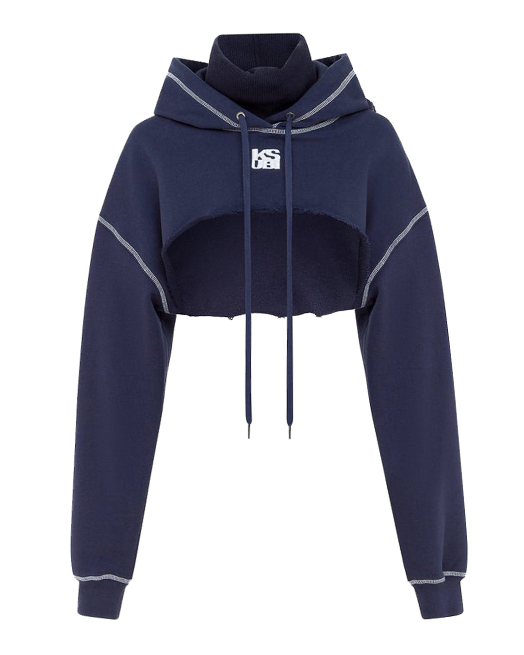 Укороченный худи KSUBI из трикотажного хлопка с контрастными швами. Модель объемного силуэта с капюшоном с завязками и необработанной линией низа.