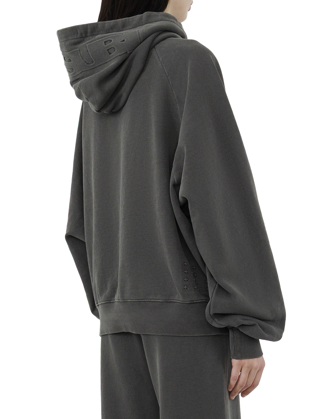 Это худи — воплощение современного стиля и удобства. Изделие выполнено в глубоком темно-сером цвете, что придает ему универсальность и изысканность. Мягкая ткань обеспечивает максимальный комфорт, делая худи идеальным выбором для повседневной носки.  Раглановые рукава добавляют динамичности и обеспечивают свободу движений, придавая модели спортивный и одновременно стильный вид. Классический капюшон оснащен регулируемыми шнурками, позволяя адаптировать изделие под индивидуальные предпочтения.  Центральный карман-кенгуру добавляет практичности и служит удобным местом для хранения мелочей или согревания рук. Незаметные, но утонченные элементы отделки, такие как логотип на груди, добавляют характер и индивидуальность, акцентируя внимание на брендовом стиле.  Манжеты и нижний край с резинкой обеспечивают плотное прилегание и сохраняют тепло, добавляя изделию законченный вид. Это худи станет незаменимой частью гардероба, сочетая в себе комфорт и модный облик, идеально подходя для любых повседневных ситуаций.