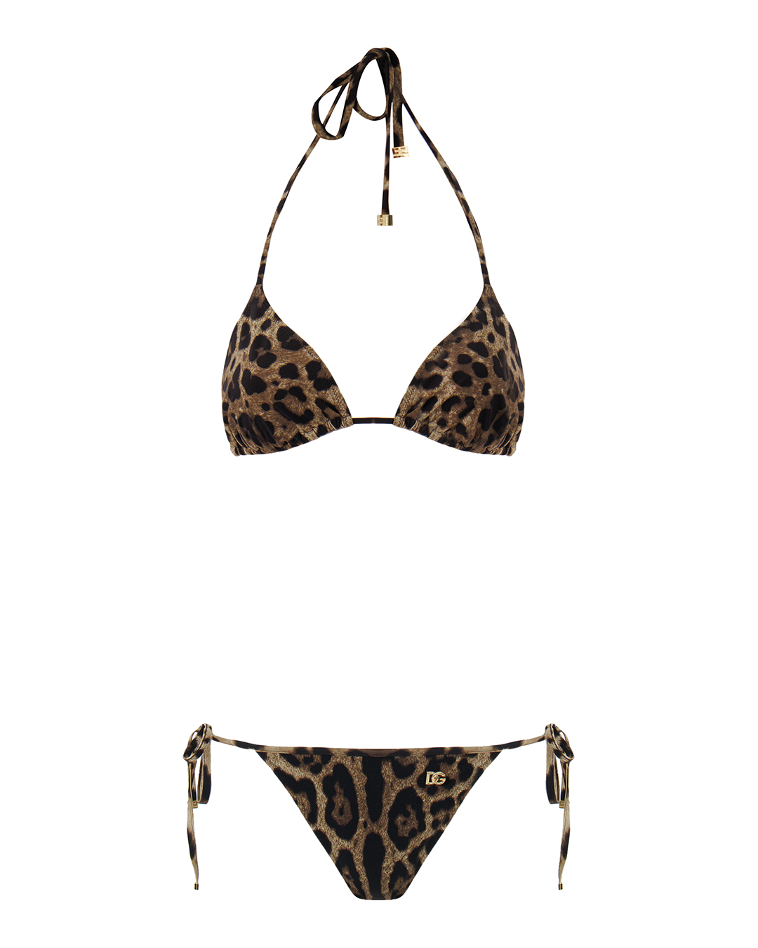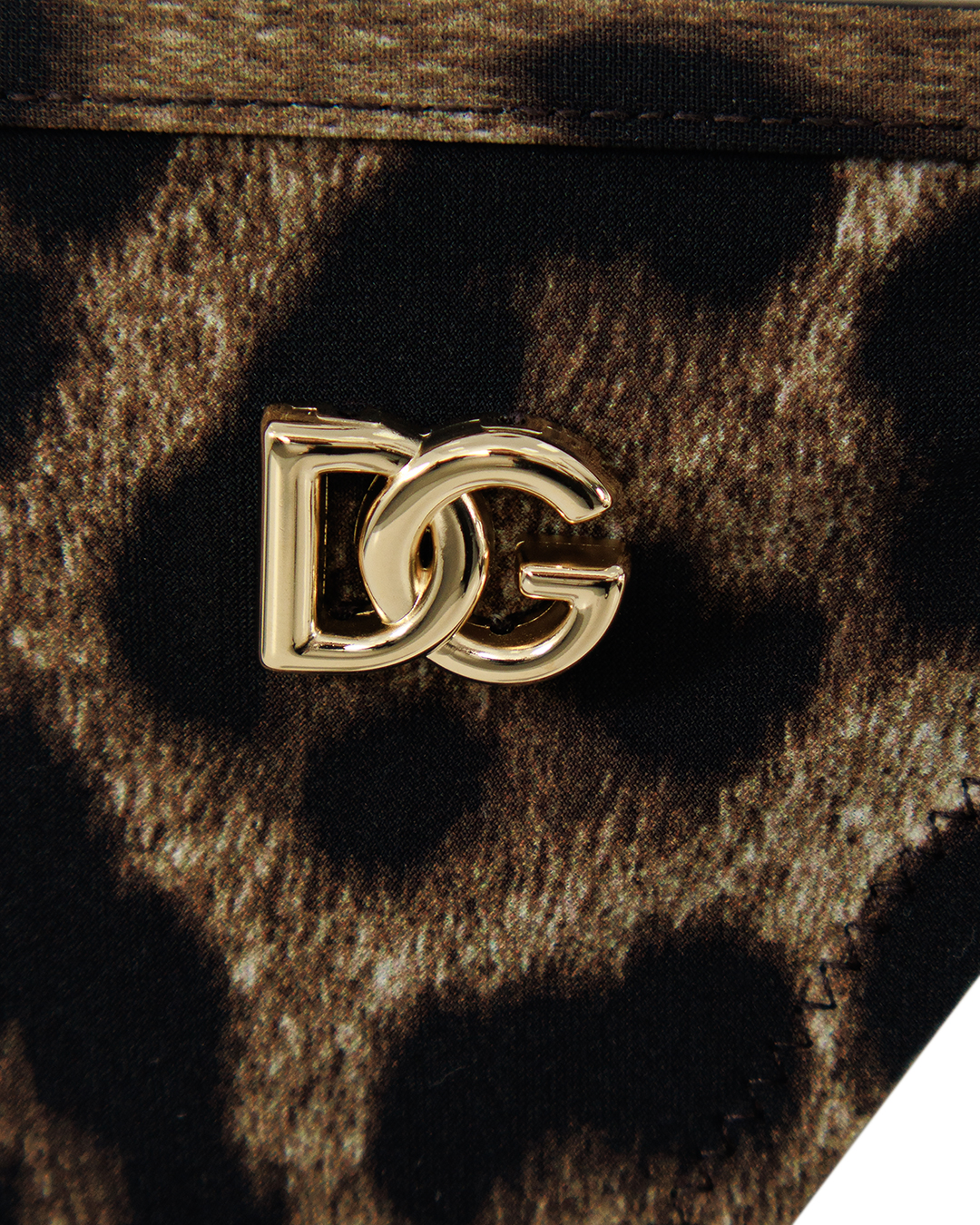 Купальник с леопардовым принтом и комбинированным составом от DOLCE&GABBANA- это модель с мягкими подвижными чашками, завязками на спине, классическими плавками на завязках дополнены оригинальной деталью в виде логотипа DG из металла без содержания никеля. Полотно, сотканное из смеси полиамида и эластана, не вытягивается, быстро высыхает и не выгорает на солнце, а также устойчиво к агрессивной хлорированной и соленой морской воде.