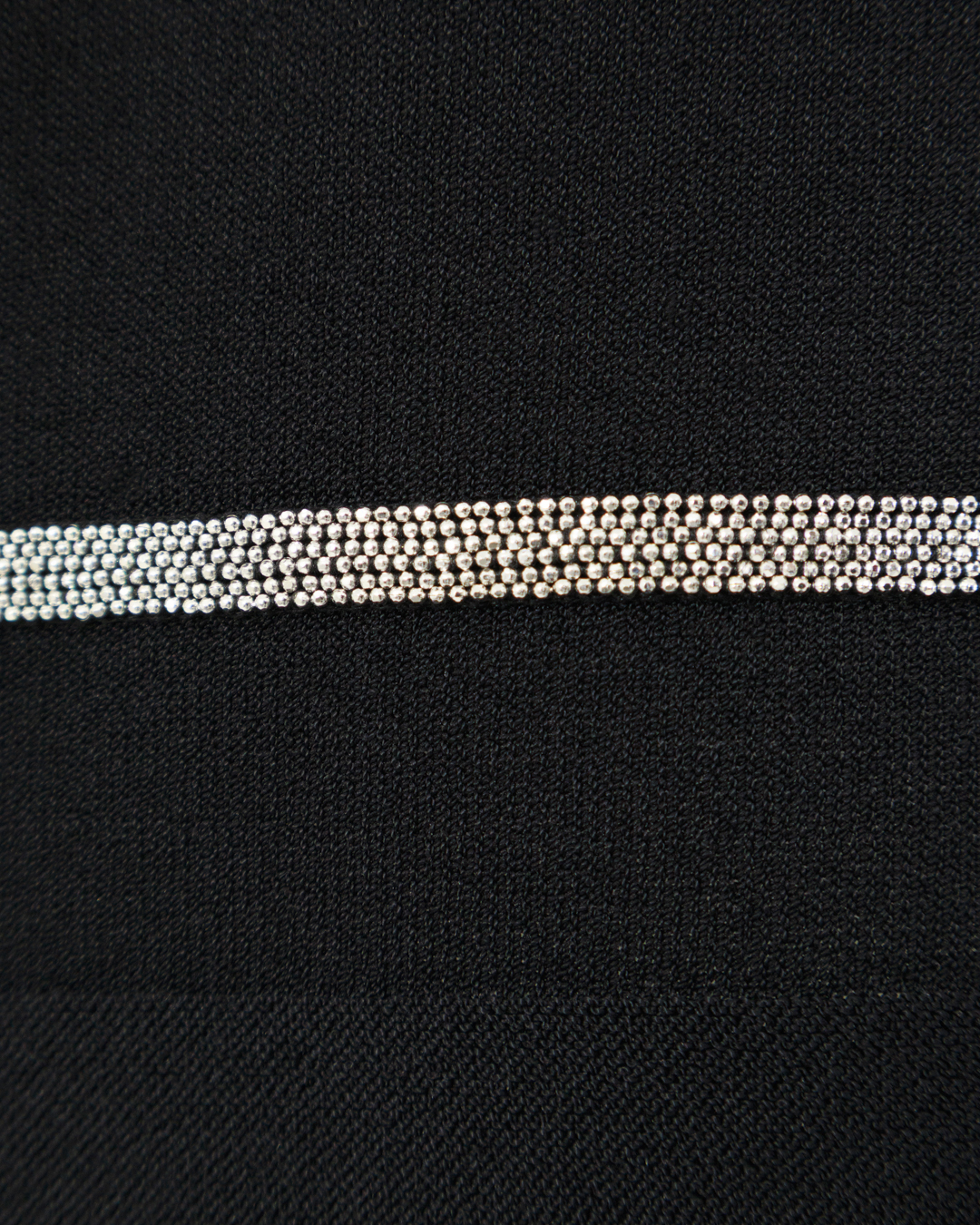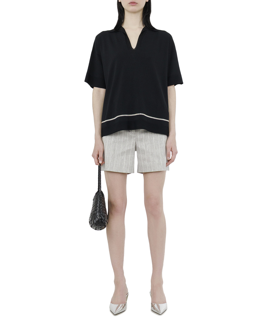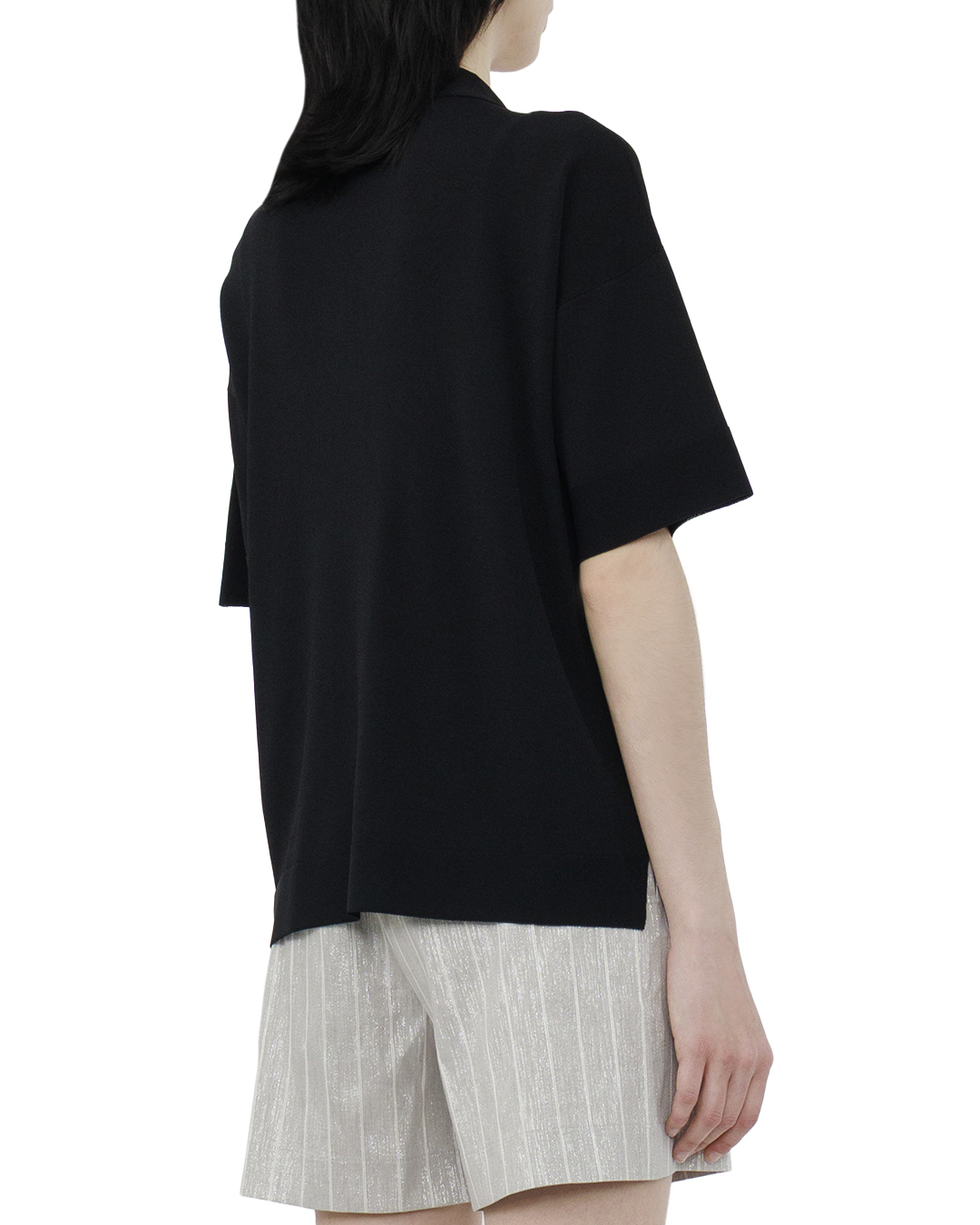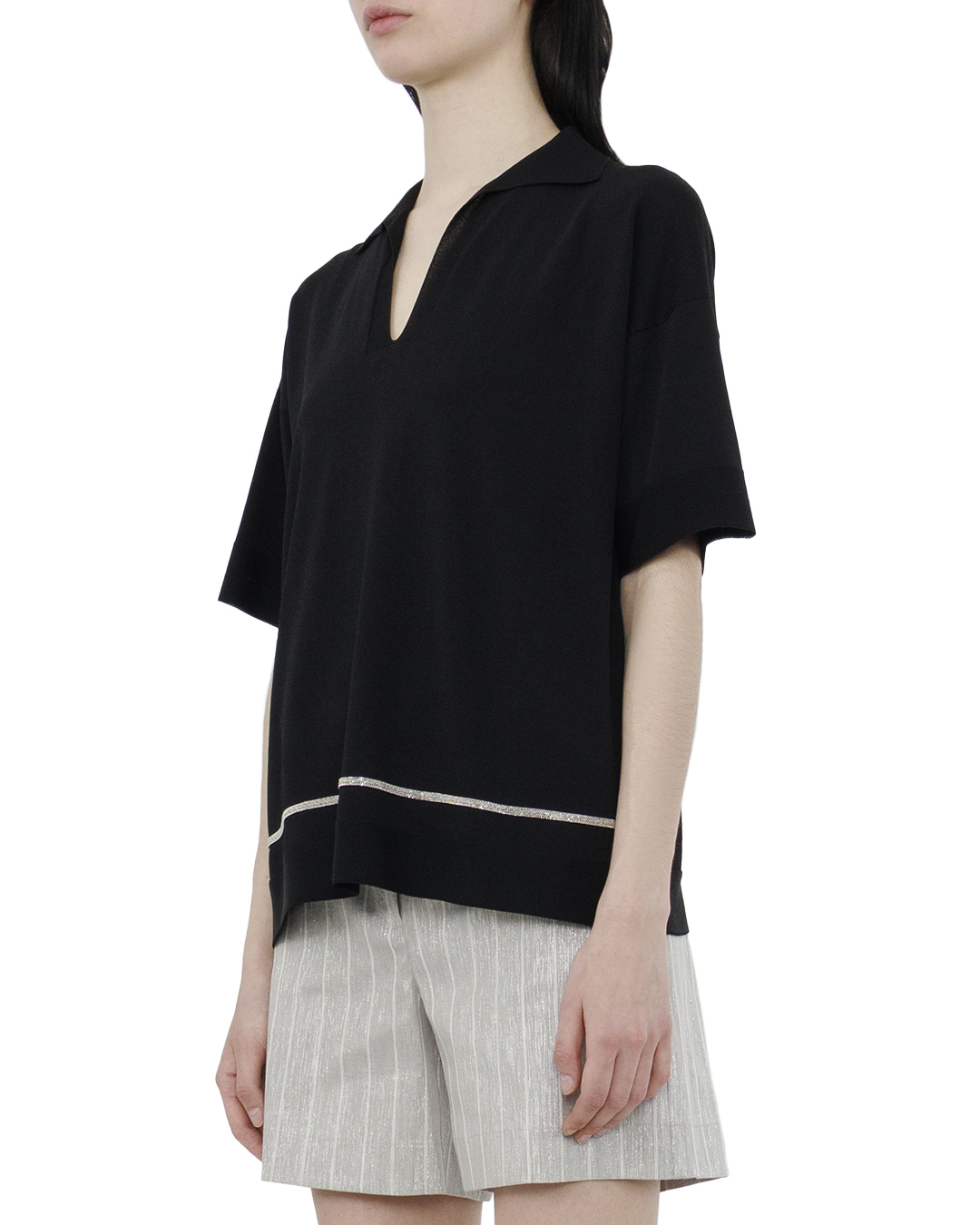 Стильное вязаное поло выполнено из мягкой и легкой вискозы, что обеспечивает комфорт и приятные ощущения при носке. Насыщенный черный цвет делает его универсальным элементом гардероба, подходящим для различных стилей и случаев. Поло имеет отложной воротник, который добавляет элегантности и завершенности образу. Контрастная полоска по линии подола из металических нитей придает изделию интересный акцент и делает его более выразительным. Короткие рукава обеспечивают свободу движений и идеальны для теплой погоды. Расклешенный силуэт создает эффектный вид, подчеркивая фигуру и добавляя женственности. Это поло отлично подойдет как для повседневного ношения, так и для более формальных мероприятий. Сочетайте его с юбками, брюками или шортами для создания стильных образов на любой случай!