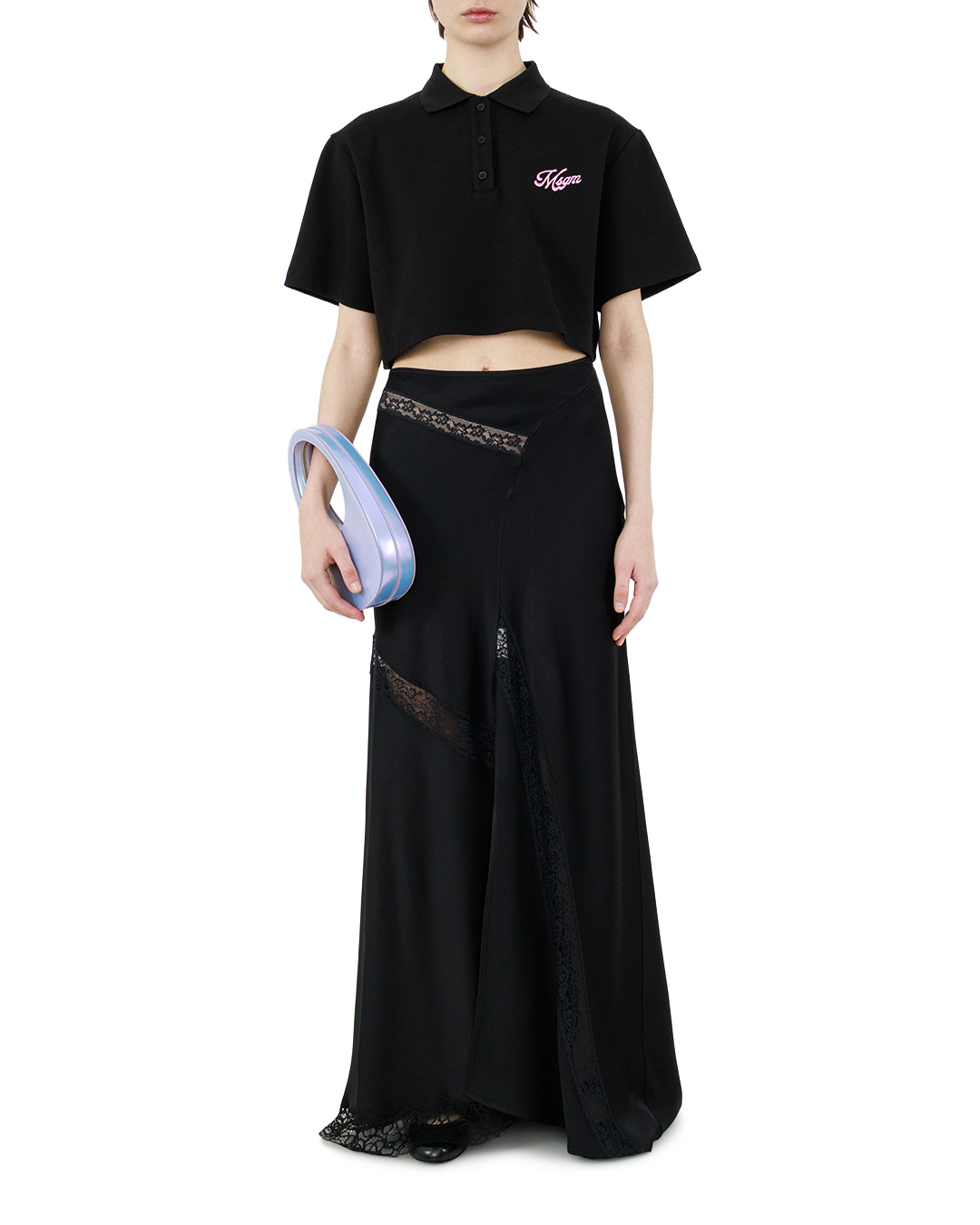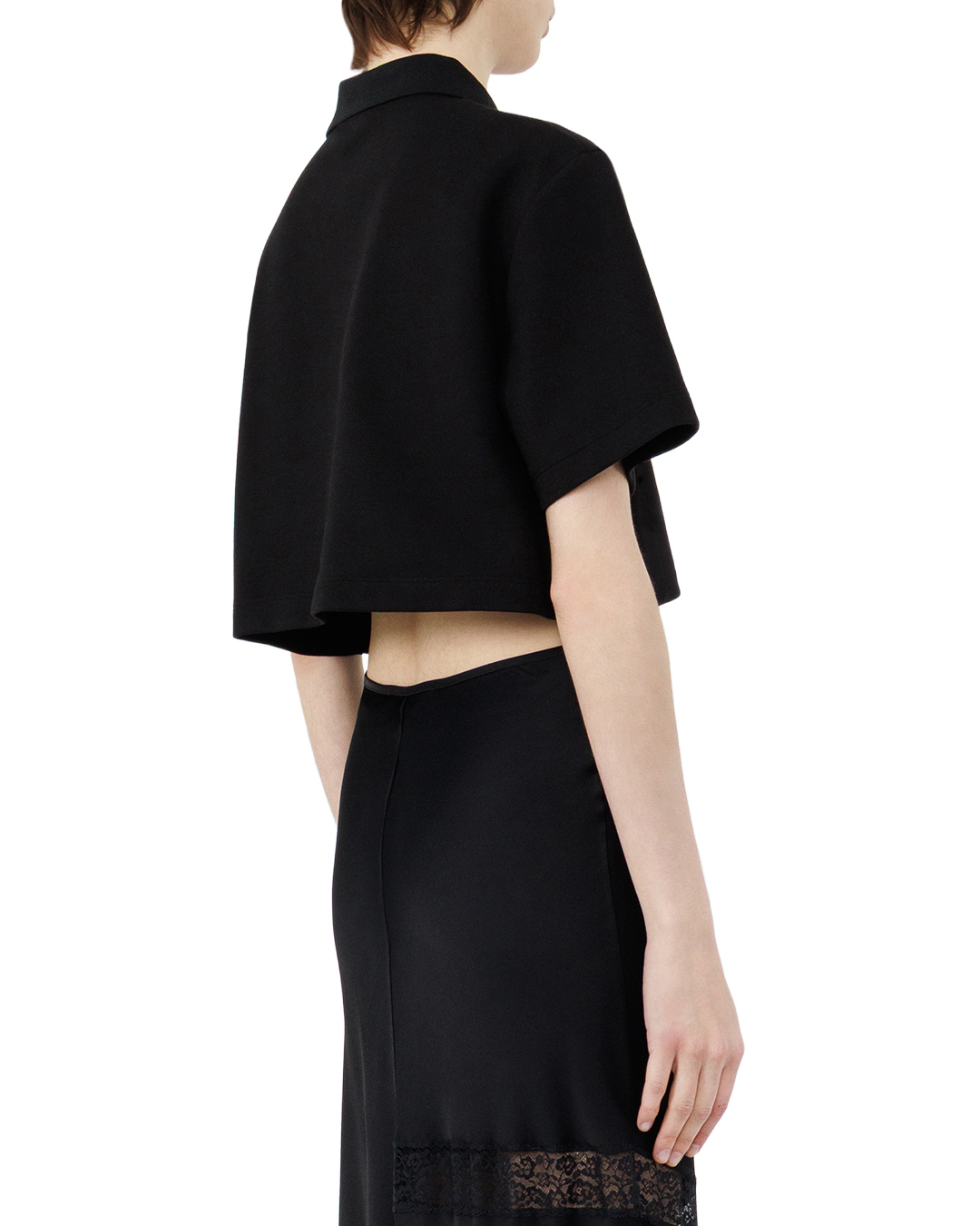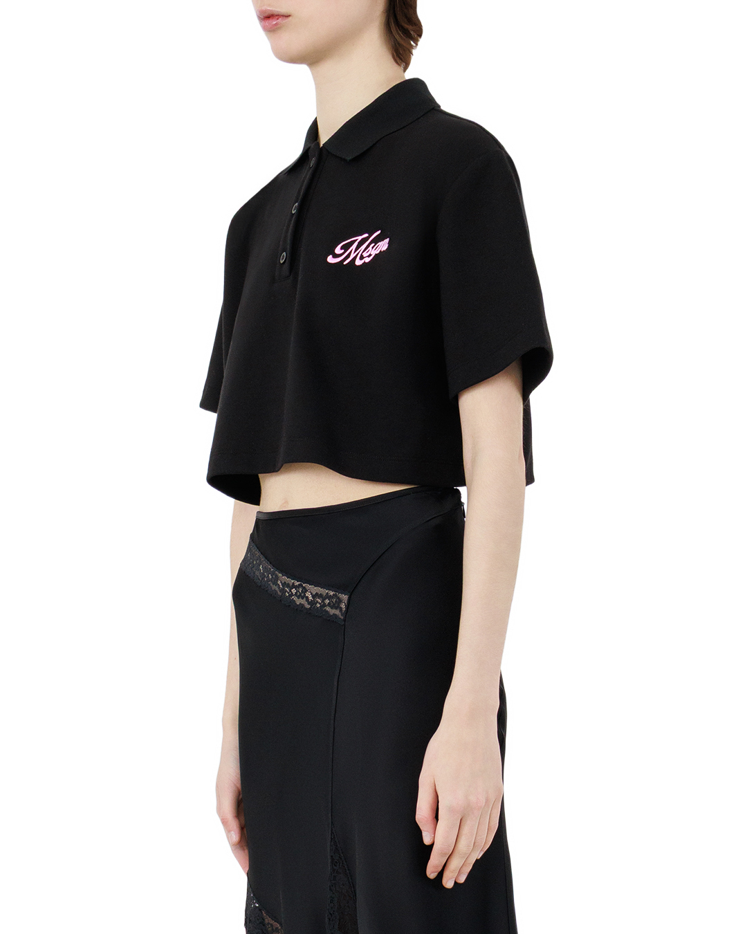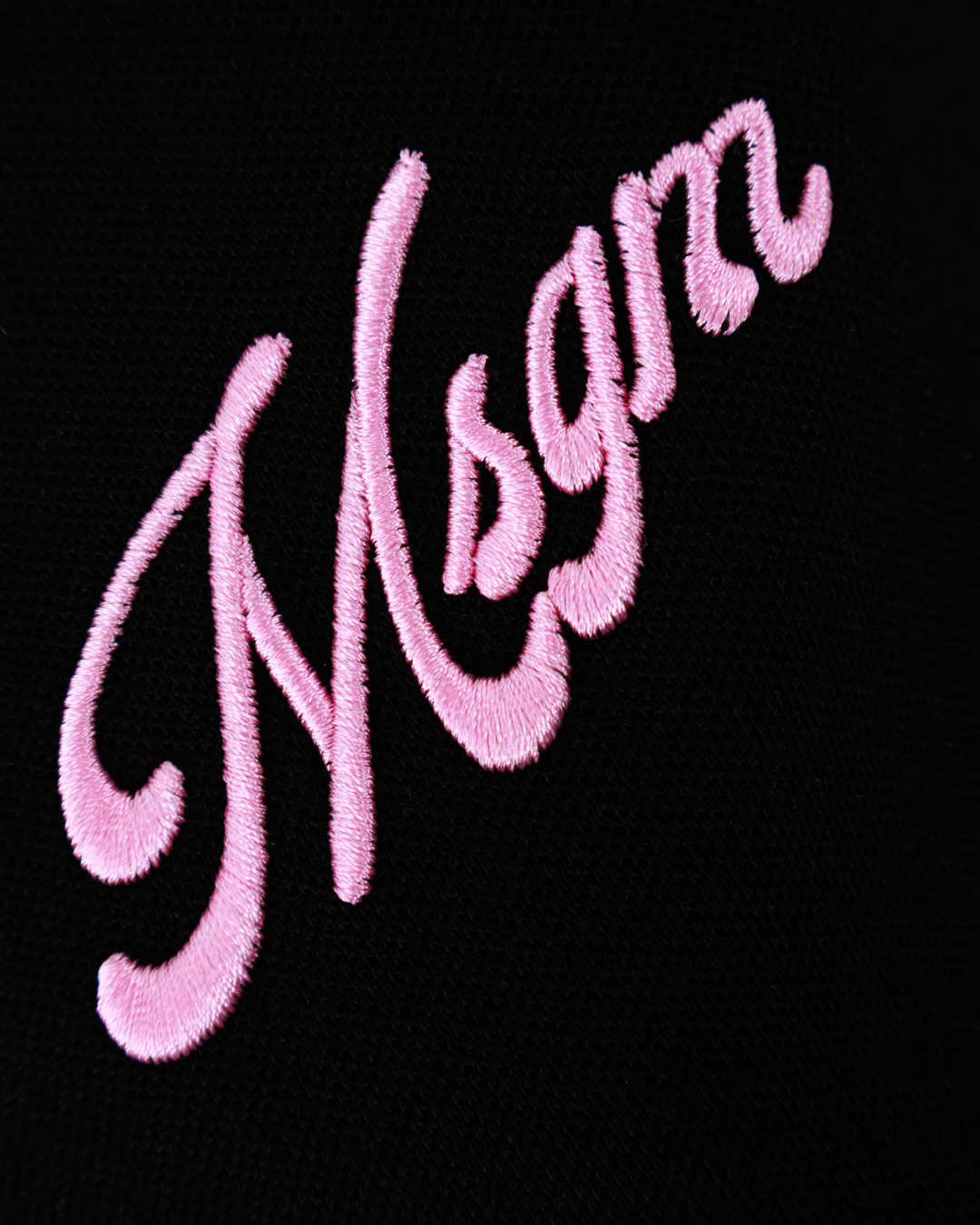 Это укороченное поло глубокого чёрного оттенка — образец современного лаконизма с изысканным акцентом. Классический крой с отложным воротником и планкой на пуговицах переосмыслен в более дерзкой, молодёжной интерпретации за счёт укороченного силуэта, который придаёт модели динамичность и актуальность. Ровная линия плеча и лаконичные короткие рукава создают ощущение собранности, при этом не сковывают движения. Планку украшают три аккуратные пуговицы, расположенные строго по вертикали — этот элемент придаёт изделию структурированность и визуальную чёткость. Воротник выполнен с особой тщательностью: чёткие контуры и плотная посадка подчёркивают линию шеи, добавляя образу элегантности. Изящный штрих — вышитый логотип в левой части груди. Нежная розовая расцветка вышивки создаёт тонкий контраст с основным цветом изделия, не перегружая общий вид, а лишь добавляя нотку игривости и индивидуальности. Симметрия кроя и безупречная отстрочка по швам подчёркивают качество пошива, превращая эту модель в выразительный элемент гардероба. Поло сочетает в себе классику и современные тенденции, становясь идеальной базой для создания образов в стиле casual. Этот предмет одежды способен преобразить повседневный лук, добавив ему стильной собранности и лёгкой непринуждённости.