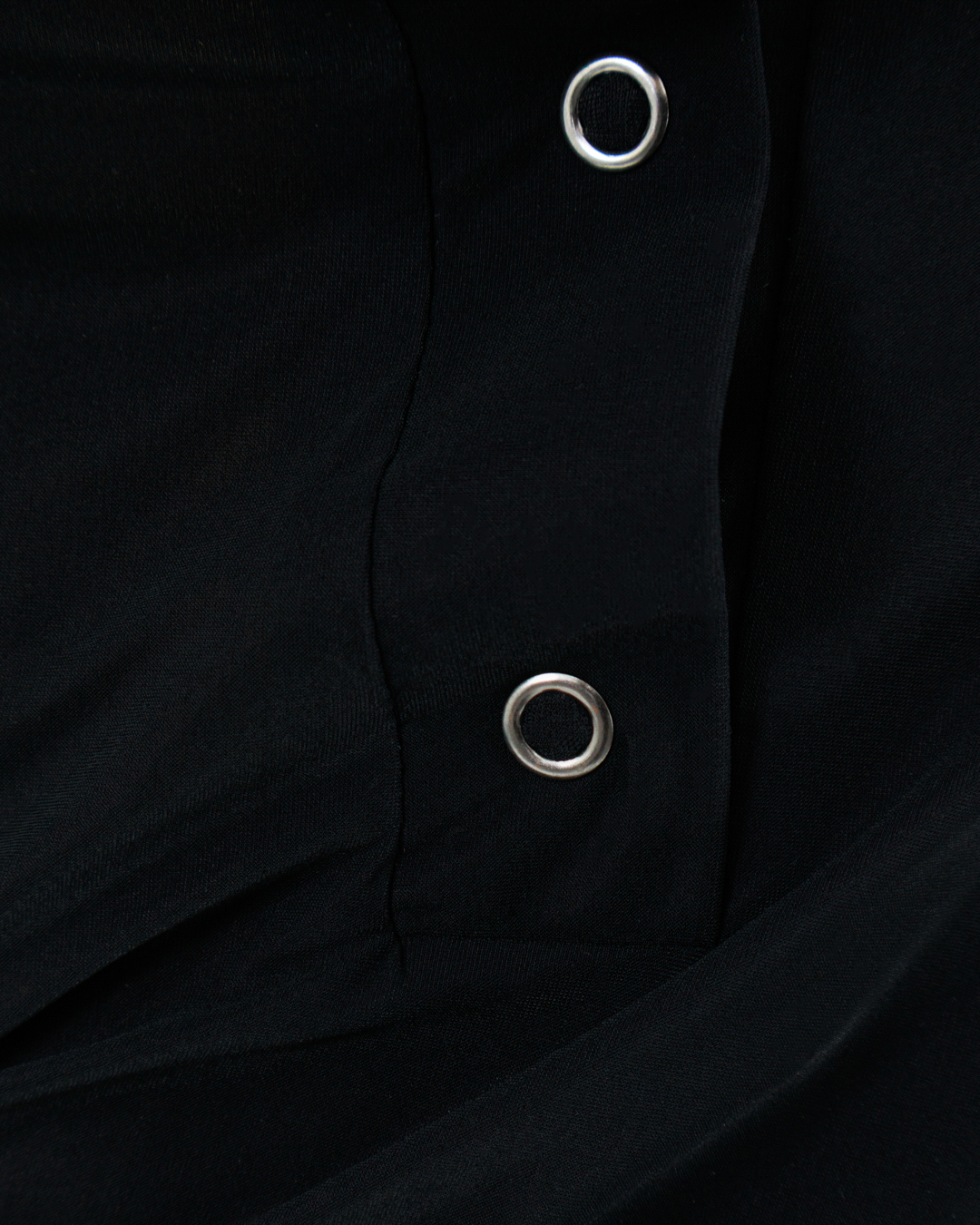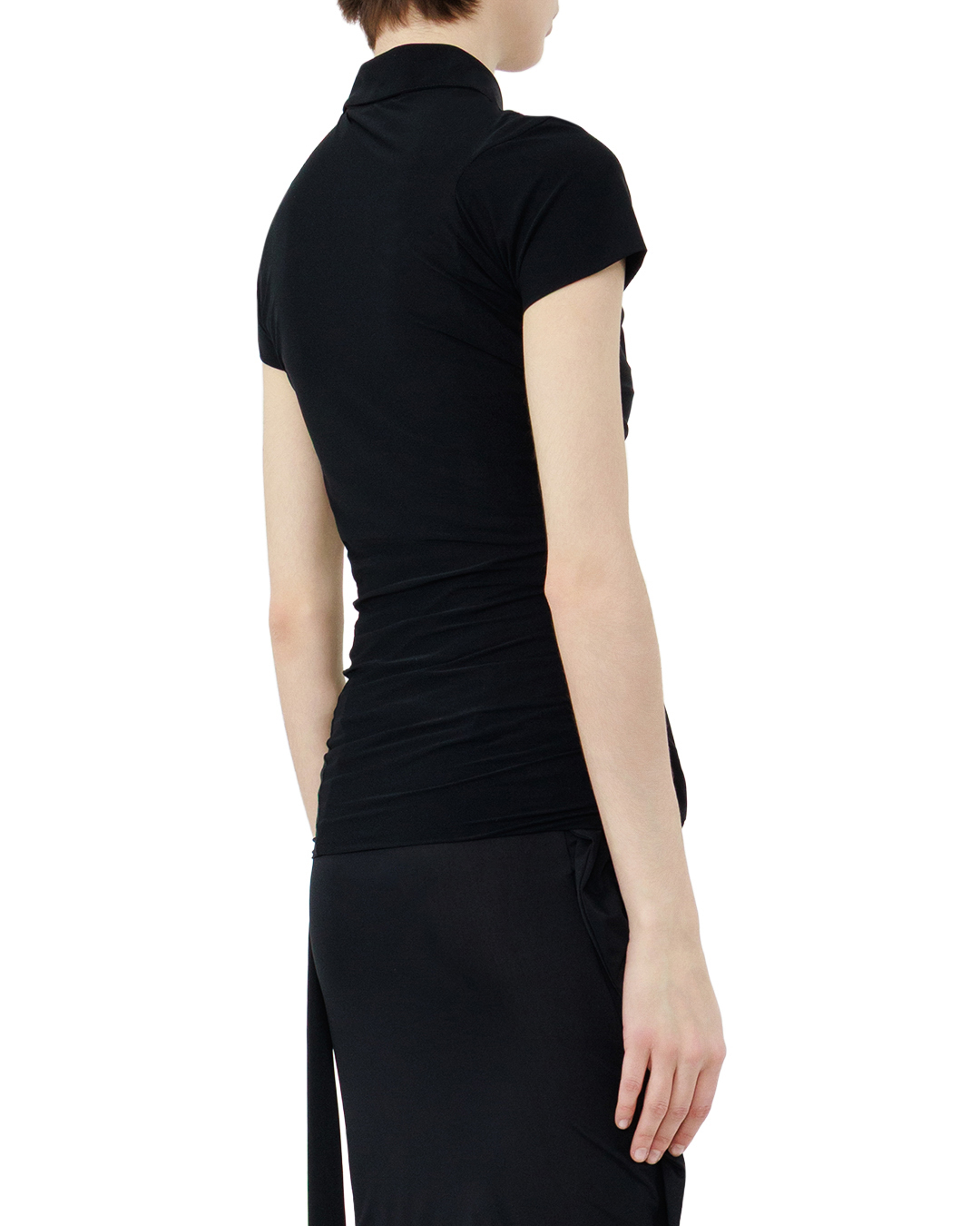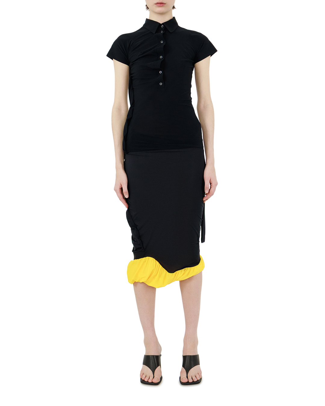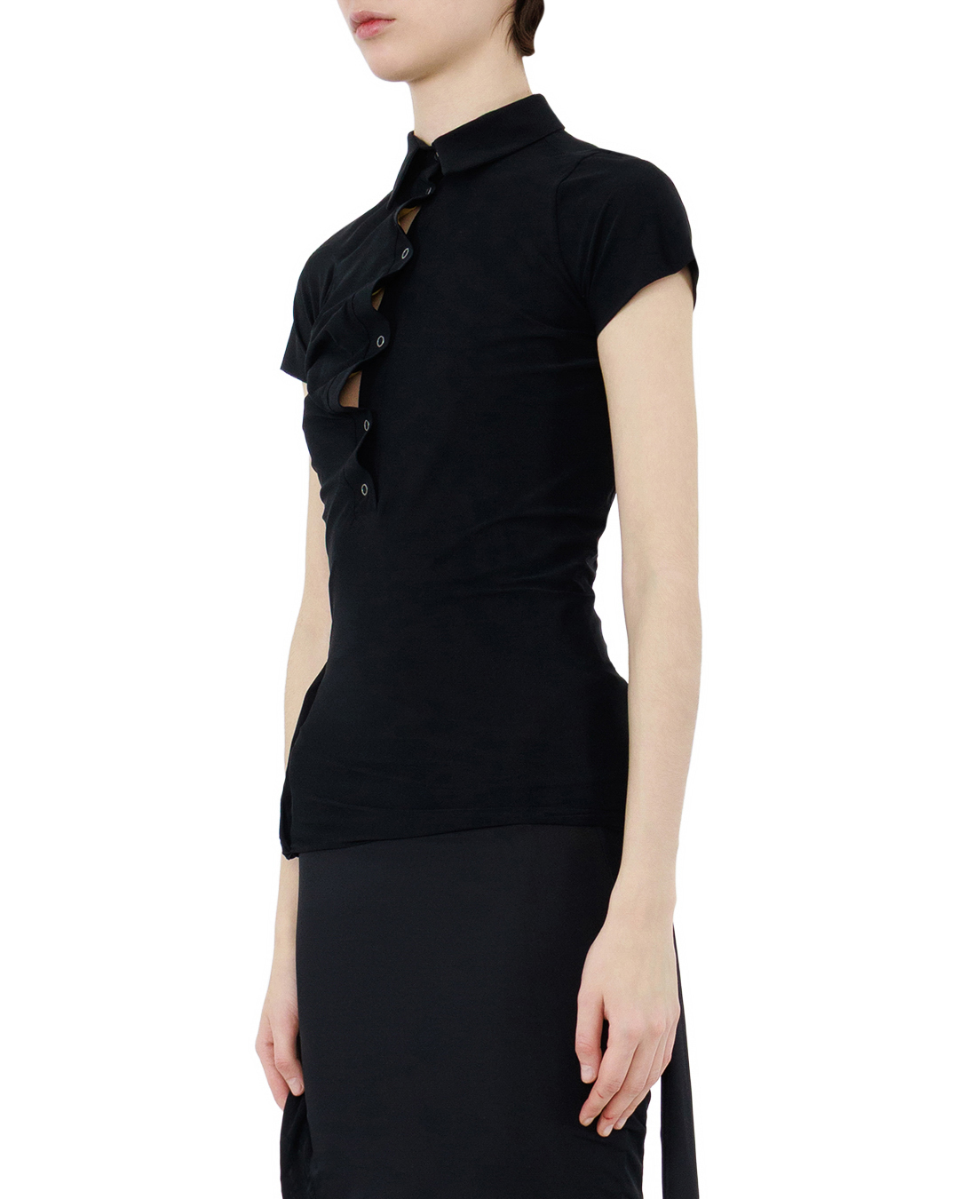 Это поло — воплощение лаконичной элегантности и современного шика. Классический чёрный цвет придаёт модели сдержанную роскошь, а продуманный крой подчёркивает изящество силуэта. Аккуратный отложной воротник с чёткими линиями создаёт ощущение строгой изысканности, плавно переходя в ряд металлических пуговиц, которые служат не только функциональным, но и декоративным элементом. Особенность этой модели — асимметричная драпировка по передней части, которая добавляет динамики и визуального интереса. Складки не просто украшают изделие, но и создают игру объёмов, подчёркивая женственность образа. Короткие рукава лаконичны и практичны, идеально балансируют между формальностью и расслабленностью. Внутренняя подкладка ярко-жёлтого цвета — дерзкий акцент, который оживляет образ и добавляет неожиданности. Этот контрастный элемент виден лишь при поднятом воротнике, создавая эффект «секрета», который делает модель по-настоящему индивидуальной. Низ поло оформлен аккуратным подгибом, что подчёркивает тщательность отделки. Боковые швы выполнены с ювелирной точностью — отсутствие неровностей и торчащих нитей говорит о премиальном качестве исполнения. Это поло идеально сочетает в себе классику и современные тренды, становясь тем самым предметом гардероба, который легко трансформирует любой образ — от повседневного до полуформального. Оно подчёркивает уверенность и вкус своей обладательницы, оставаясь при этом универсальным и стильным решением.