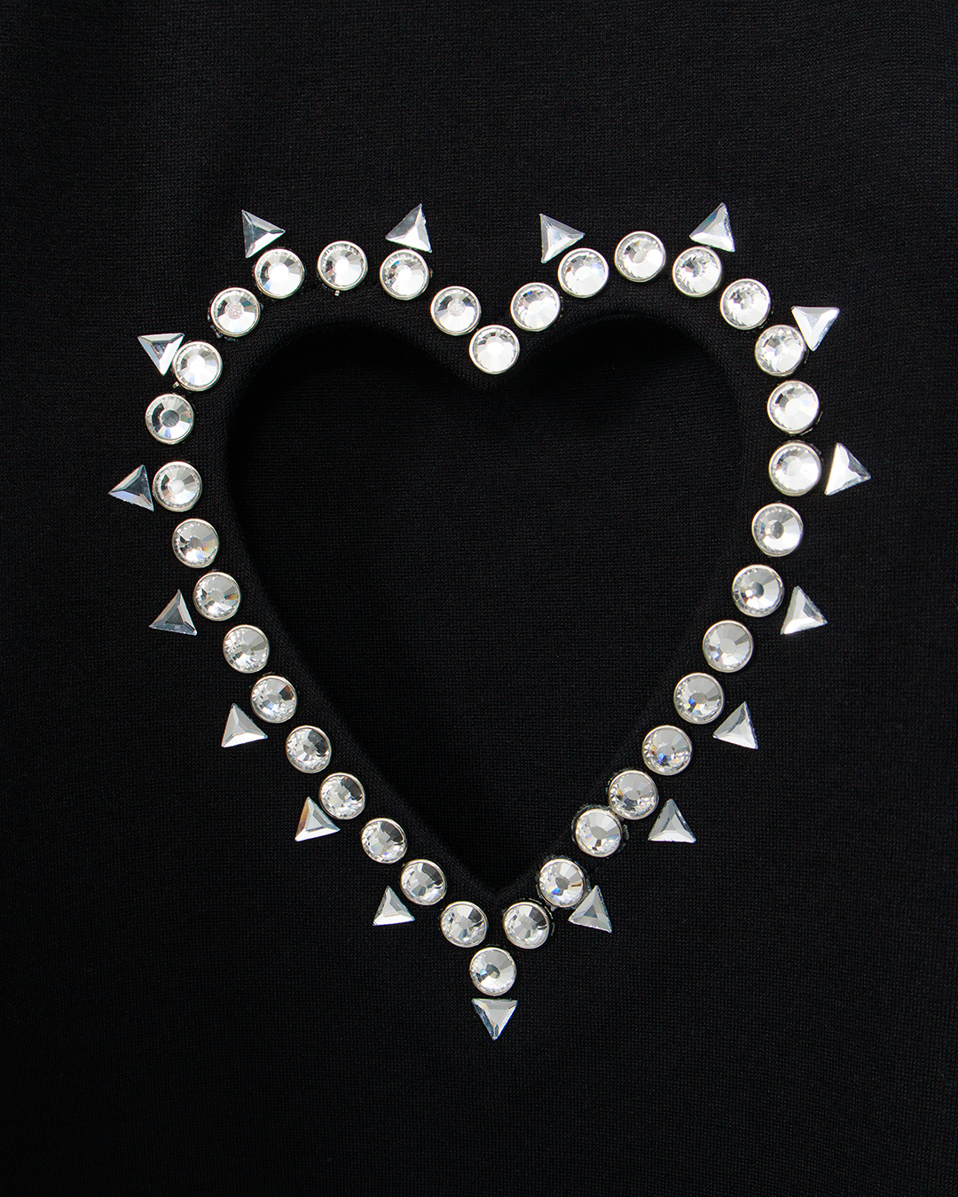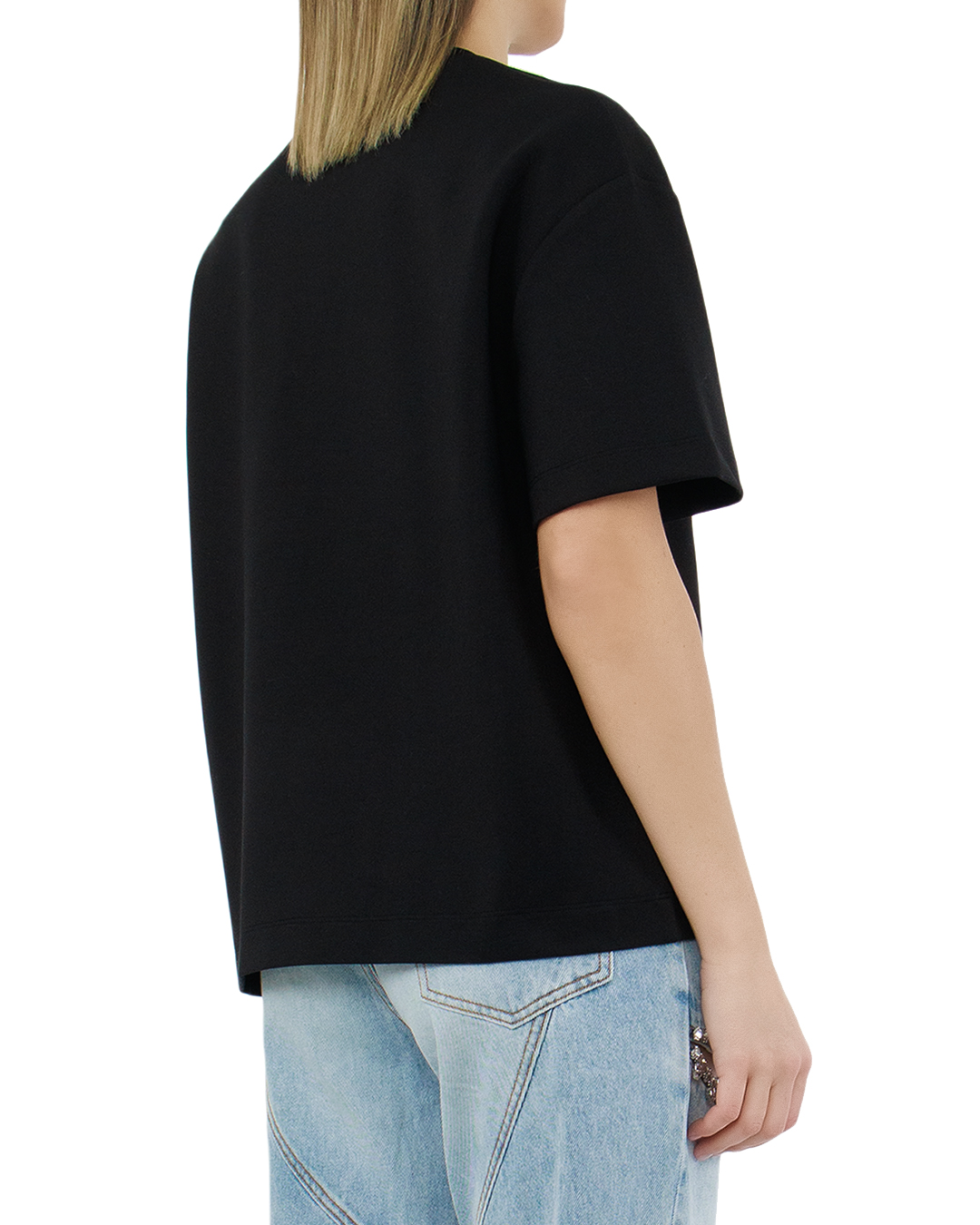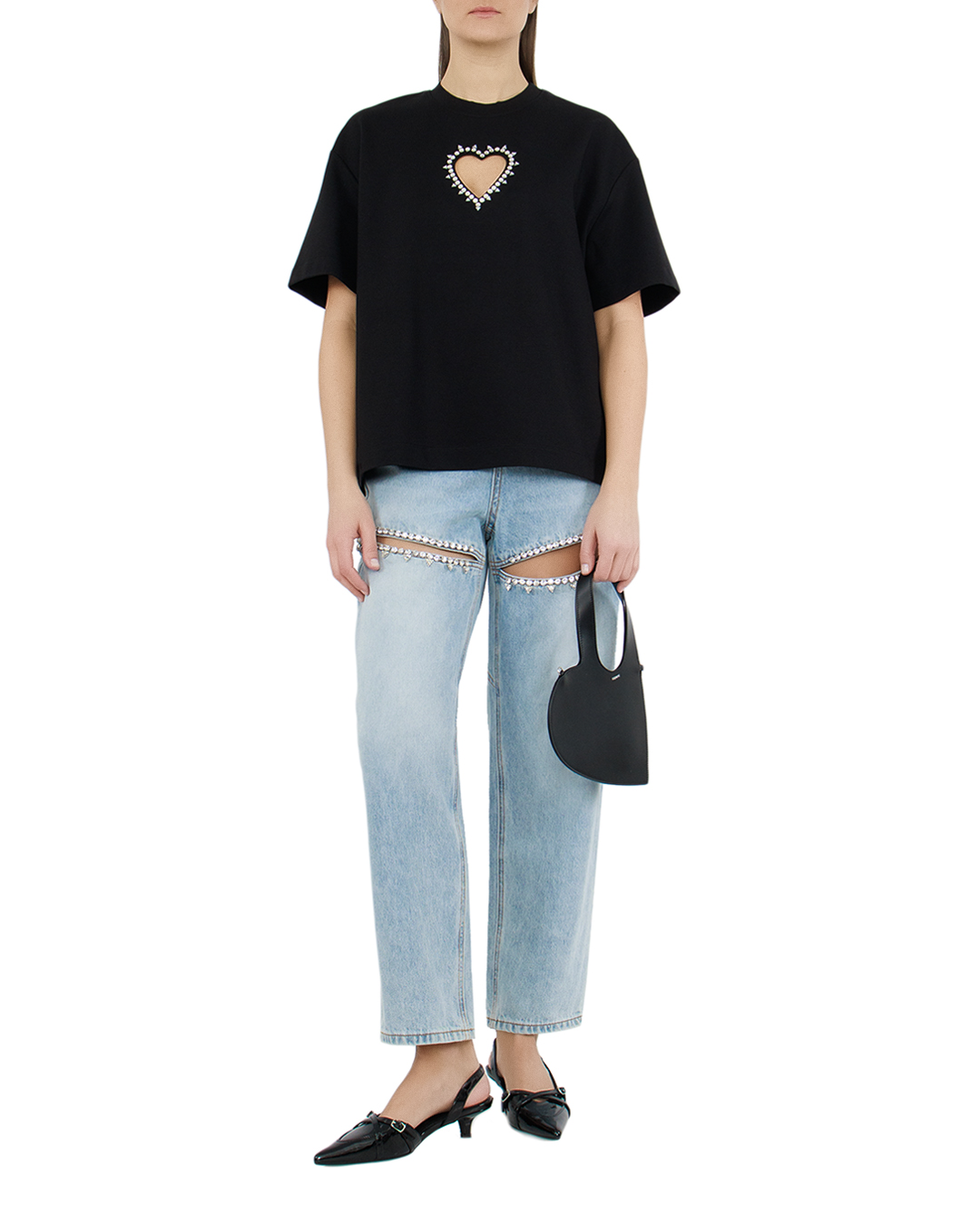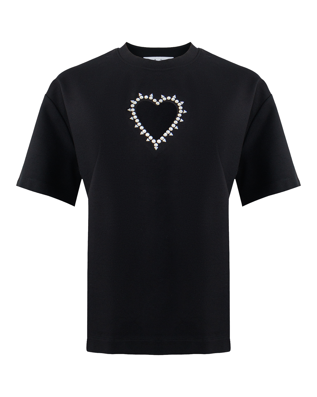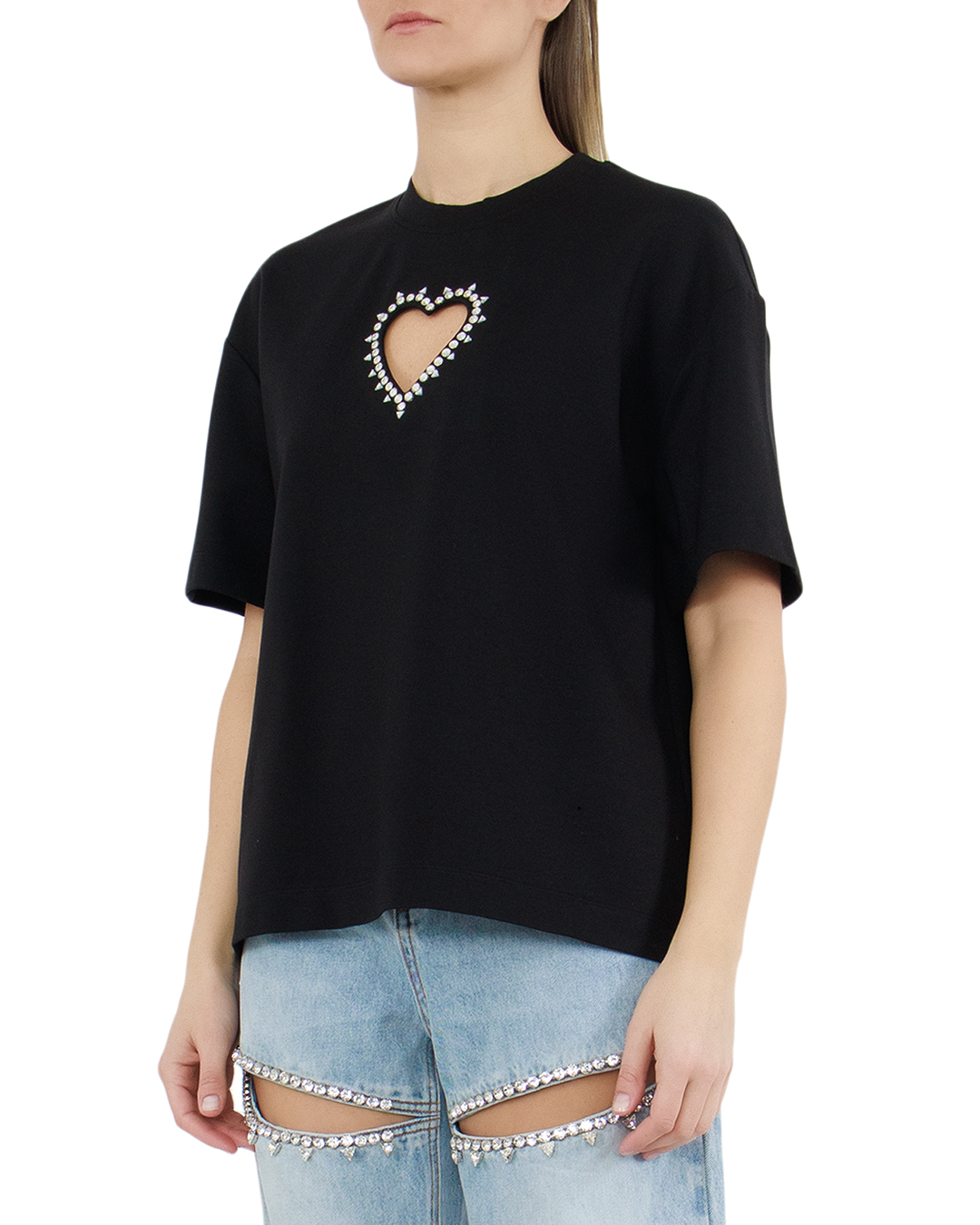 Футболку силуэта oversize сшили из стрейчевого вискозного трикотажа с добавлением нейлона. Фигурный вырез в виде сердца спереди подчеркнули кантом из кристаллов.
