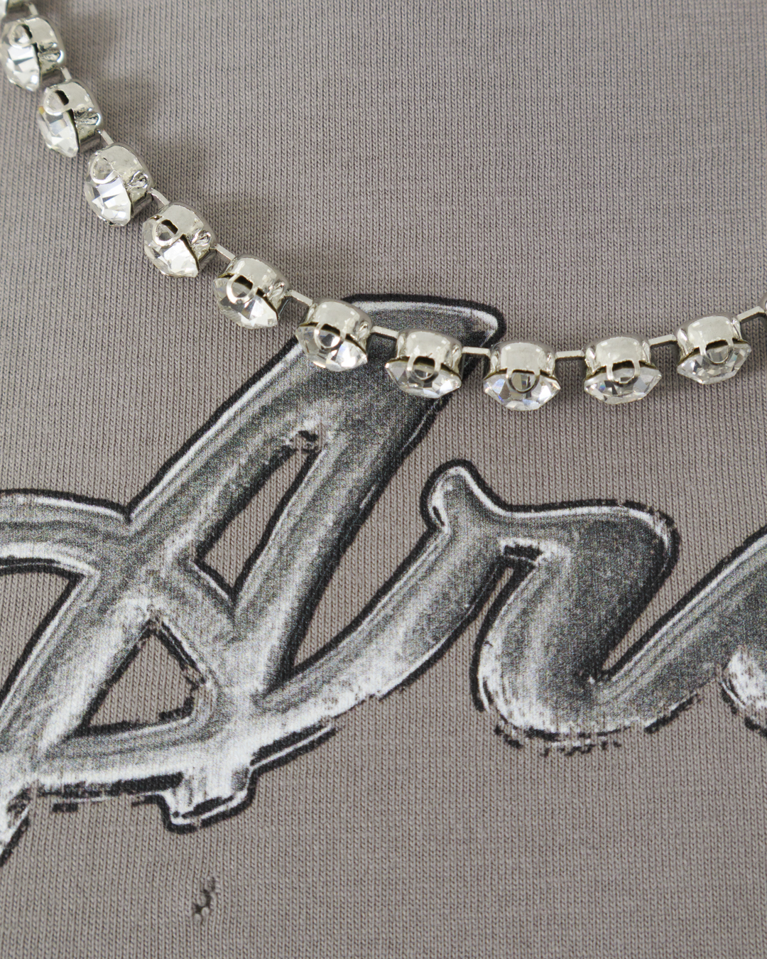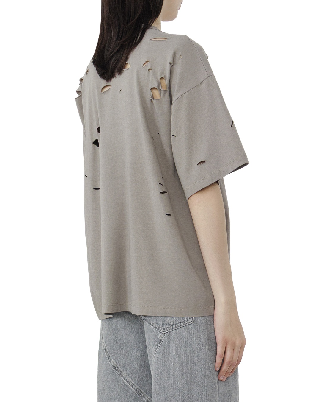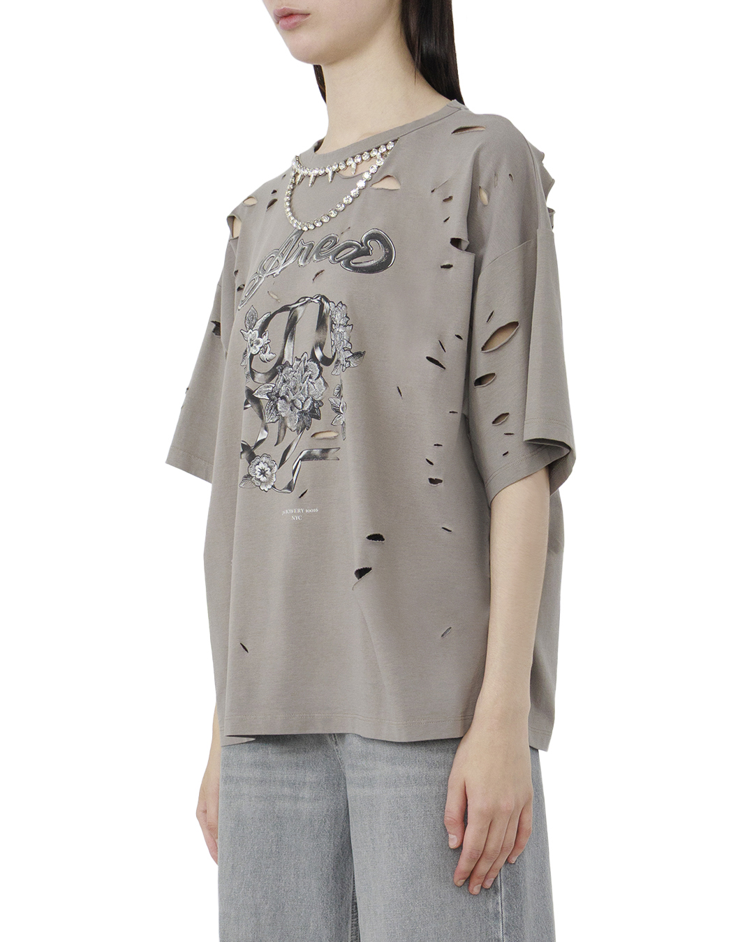 Эта футболка — стильный образец современного уличного шика, сочетающий комфорт и выразительность. Мягкий и приятный на ощупь материал гарантирует удобство и лёгкость носки, идеально подходя для повседневных образов. Деконструированные разрезы по всей поверхности добавляют нотку ребелизма и модной дерзости, создавая динамичный визуальный эффект. Этот элемент носит одновременно декоративный и функциональный характер, задавая непринужденность и стиль. Центральная графическая композиция с изысканной флористической вышивкой добавляет глубину и утонченность. Детализированные элементы создают художественную привлекательность и делают футболку настоящим произведением дизайнерского искусства. Отделка в виде изящной цепочки из бус, имитирующей ожерелье, придаёт шикарный акцент, интегрируя элемент ювелирного декора. Эта футболка идеально сочетается с различными элементами гардероба, добавляя в образ яркость и индивидуальность.