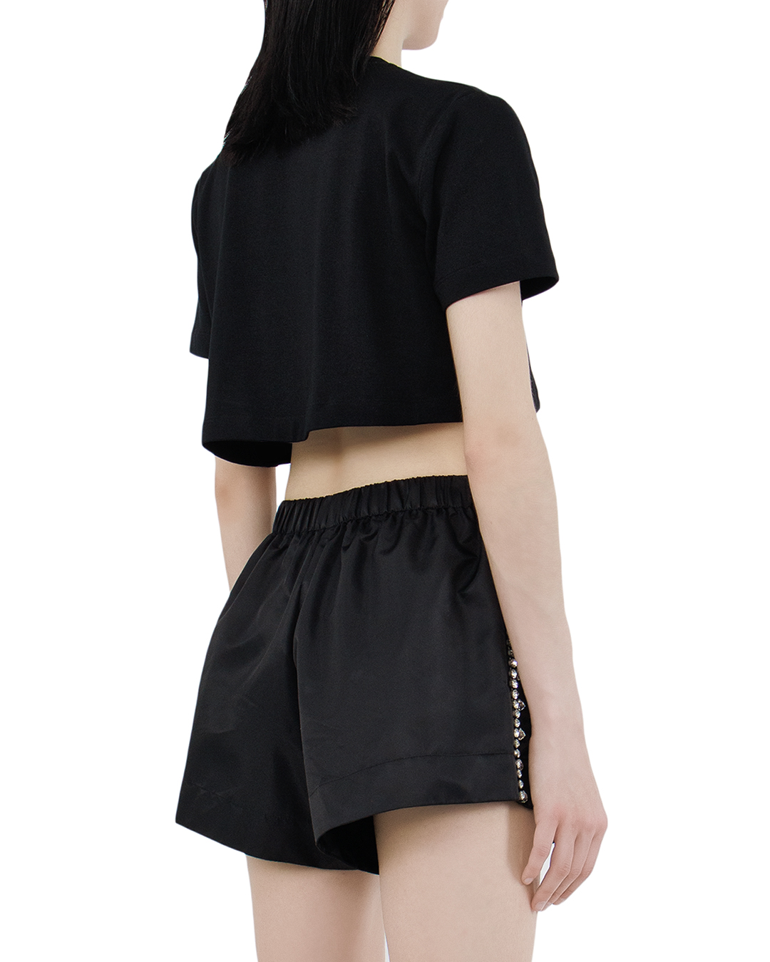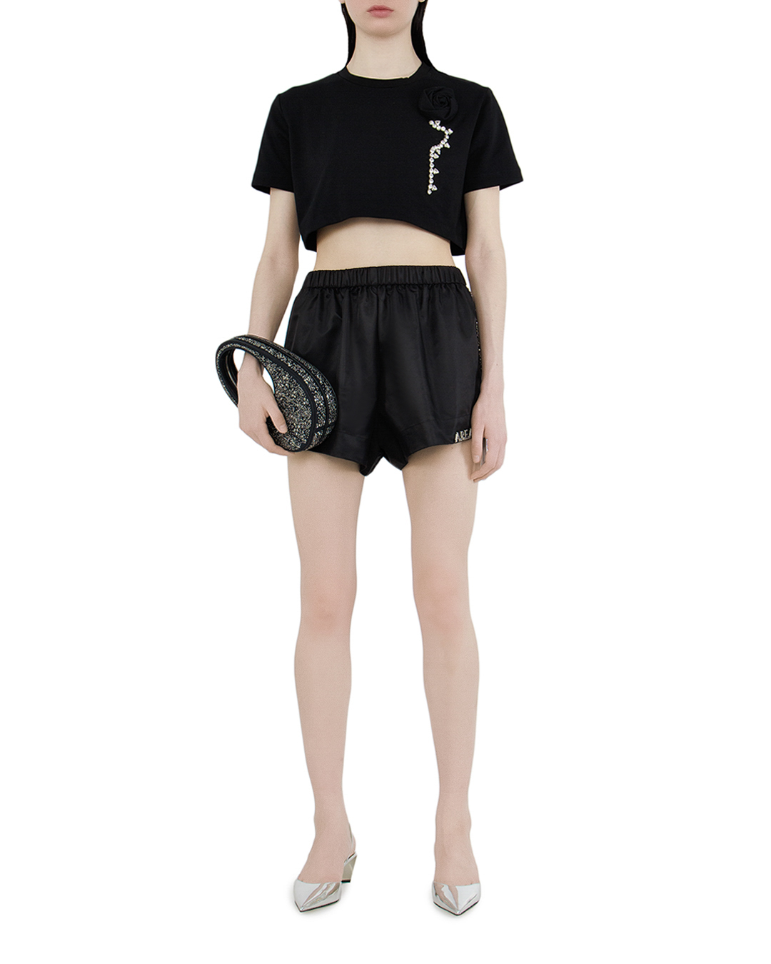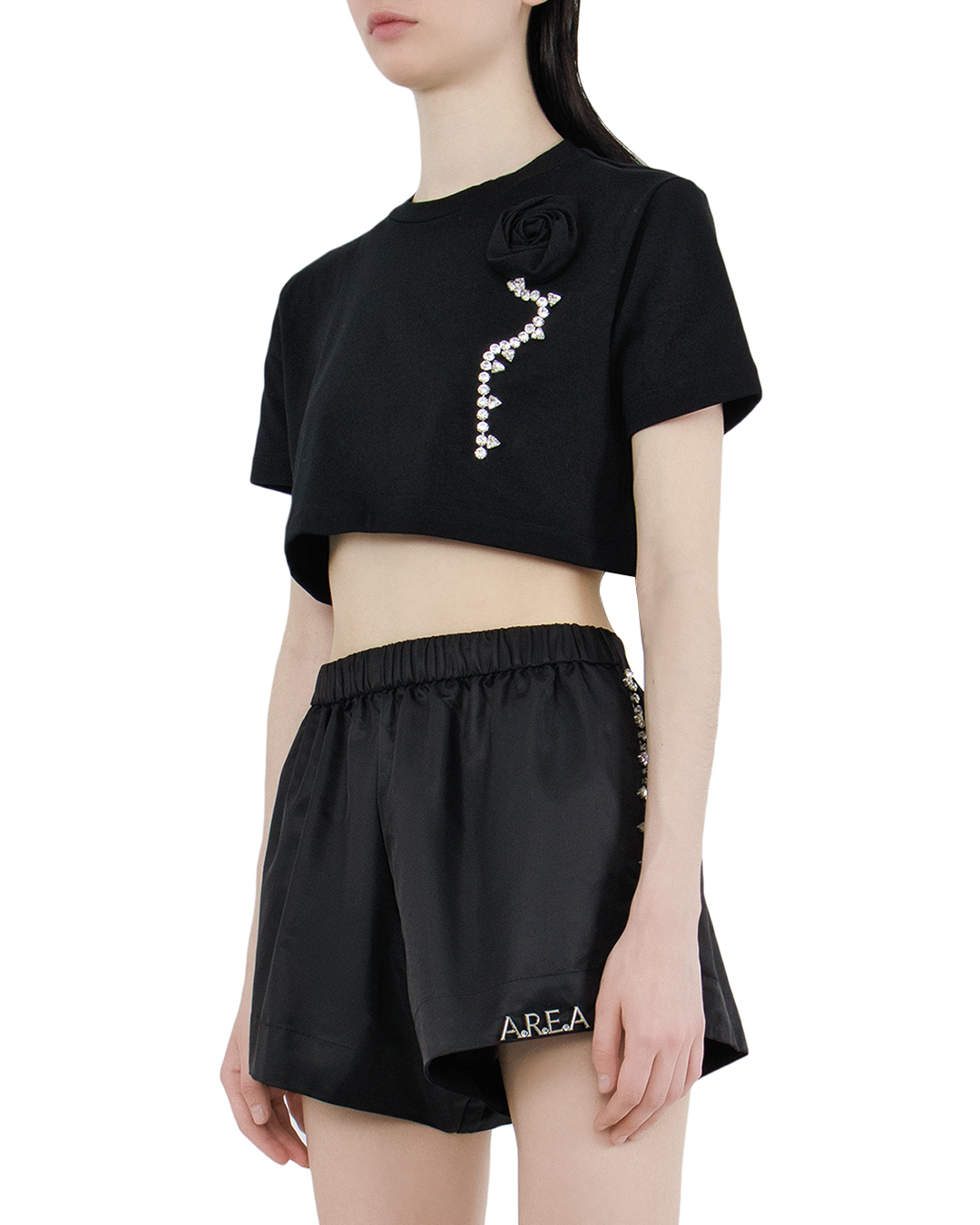 Укороченная футболка свободного кроя — идеальный выбор для тех, кто ценит комфорт и стиль. Изготовленная из мягкого и приятного на ощупь материала, она обеспечивает отличную вентиляцию и свободу движений, что делает её идеальной для повседневной носки или активного отдыха. Уникальная отделка из кристаллов придает футболке элегантный блеск, а декоративная роза добавляет романтичности и оригинальности. Эти детали делают модель не только привлекательной, но и по-настоящему уникальной, позволяя вам выделяться из толпы. Доступная в классическом черном цвете, эта футболка легко комбинируется с различными низами — от джинсов до юбок. Она станет универсальным элементом вашего гардероба, позволяя создавать как повседневные, так и более нарядные образы. Добавьте эту стильную футболку в свой арсенал модных вещей и подчеркните свою индивидуальность!