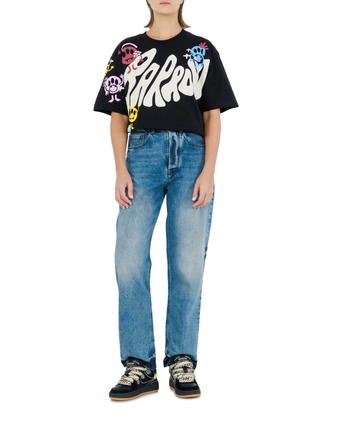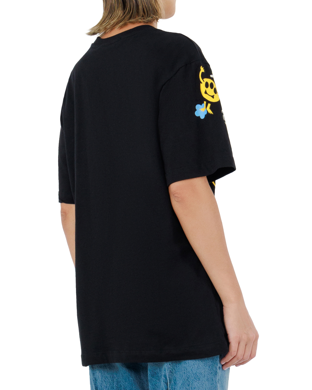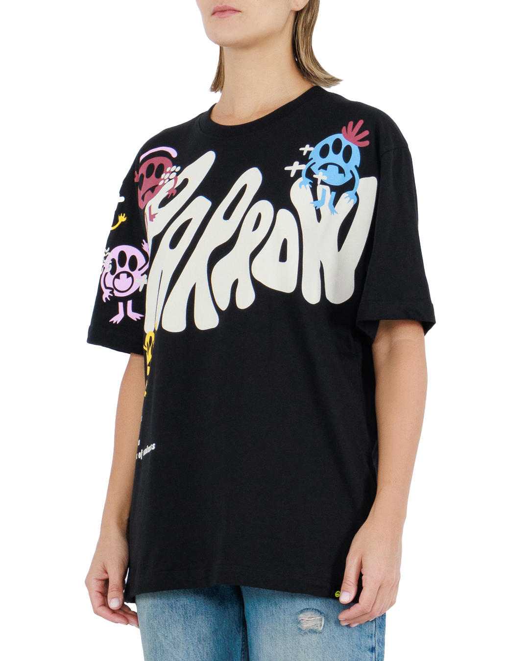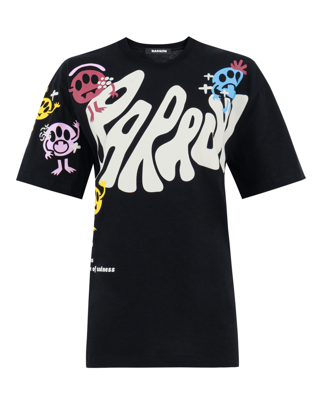 Футболка из хлопка с круглым вырезом. Модель прямого кроя. Спереди по линии груди и плеч нанесена печать в виде надписи и эмодзи.