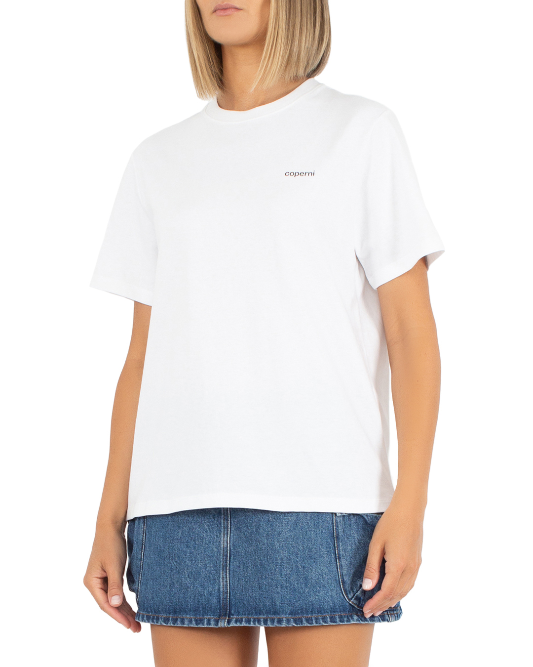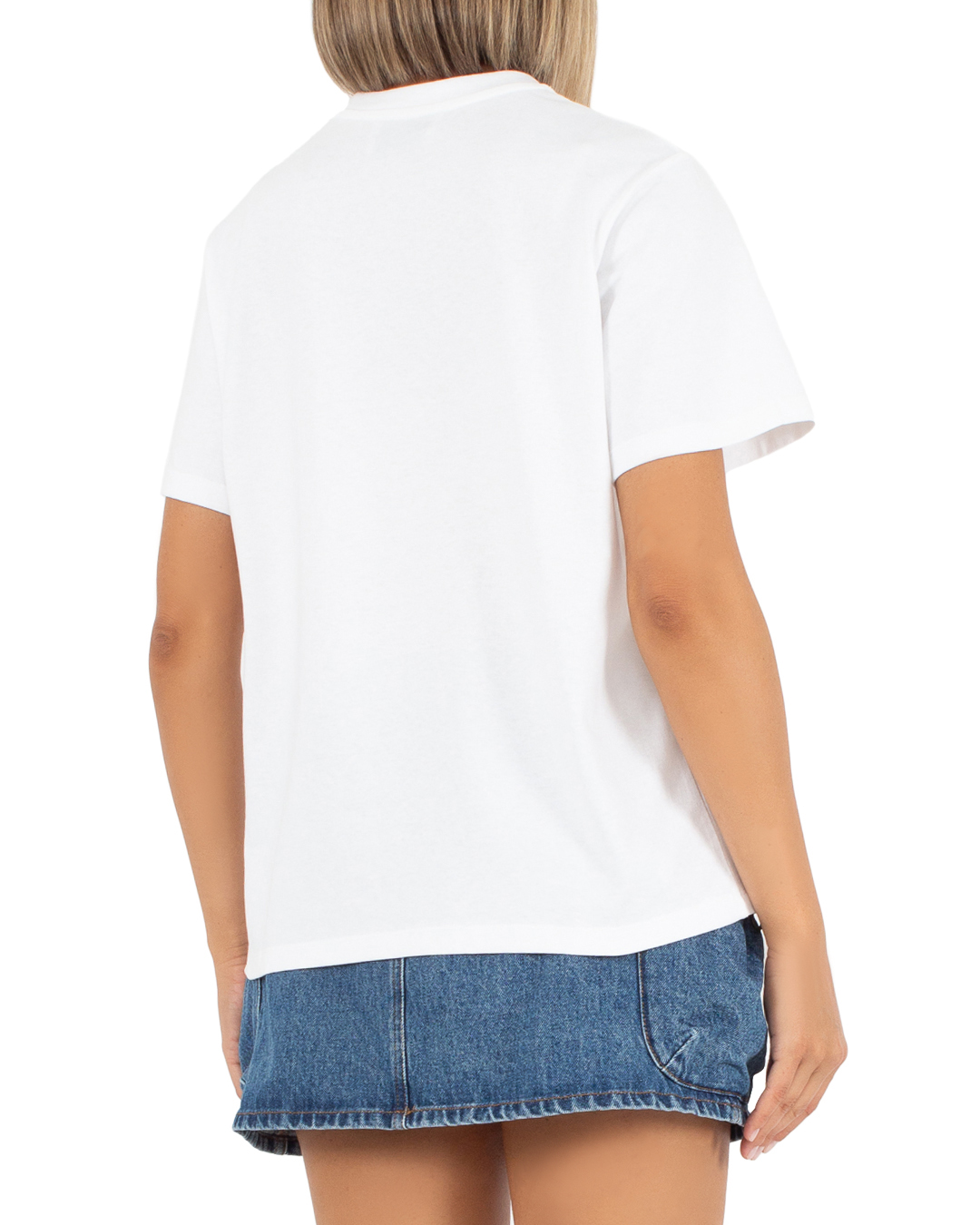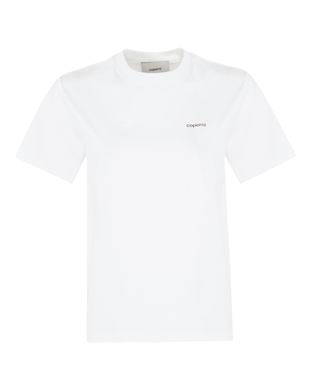 Футболка в белом цвете из хлопка украшена контрастным принтом в виде логотипа бренда на груди. Такая модель идеальна для того, чтобы разнообразить базовый гардероб.