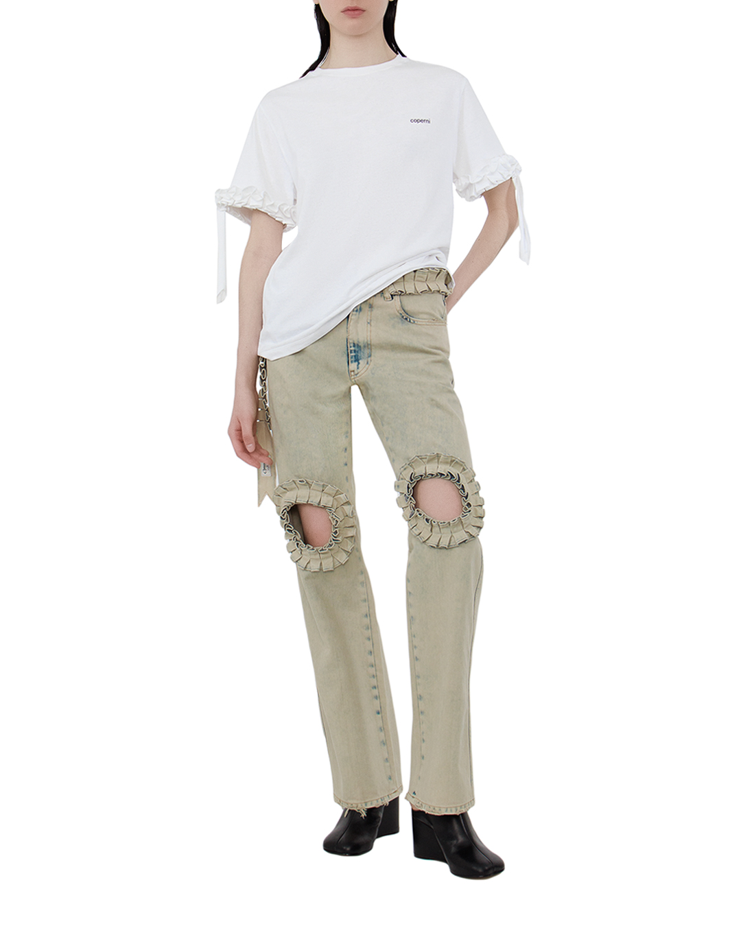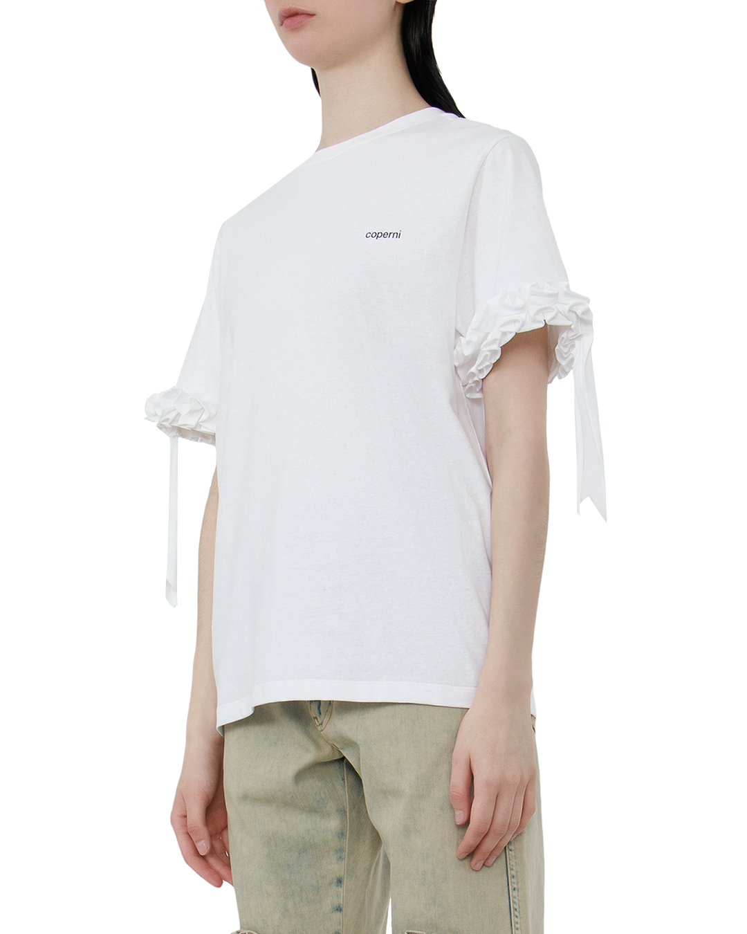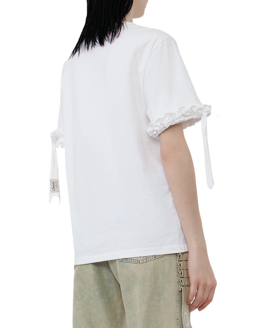 Эта базовая футболка станет стильным акцентом в вашем гардеробе, сочетая комфорт и модные детали. Изготовленная из высококачественного хлопка, она обеспечивает приятные ощущения на коже и отличную воздухопроницаемость, что делает её идеальной для повседневной носки. Футболка представлена в классическом белом цвете, который легко комбинируется с различными предметами одежды. Контрастный принт в виде логотипа бренда на груди придает ей яркий и запоминающийся вид, подчеркивая вашу индивидуальность и стиль. Прямой силуэт оверсайз создает расслабленный образ, позволяя свободно двигаться. Однако особую изюминку этой модели придают отделка лентой и рюшами на рукавах, которые добавляют нотку романтики и игривости. Эти детали делают футболку уникальной и позволяют выделиться из толпы. Эта базовая футболка отлично сочетается как с джинсами и шортами для создания непринужденного образа, так и с юбками или брюками для более нарядных выходов. Она станет универсальным элементом вашего гардероба, позволяя вам экспериментировать со стилем и создавать разнообразные образы на каждый день. Добавьте эту футболку в свою коллекцию для свежего взгляда на классическую одежду!