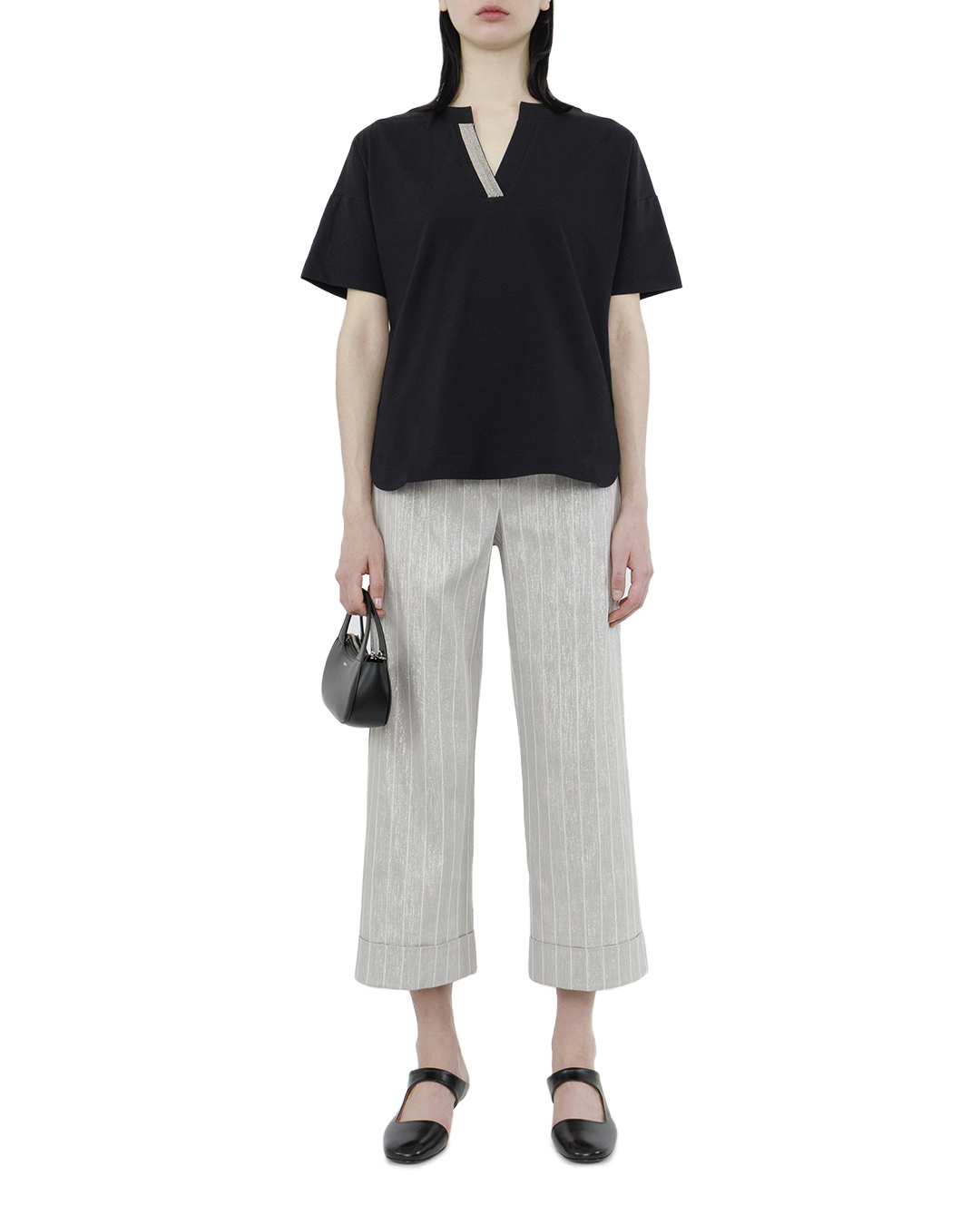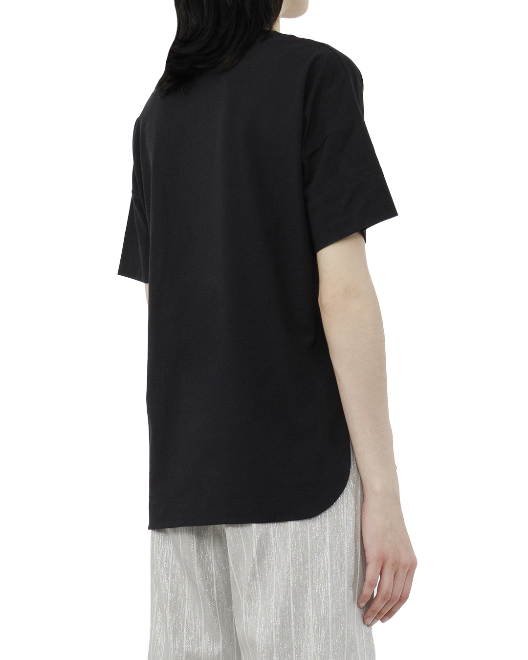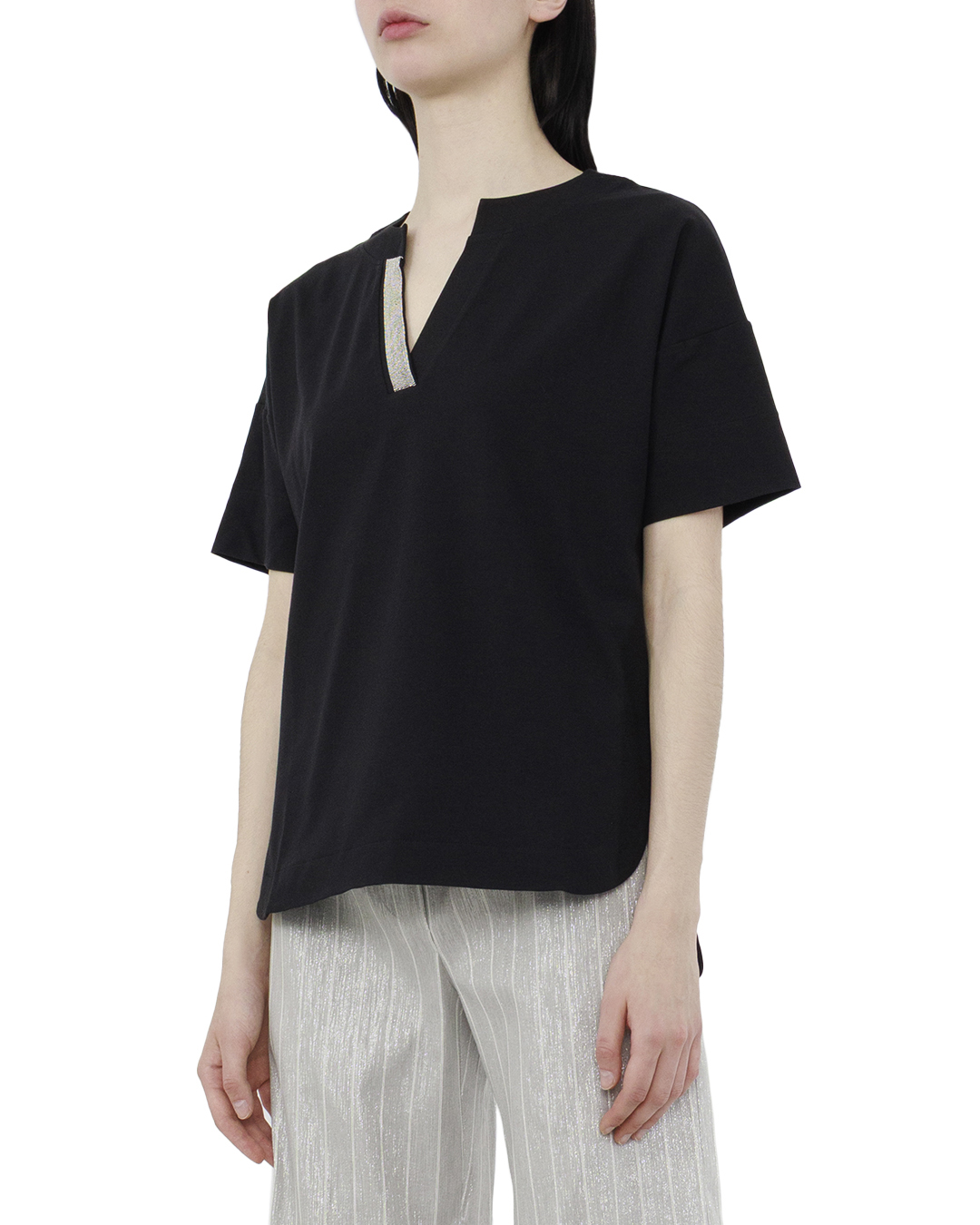 Футболка выполнена из высококачественного хлопка, что обеспечивает максимальный комфорт и воздухопроницаемость. Прямой силуэт делает ее универсальным элементом гардероба, подходящим для создания как повседневных, так и более нарядных образов. Футболка оснащена элегантным V-образным вырезом, который подчеркивает линию шеи и придает образу женственность. Особую изюминку добавляет отделка на правой планке воротника из металлической нити, которая создает эффектный контраст и привлекает внимание. Черный цвет делает эту футболку легко сочетать с различными предметами одежды: она отлично подойдет как к джинсам, так и к юбкам или брюкам. Эта модель станет отличным дополнением вашего гардероба и поможет создать стильные образы на любой случай!