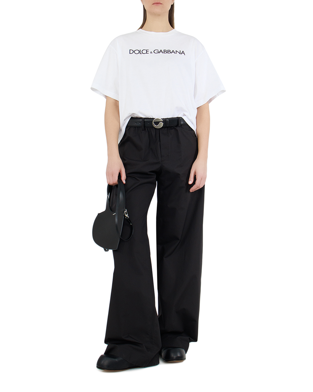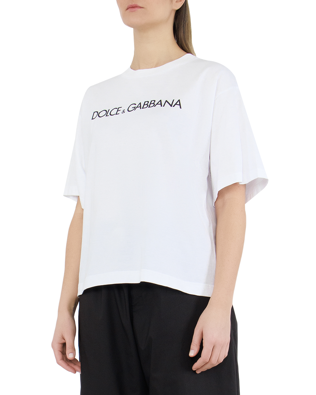 Эта футболка от Dolce & Gabbana является идеальным воплощением итальянского шика и минималистической элегантности. Изготовленная из высококачественного хлопка, она обеспечивает комфорт и долговечность, оставаясь при этом легкой и воздухопроницаемой.  Классический белый цвет подчеркивает универсальность и свежесть, делая футболку легко комбинируемой с другими элементами гардероба. Свободный и непринужденный крой добавляет современности и обеспечивает комфорт, подчеркивая стильный силуэт.  Визитной карточкой модели является логотип Dolce & Gabbana, деликатно размещенный на груди. Контрастный текст добавляет визуального интереса и демонстрирует изысканный вкус, выступая в качестве стильного акцента.  Основные швы выполнены с особой тщательностью, что подчеркивает мастерство и внимание к деталям, характерные для люксовых брендов. Эта футболка — символ стильной уверенности и итальянского наследия, подходящий для ценителей качественной моды.