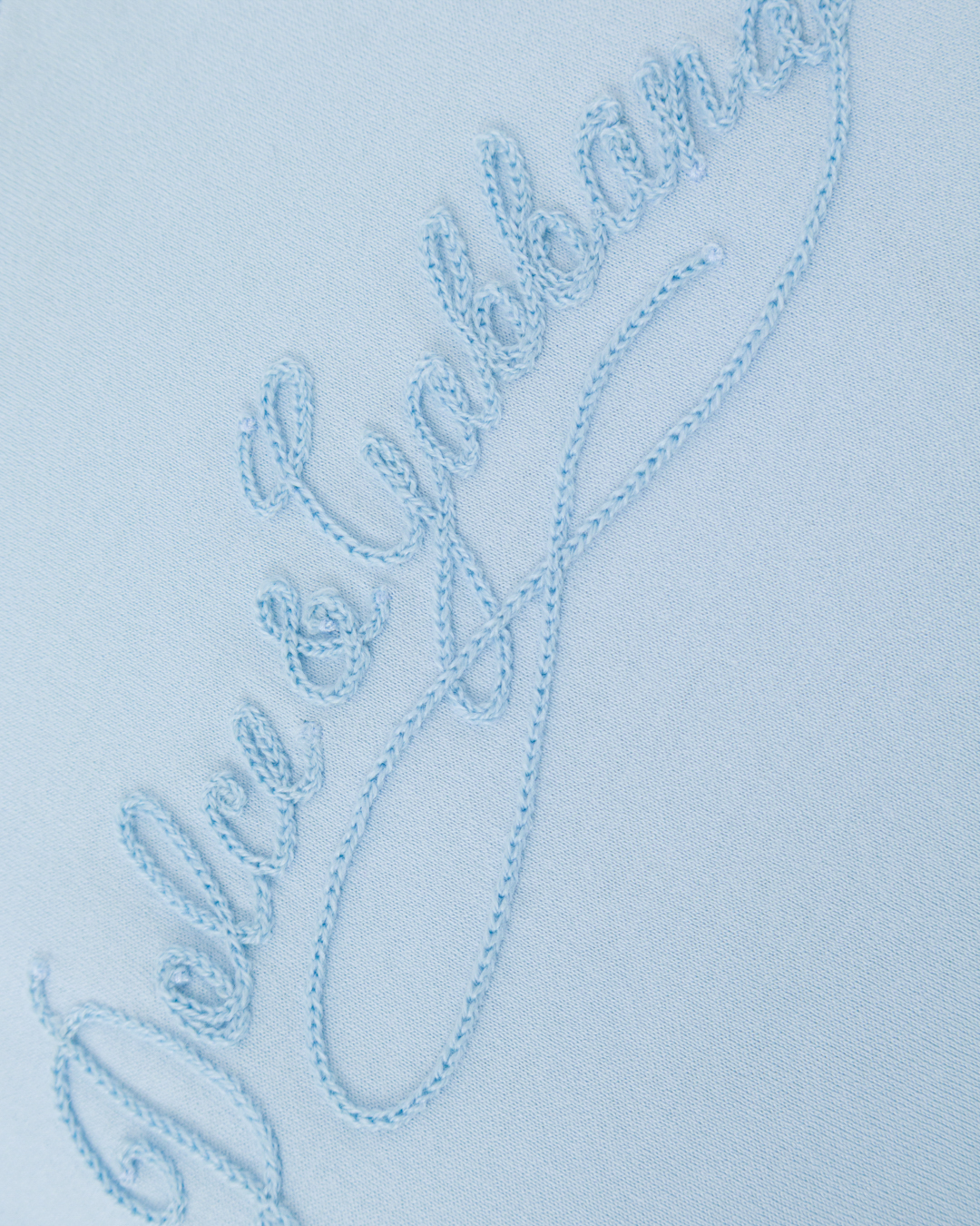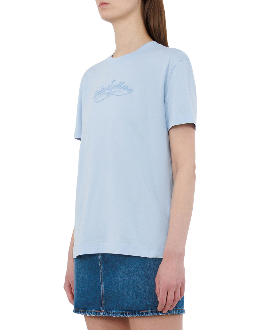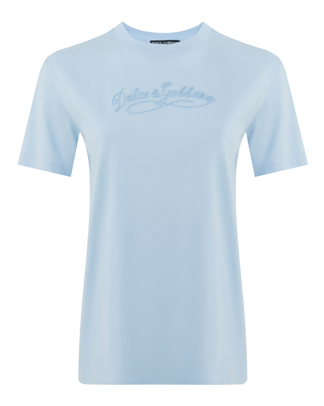 Эта футболка — образец утончённой простоты. Нежный небесно-голубой оттенок создаёт ощущение лёгкости и свежести. Силуэт лаконичный, с аккуратным круглым воротом, подчёркивающим элегантность кроя. Рукава обработаны ровными подгибами, что добавляет изделию опрятности. Центральный декоративный элемент в виде изящной надписи придаёт модели индивидуальность, не перегружая дизайн. Мягкая фактура и сбалансированные пропорции делают футболку универсальной для создания лёгких, воздушных образов.