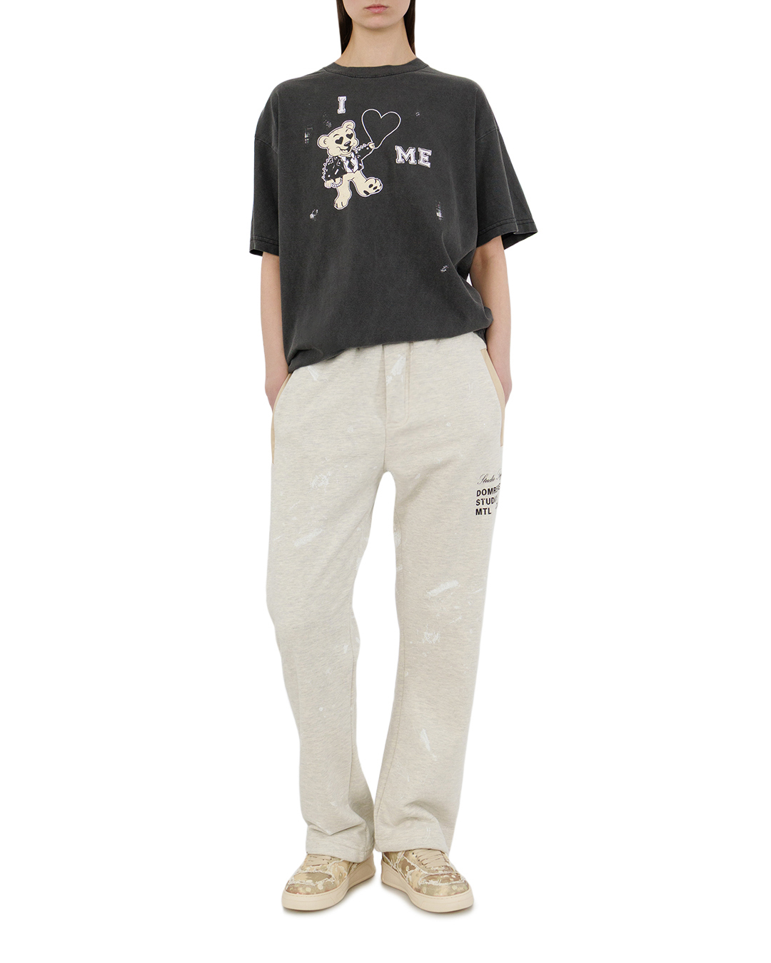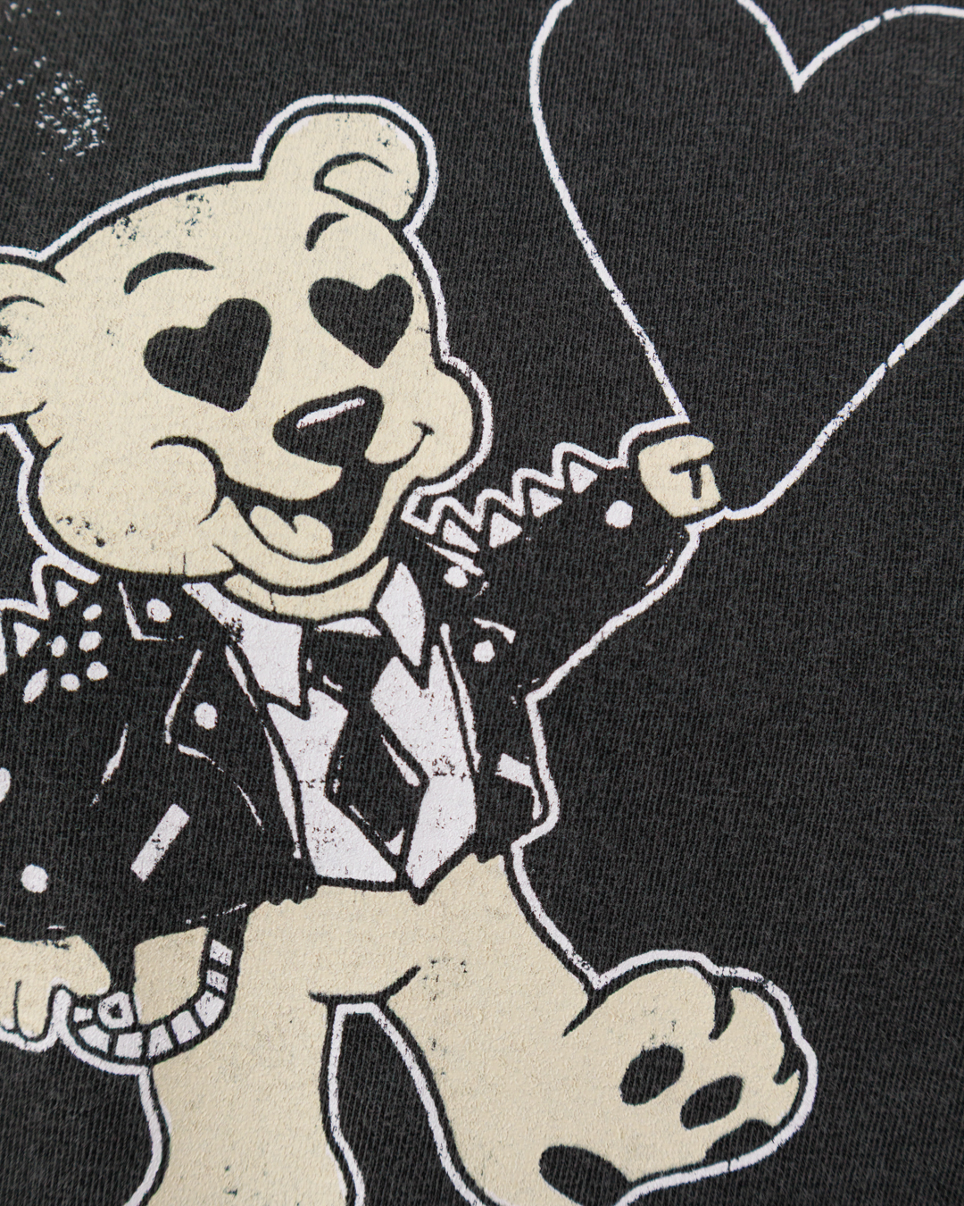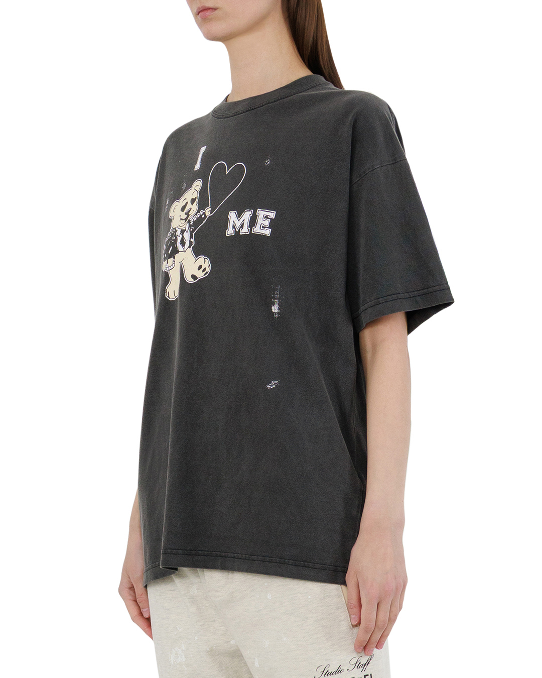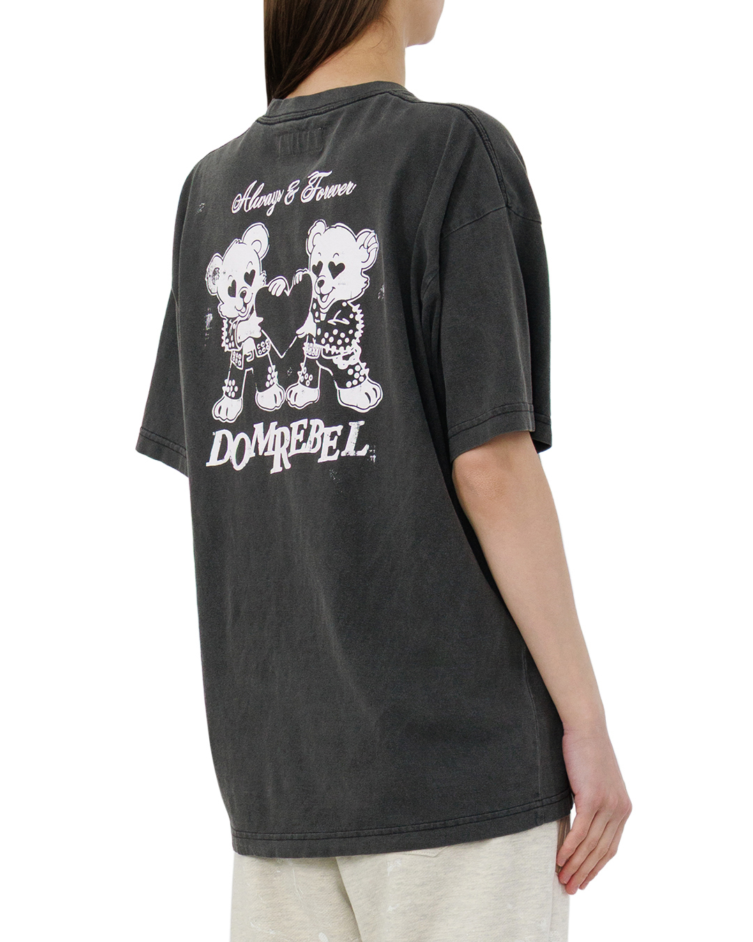 Эта футболка — воплощение игривой самоуверенности. Тёмный, слегка выгоревший оттенок создаёт эффект винтажной небрежности, а свободный крой подчёркивает расслабленность образа. Центральный принт с медвежонком в стильной куртке и с сердцем в лапе добавляет нотку озорства и индивидуальности. Графичные элементы и надпись гармонично вписаны в композицию, не перегружая дизайн. Аккуратные подгибы на рукавах и подоле, ровные швы и продуманная посадка делают модель одновременно выразительной и практичной.