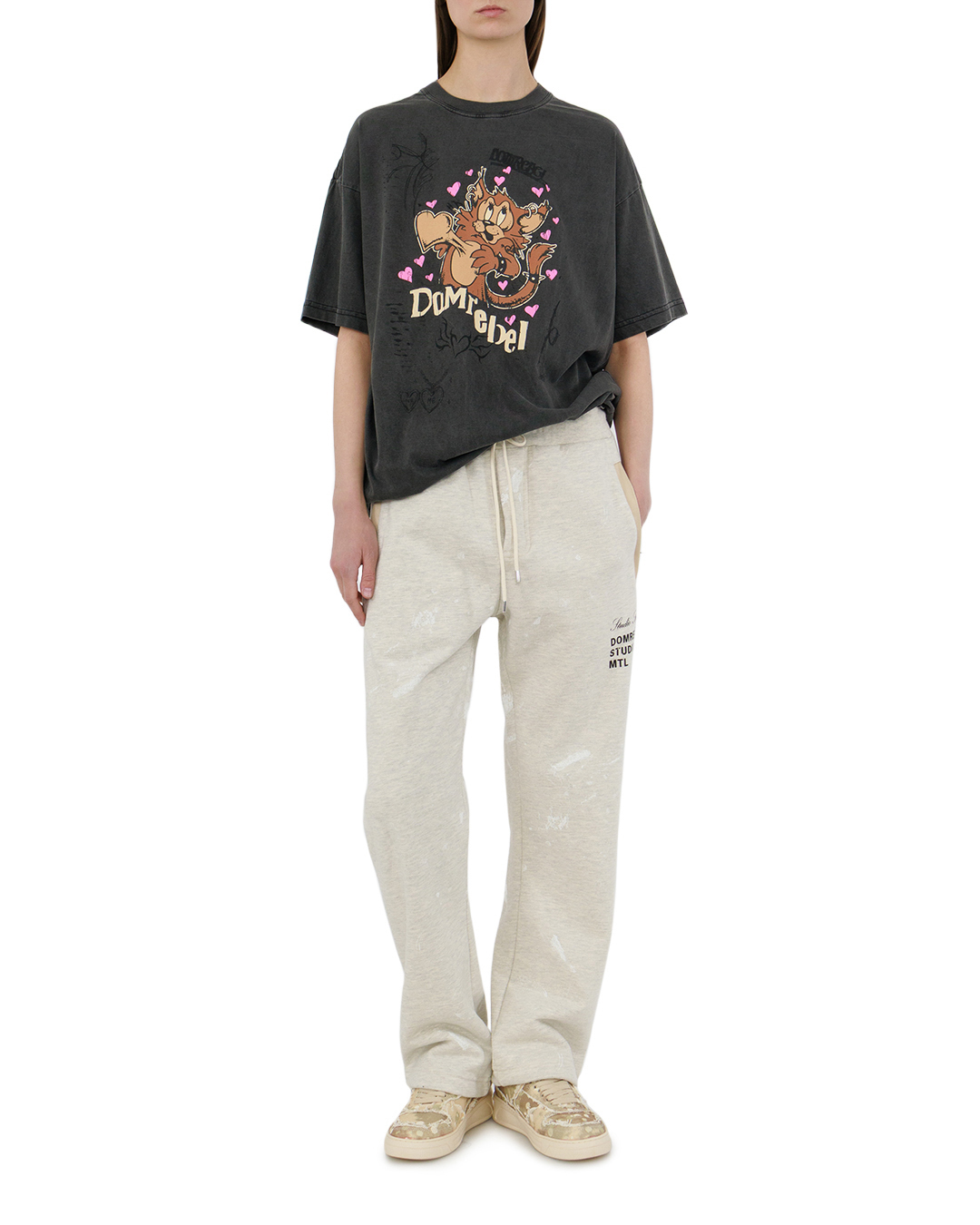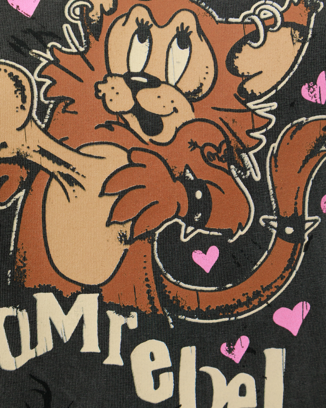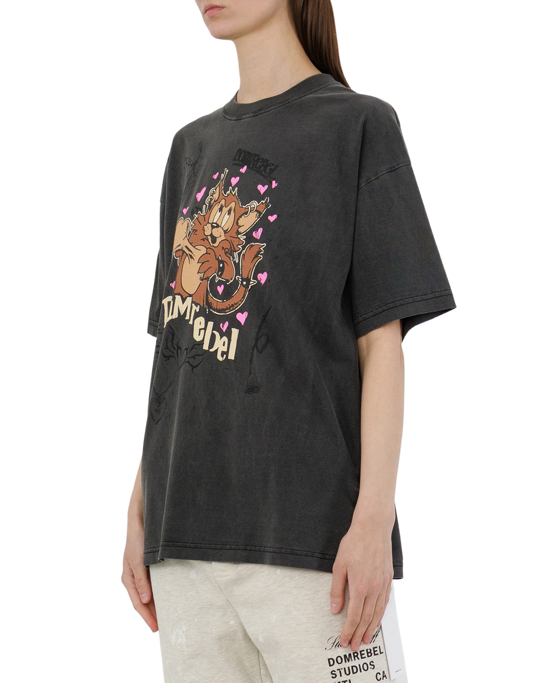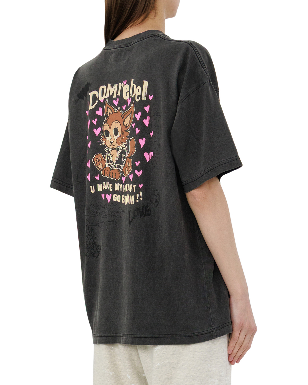 Эта футболка — воплощение дерзкой игривости. Тёмный, слегка выгоревший оттенок полотна создаёт винтажный эффект, а свободный крой подчёркивает расслабленную элегантность. Центральный графический мотив с мультяшным персонажем в динамичной позе задаёт настроение: озорство и харизма считываются в каждой детали — от выразительных глаз до пушистого хвоста. Розовые сердечки вокруг фигуры добавляют контрастную нотку лёгкости, балансируя с общим бунтарским духом модели. Аккуратные подгибы на рукавах и подоле, ровные швы и продуманная посадка делают футболку одновременно выразительной и практичной.